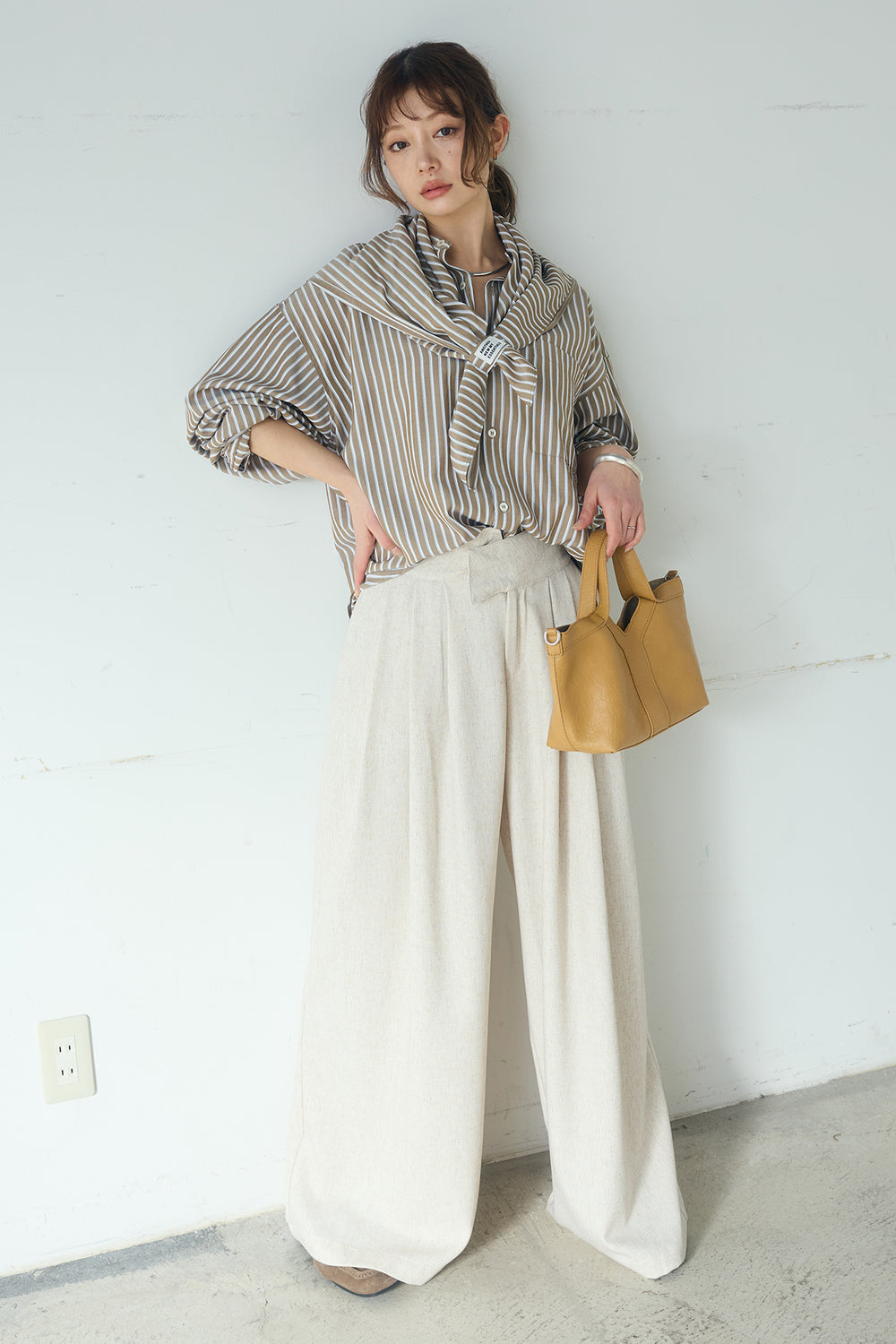 [SET]レーヨンストライプスカーフ+麻混タックワイドパンツ+レーヨンストライプバンドカラー長袖シャツ(3set)