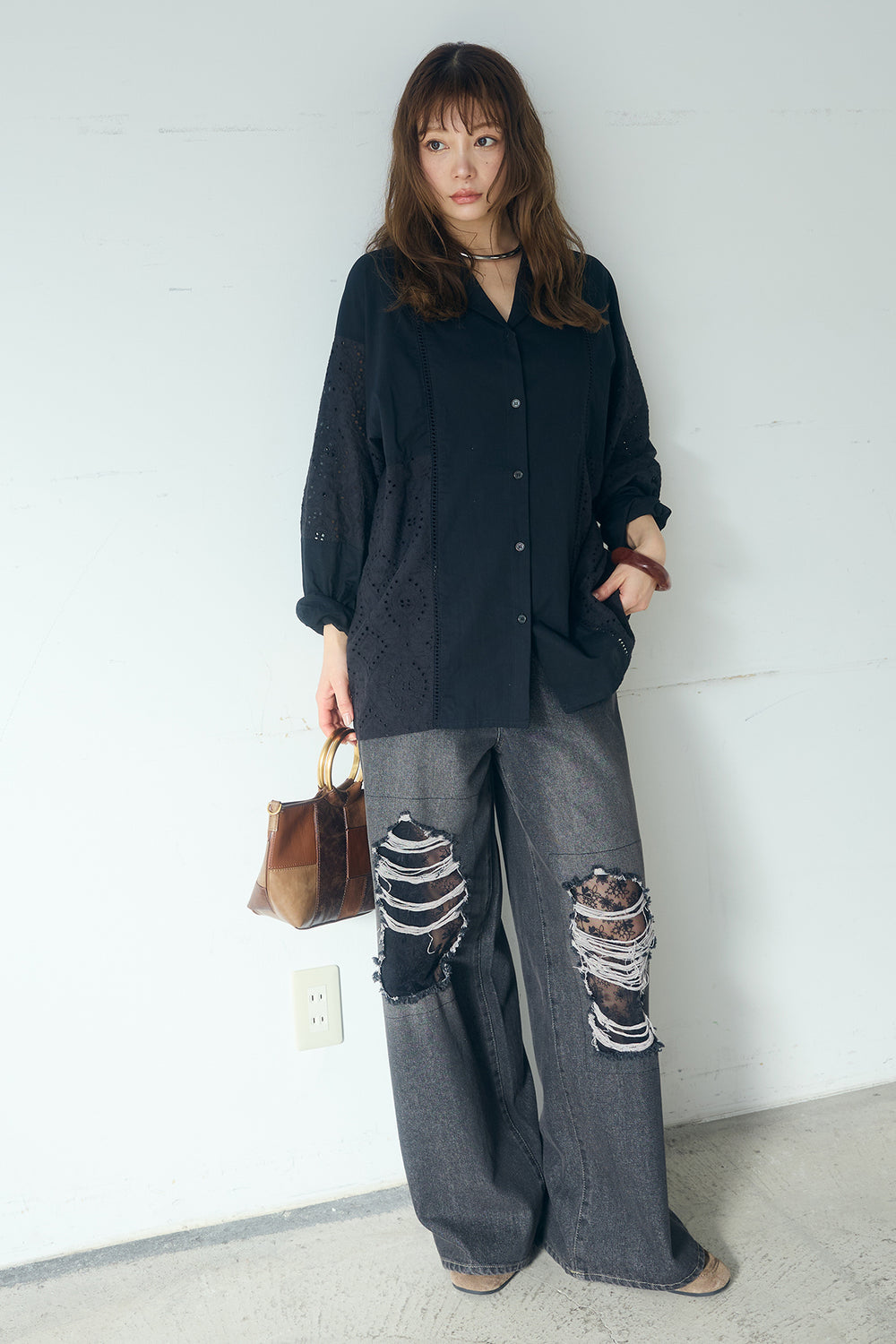 [SET]ローンレースオープンカラーシャツ+デニムレース付きワイドパンツ(2set)