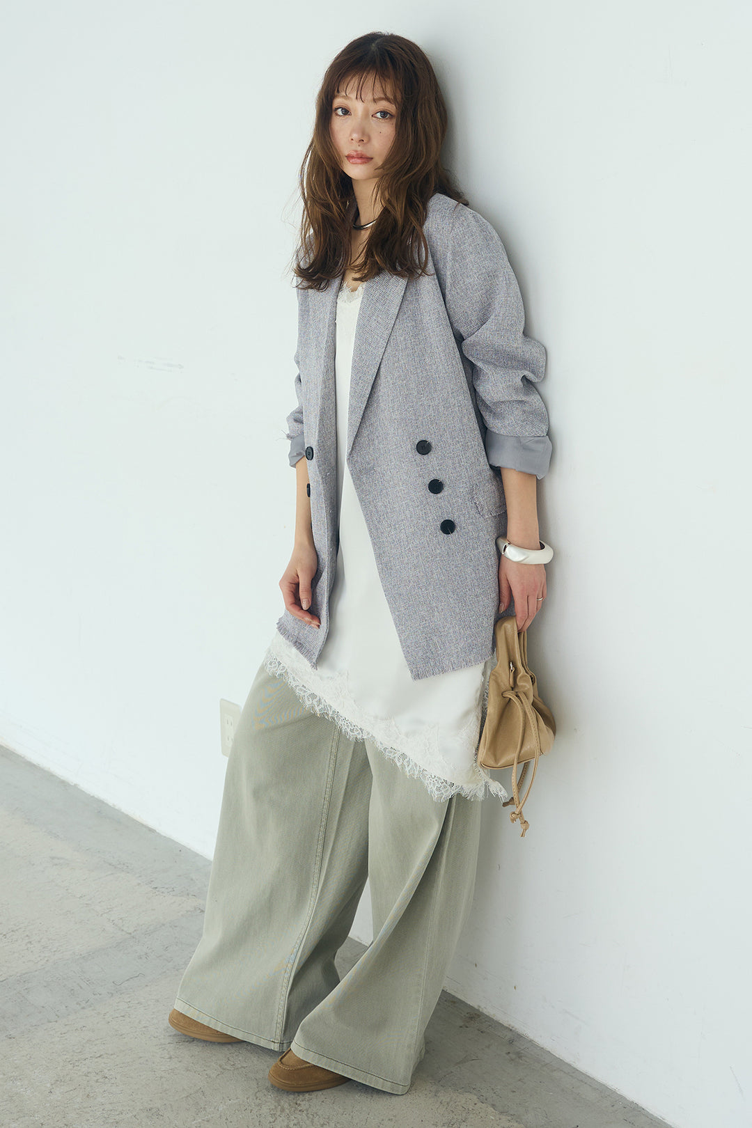 [SET]スラブネップツイードフリンジテーラードジャケット+ウエスト裁ち切りデニムワイドパンツ+サテンレースアシメキャミ(3set)