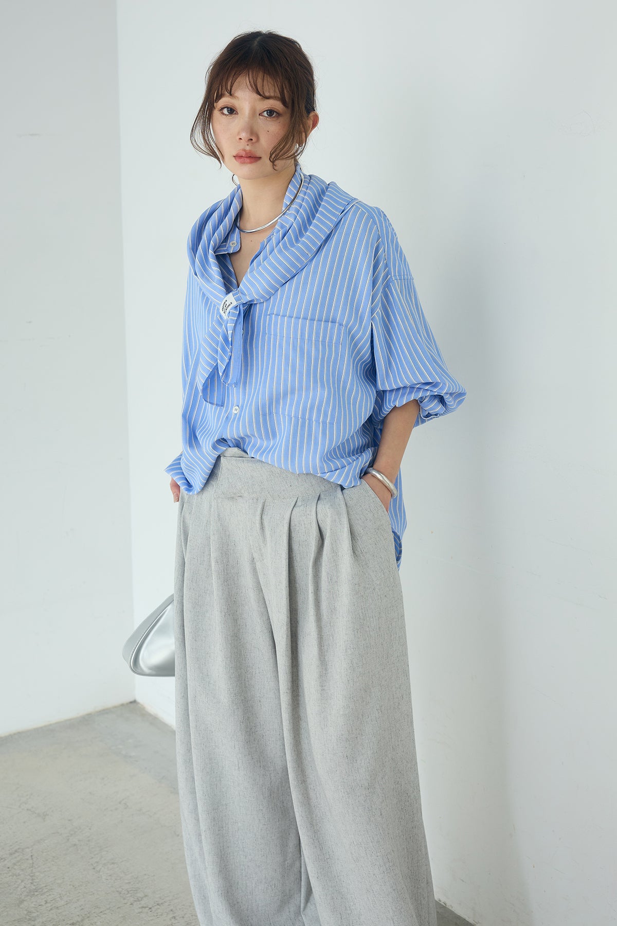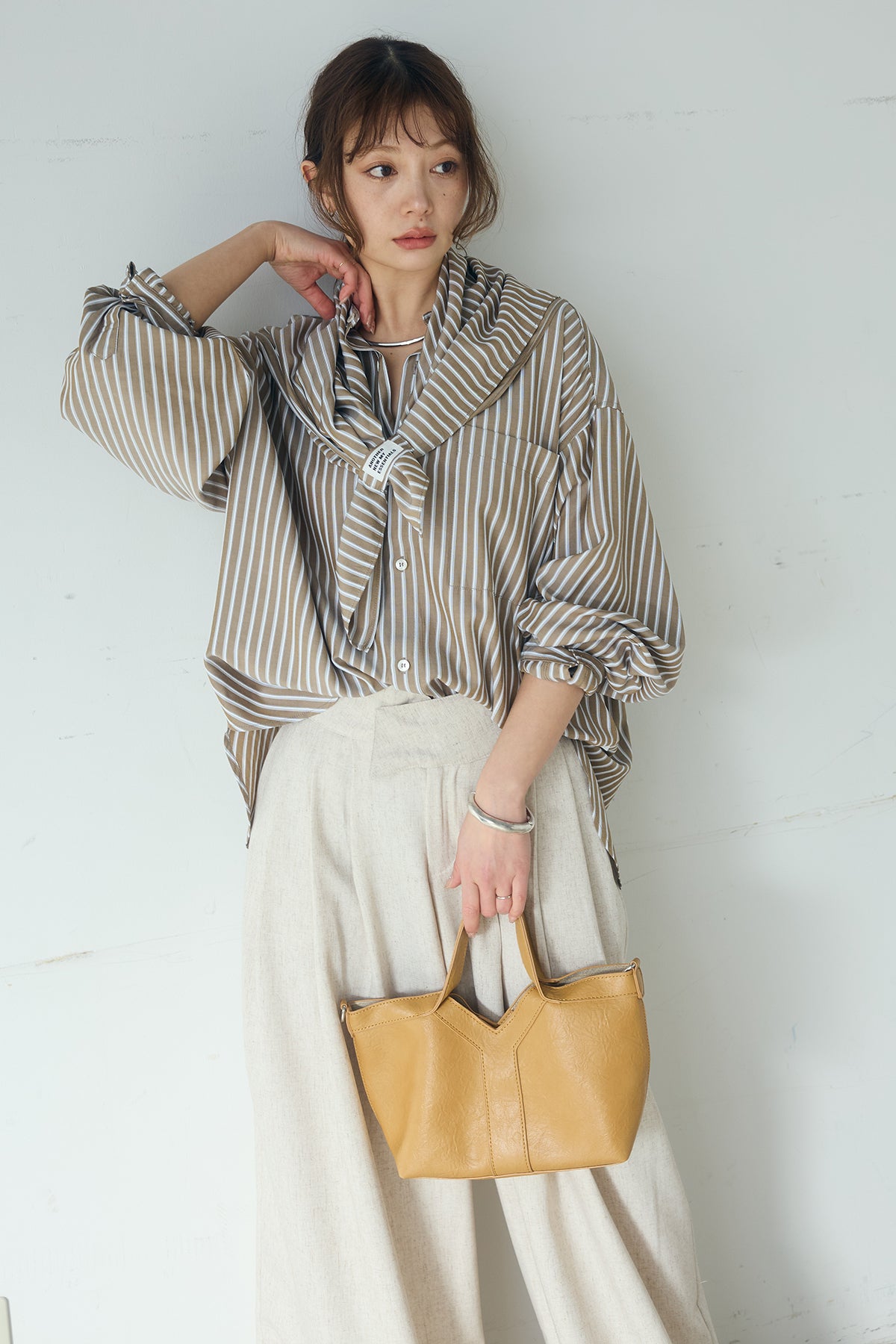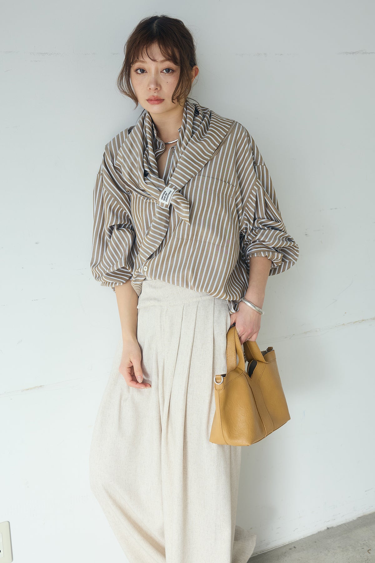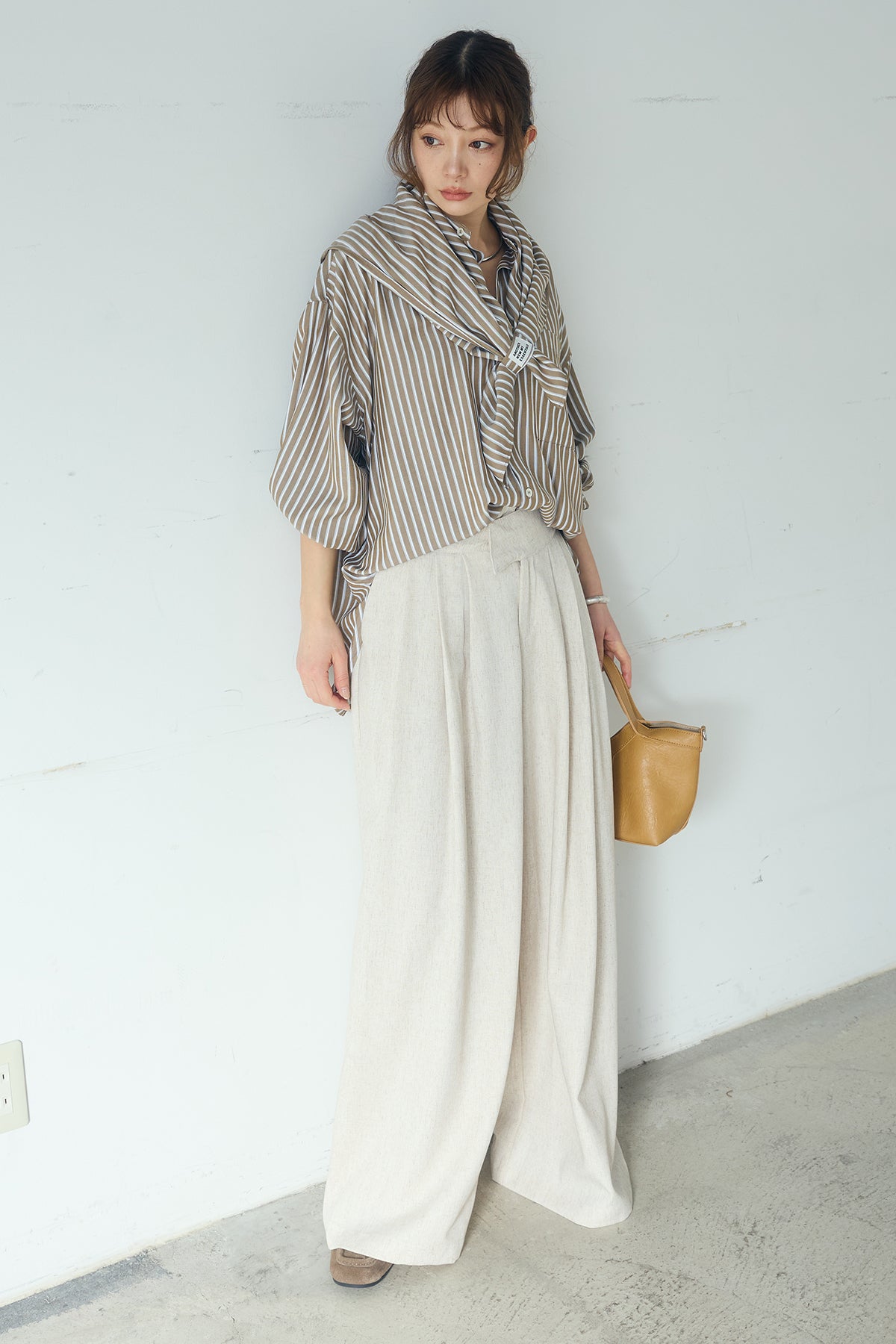 [SET]レーヨンストライプスカーフ+麻混タックワイドパンツ+レーヨンストライプバンドカラー長袖シャツ(3set)
