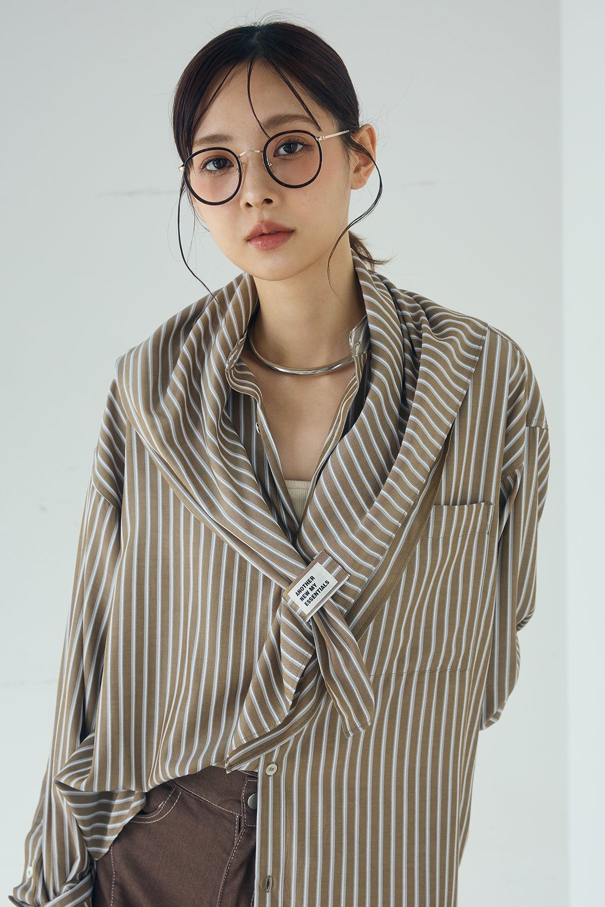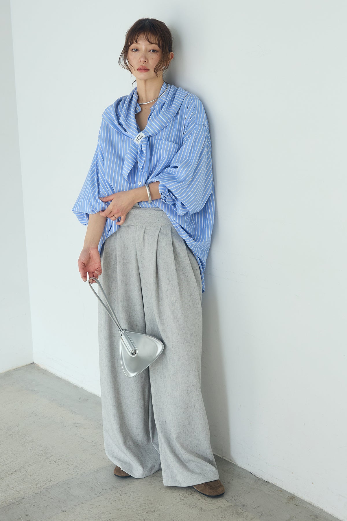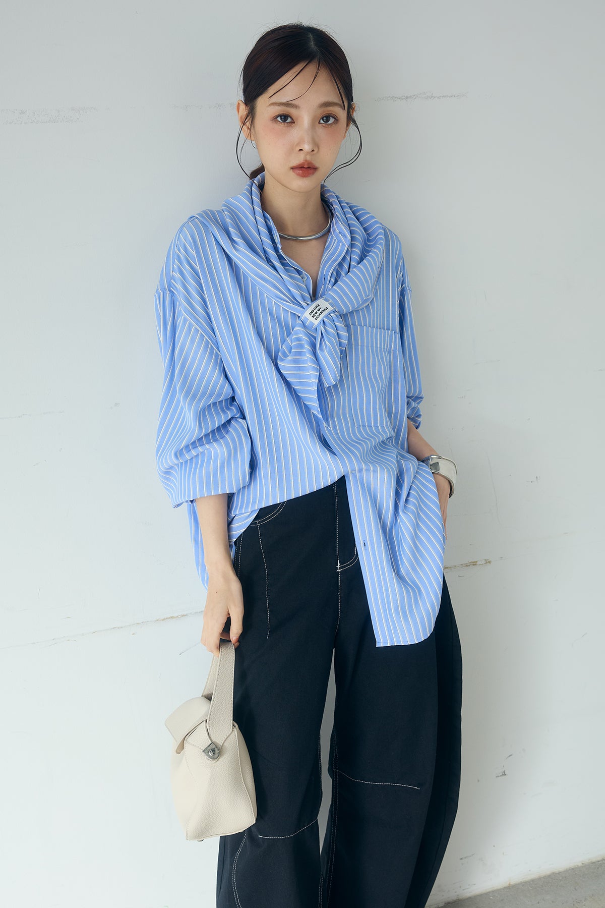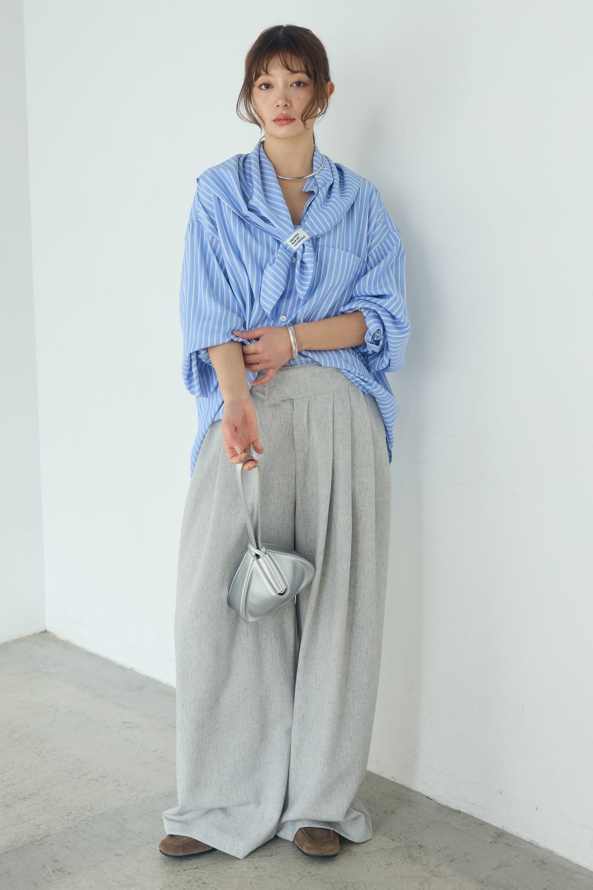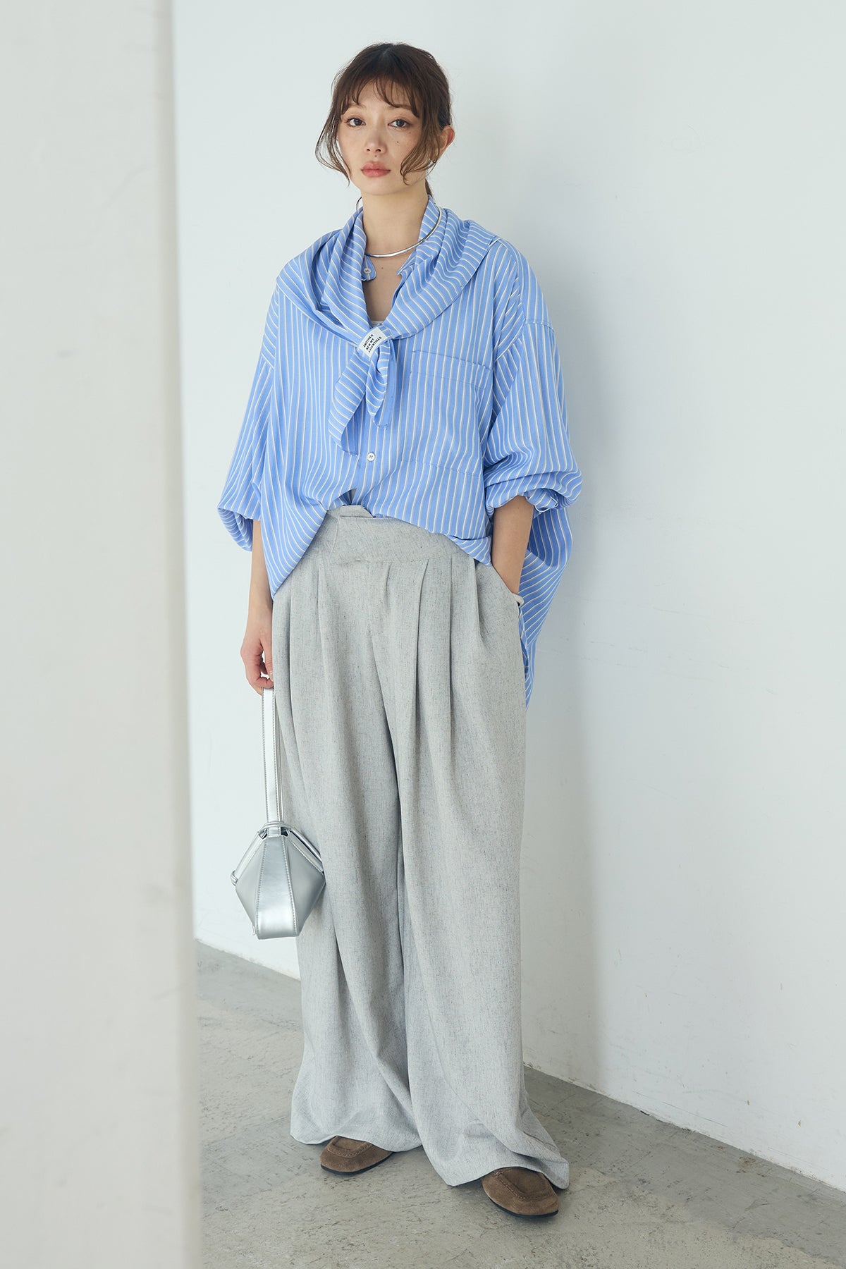 [SET]レーヨンストライプスカーフ+麻混タックワイドパンツ+レーヨンストライプバンドカラー長袖シャツ(3set)