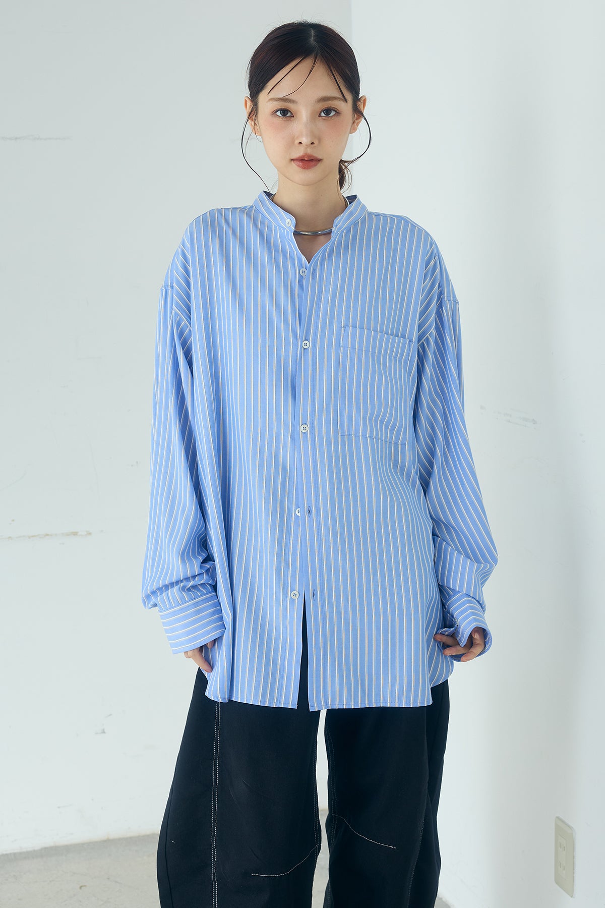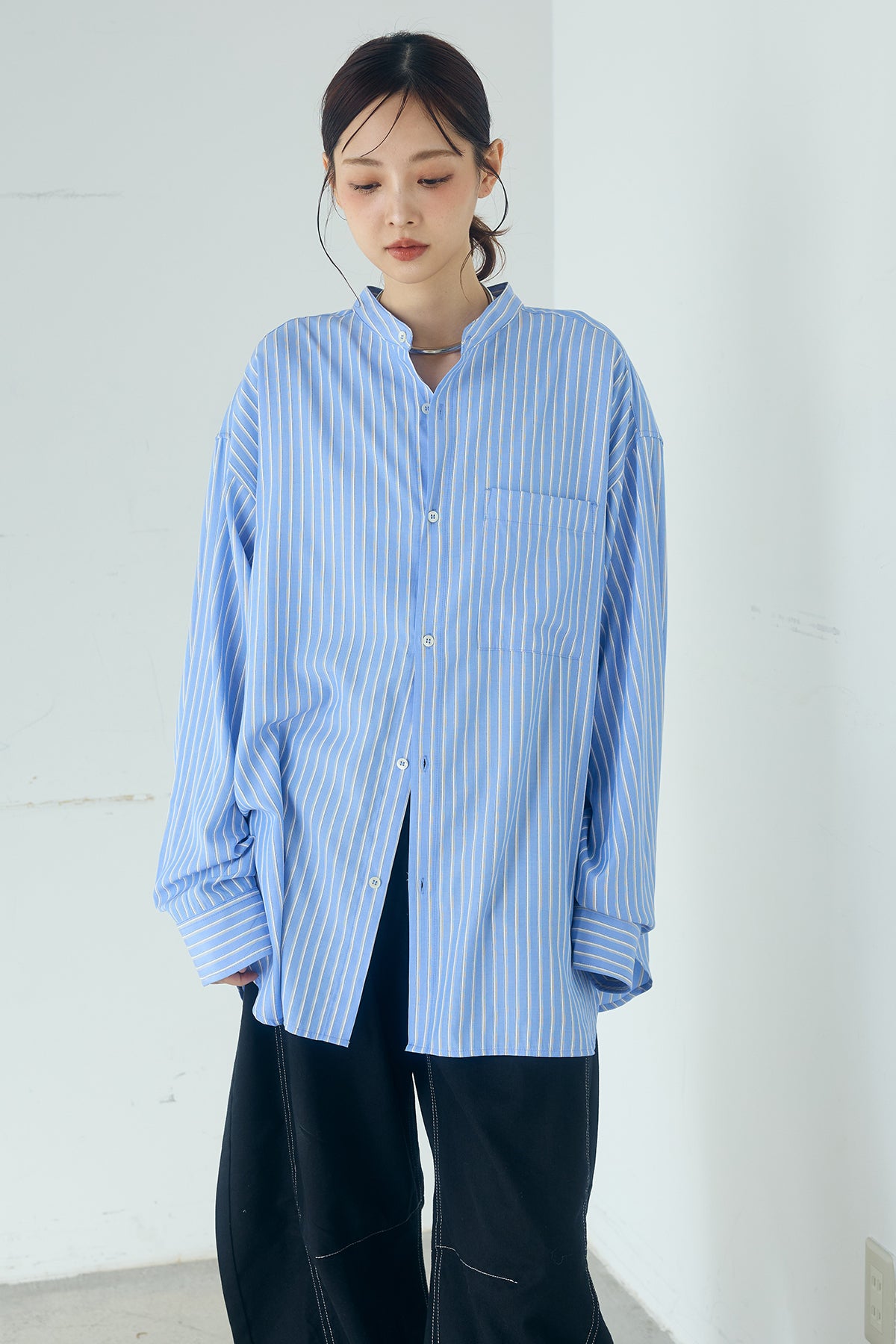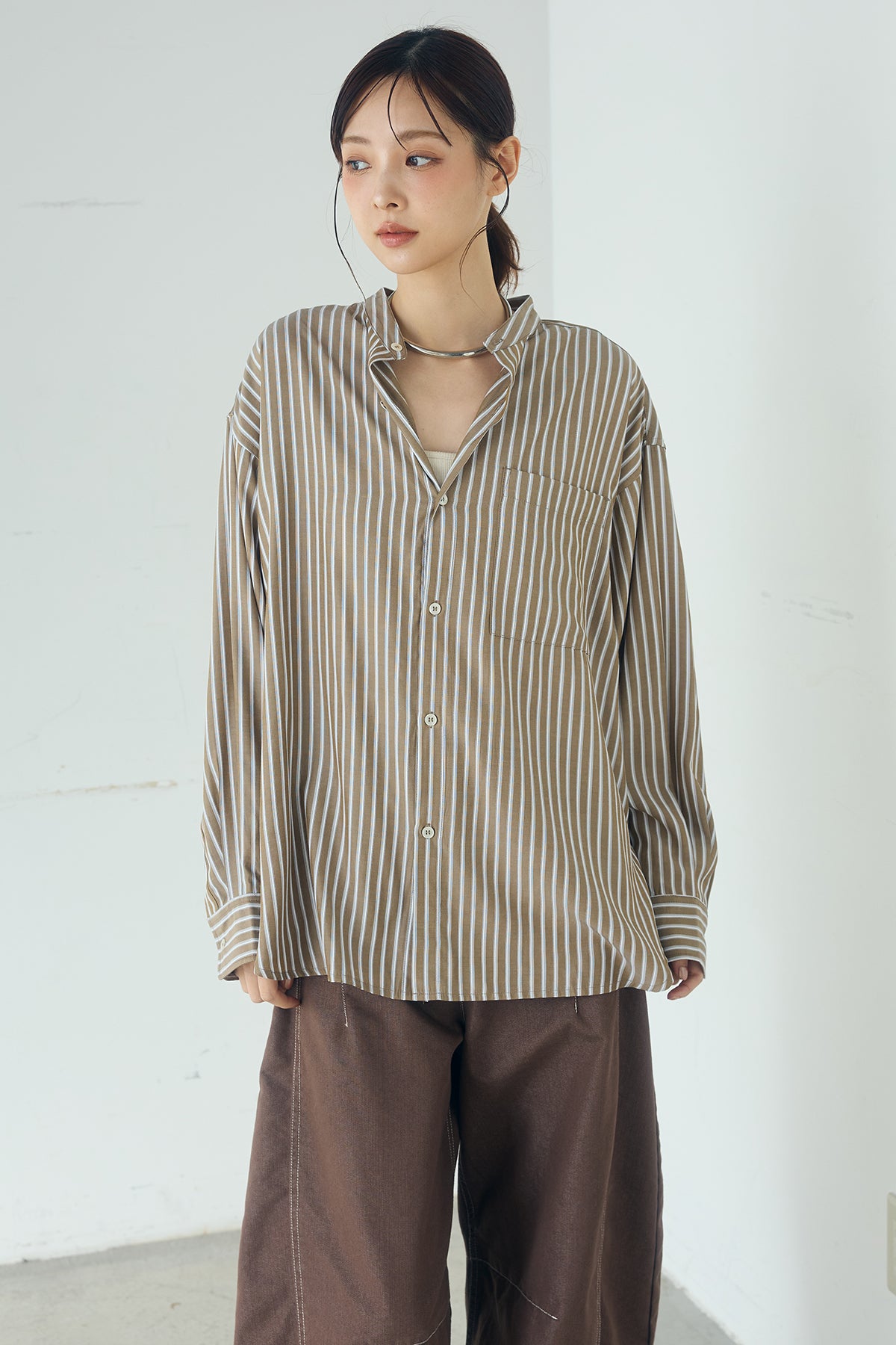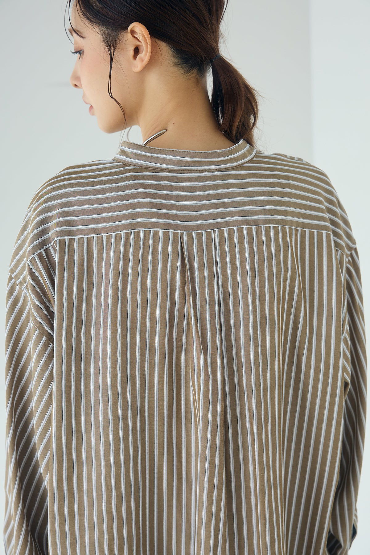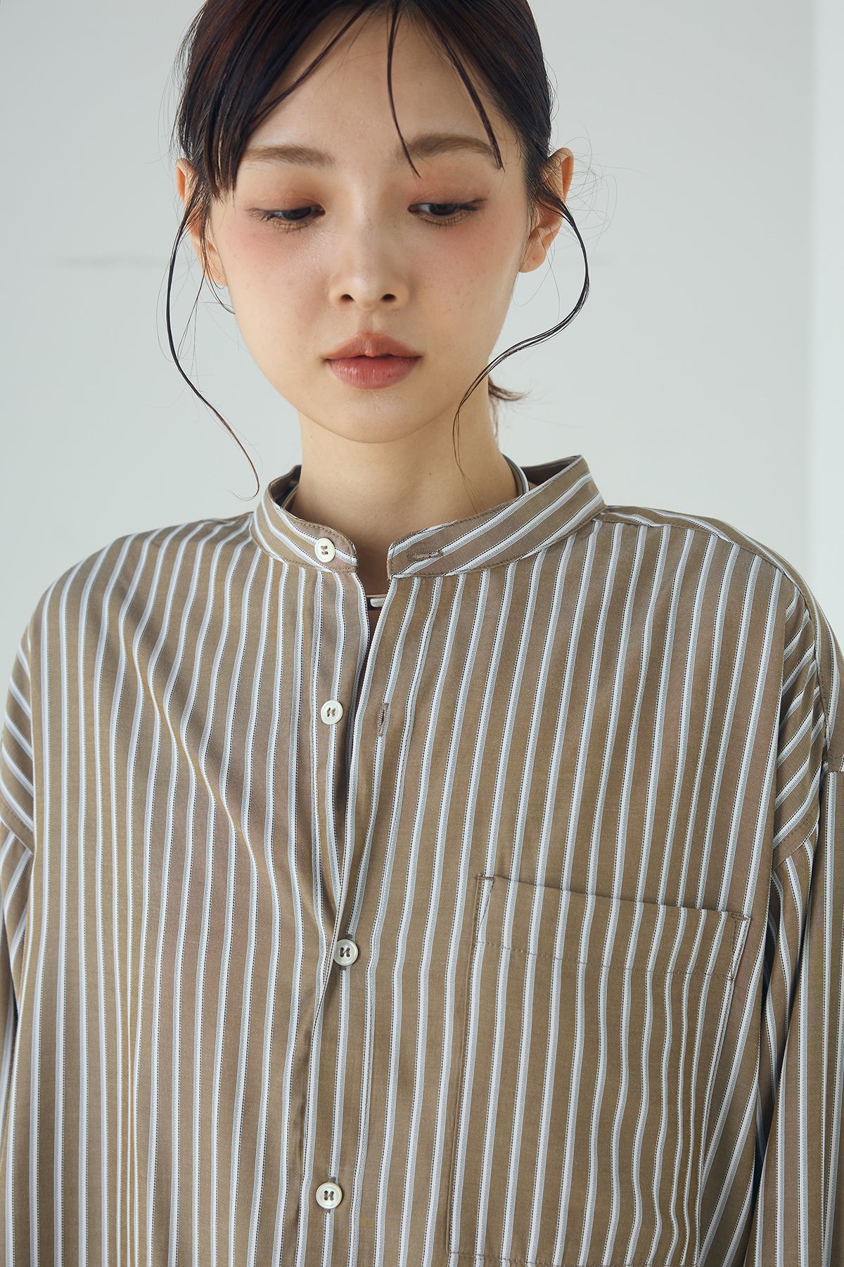 軽やかな落ち感で、自然な抜け感を楽しめる一枚。 滑らかなレーヨン素材を使用したストライプ柄のバンドカラーシャツ。やわらかな質感と程よいドレープが動きに合わせて表情を生み、リラックスした雰囲気を引き立てます。 すっきりとしたバンドカラーが首元を軽やかに見せ、きちんと感とラフさをバランスよく両立。ゆとりのあるシルエットが身体のラインを拾いにくく、さらっと羽織るだけでこなれた印象に仕上がります。 パンツやスカートに合わせたデイリースタイルはもちろん、ジャケットやニットのインナーとしても活躍。季節をまたいで長く取り入れやすい、着回し力の高い一着です。