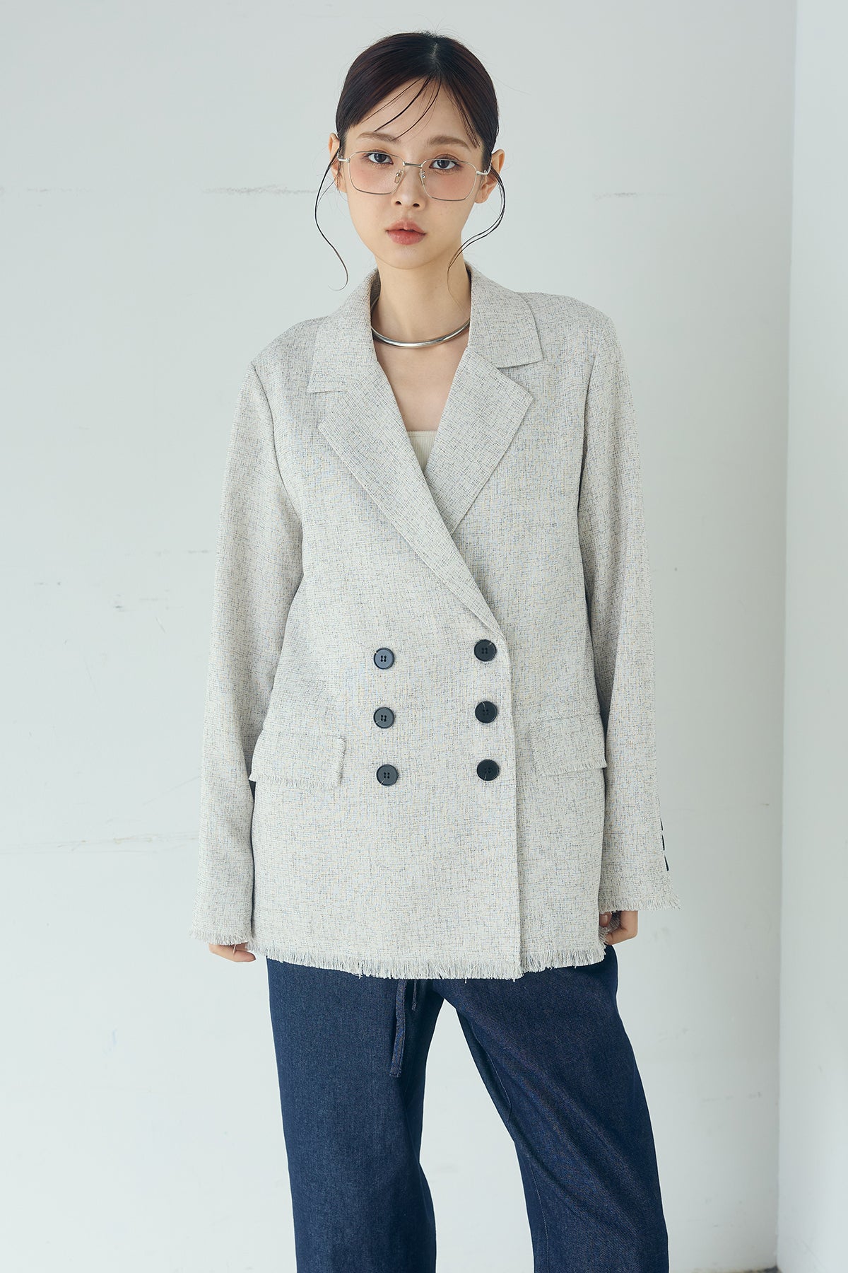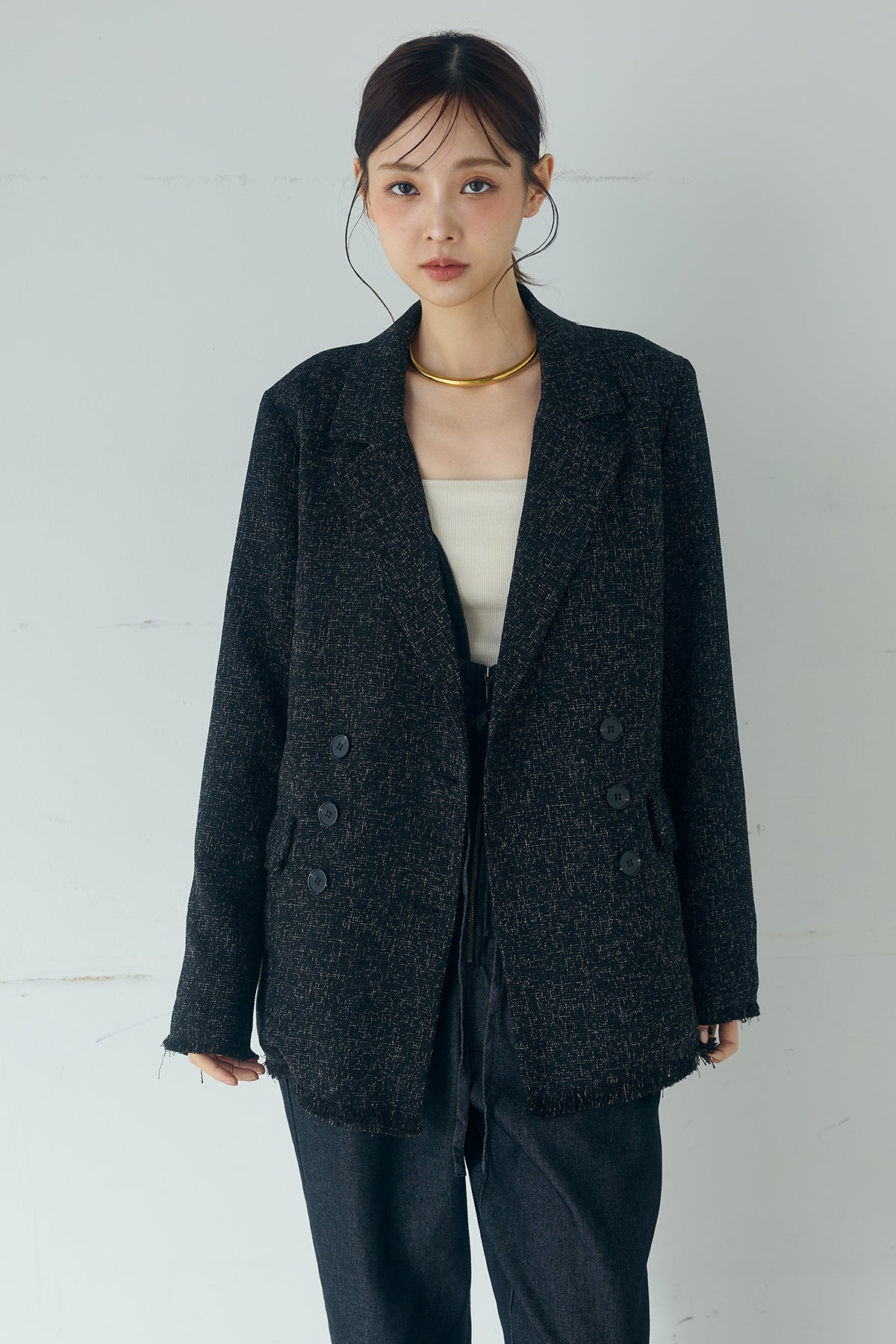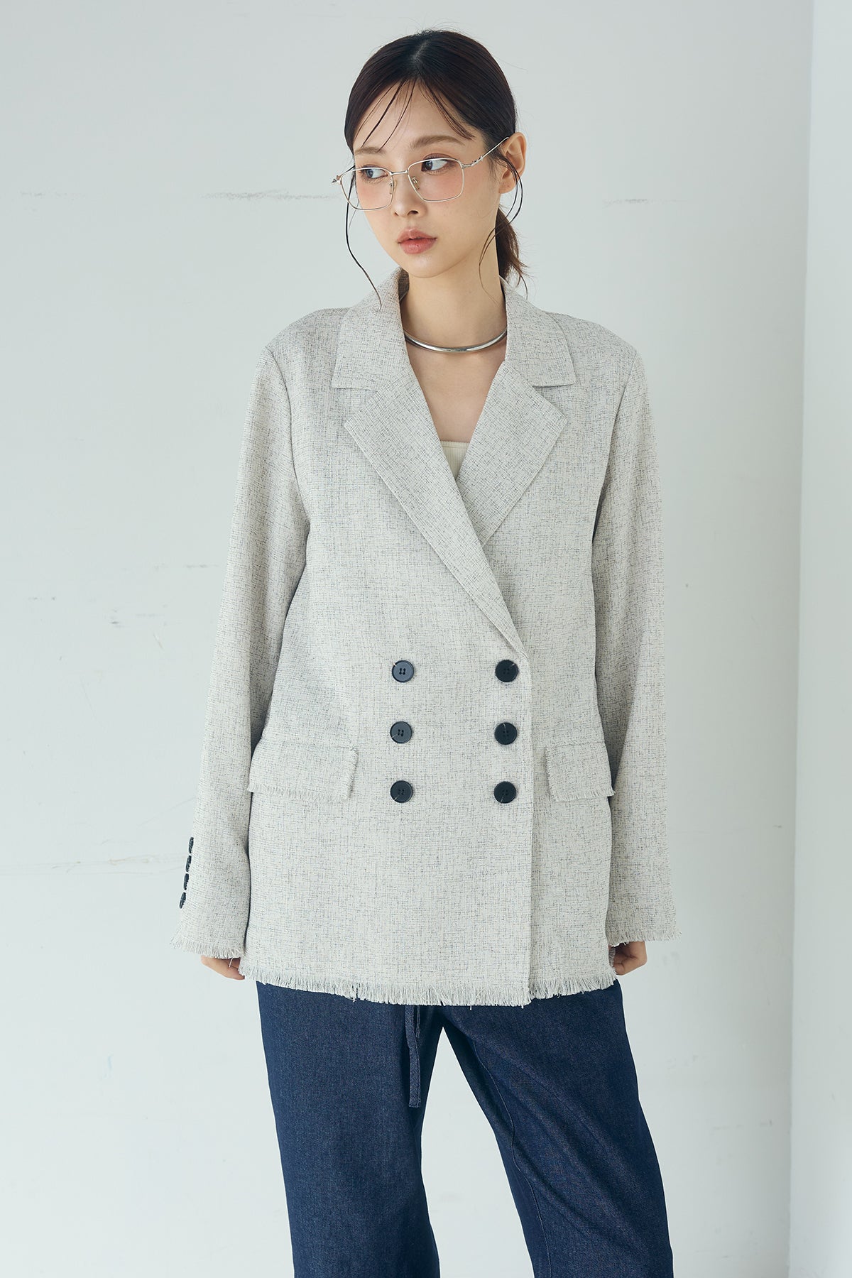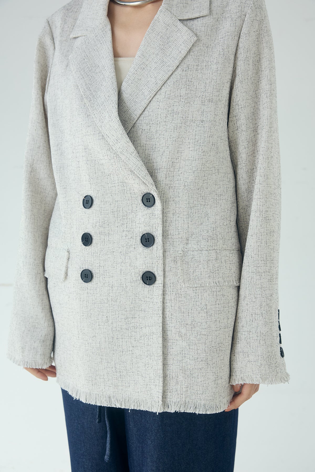 さりげない表情が、装いに奥行きを添える一着。 スラブネップツイード素材ならではの凹凸感が印象的なテーラードジャケット。繊細なフリンジディテールが程よいアクセントになり、きちんと感の中に抜け感をプラスします。 ダブルボタン仕様の程よくゆとりを持たせたシルエットが、羽織るだけでバランスの整った印象に。かっちりしすぎない軽やかな着心地で、デイリーにも取り入れやすい仕上がりです。 デニムやワイドパンツと合わせたラフなスタイルから、きれいめボトムとの組み合わせまで幅広く活躍。季節の変わり目にも重宝する、長く楽しめるアイテムです。