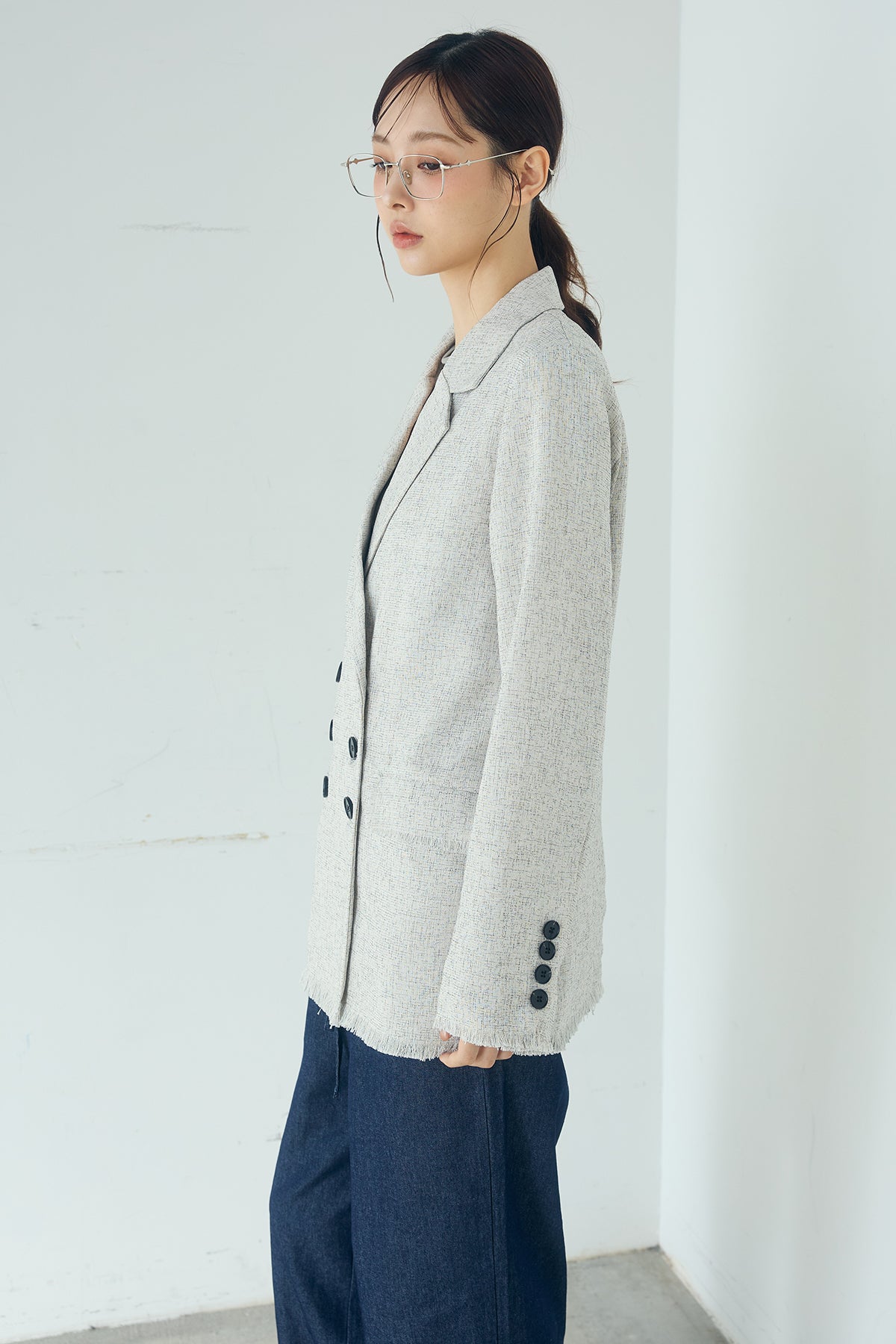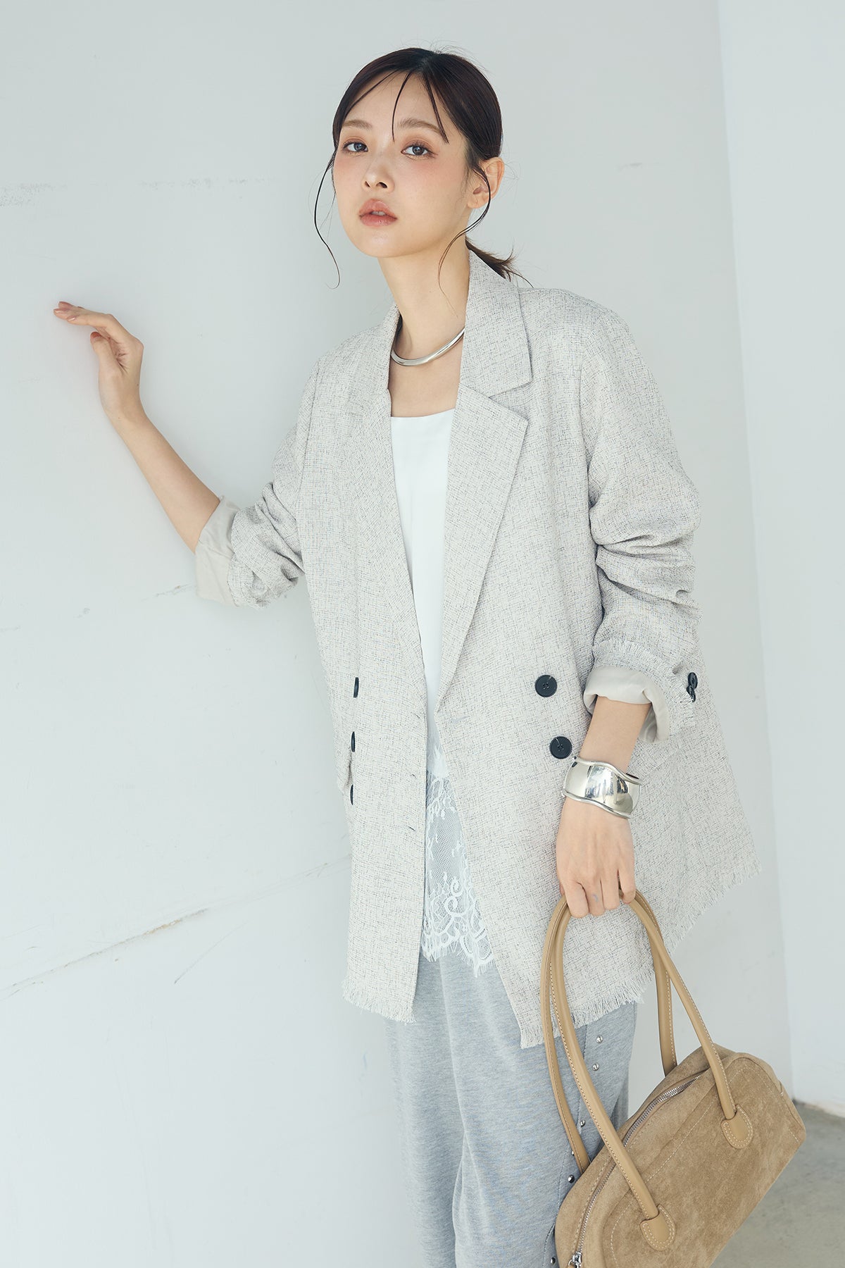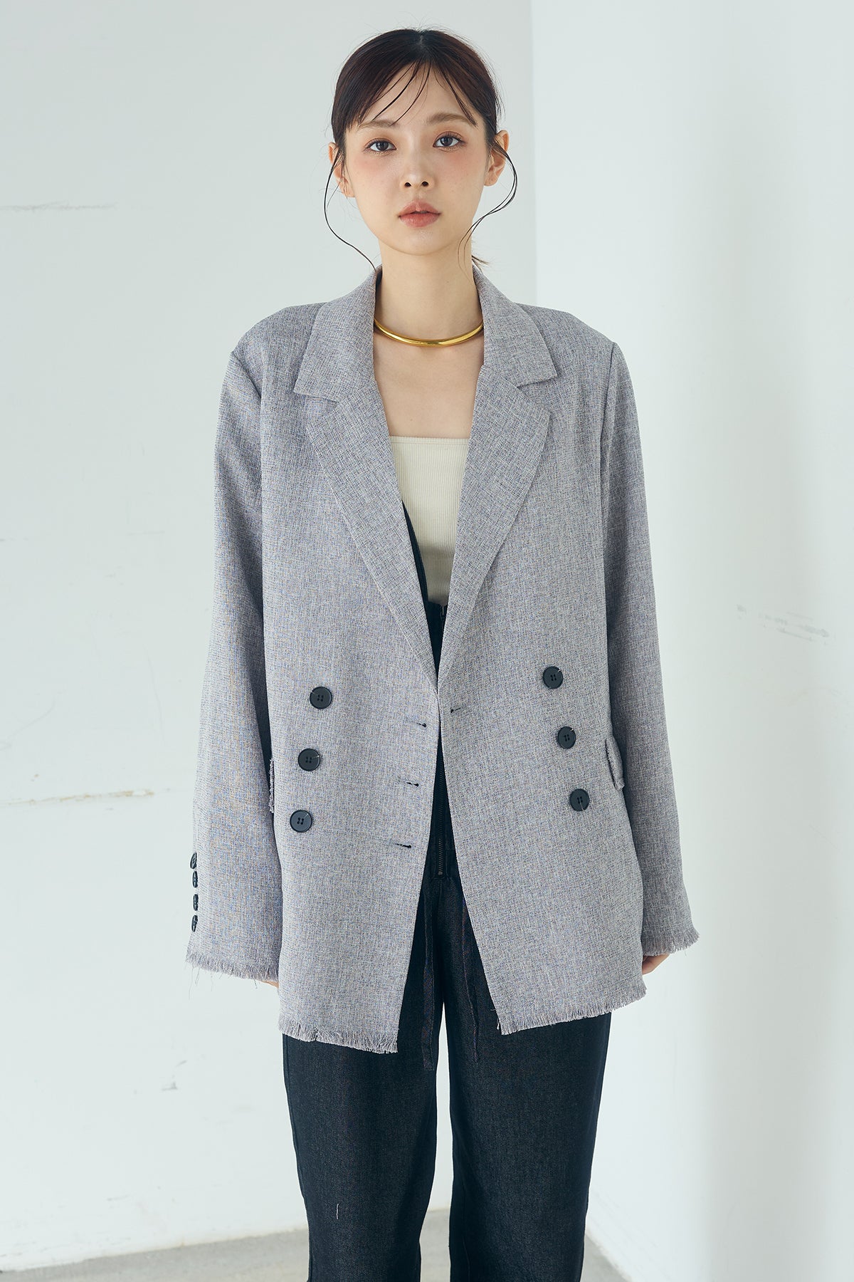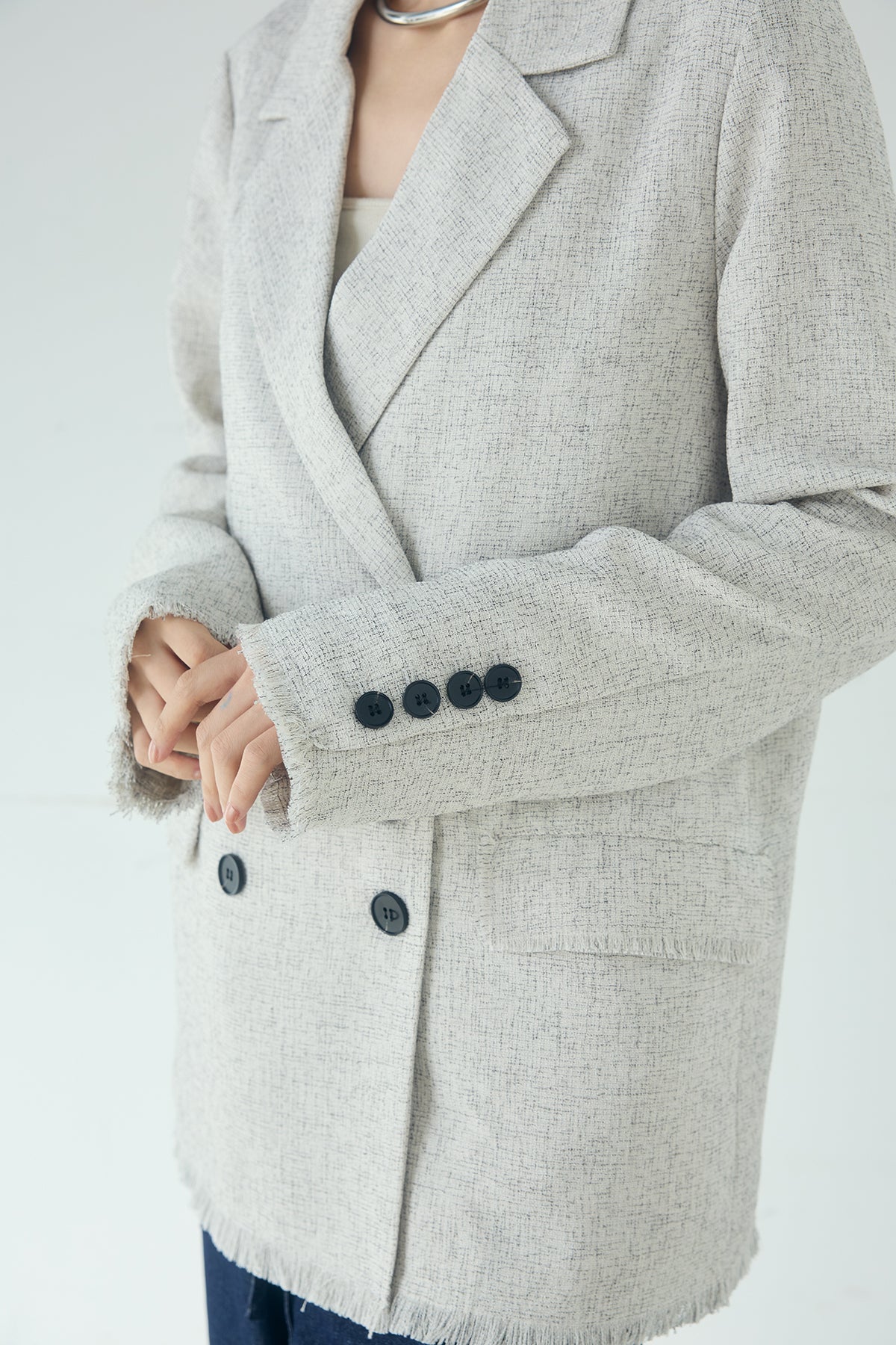 さりげない表情が、装いに奥行きを添える一着。 スラブネップツイード素材ならではの凹凸感が印象的なテーラードジャケット。繊細なフリンジディテールが程よいアクセントになり、きちんと感の中に抜け感をプラスします。 ダブルボタン仕様の程よくゆとりを持たせたシルエットが、羽織るだけでバランスの整った印象に。かっちりしすぎない軽やかな着心地で、デイリーにも取り入れやすい仕上がりです。 デニムやワイドパンツと合わせたラフなスタイルから、きれいめボトムとの組み合わせまで幅広く活躍。季節の変わり目にも重宝する、長く楽しめるアイテムです。