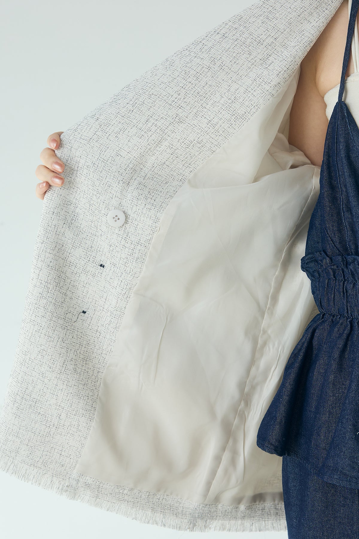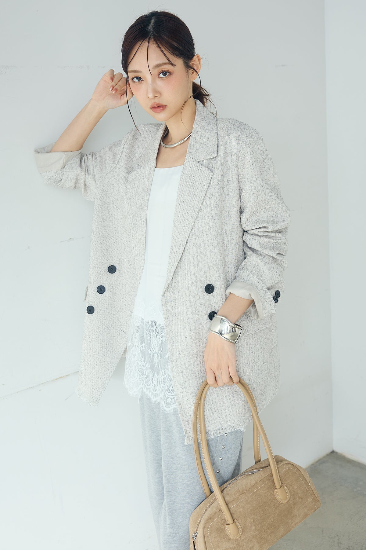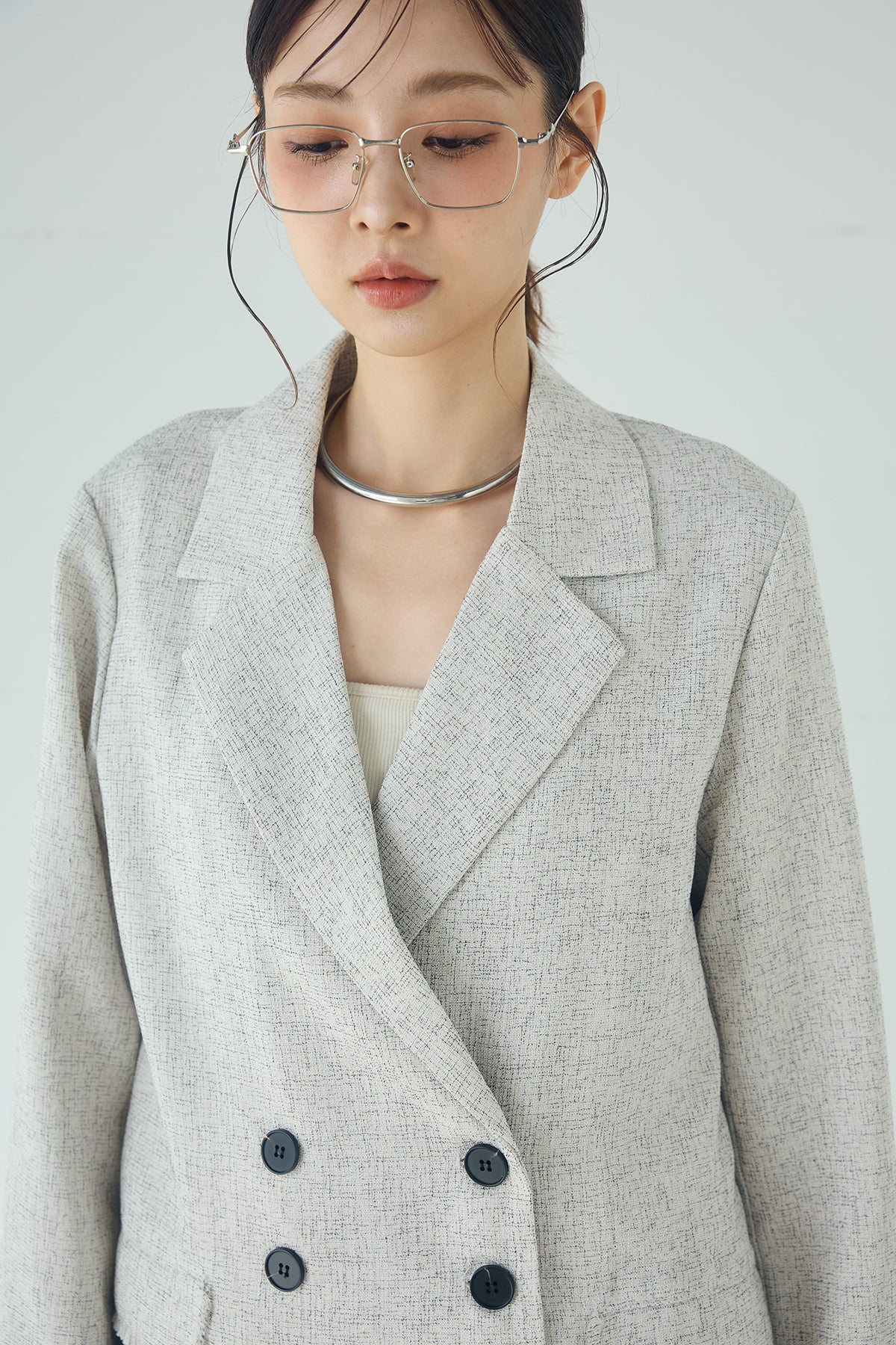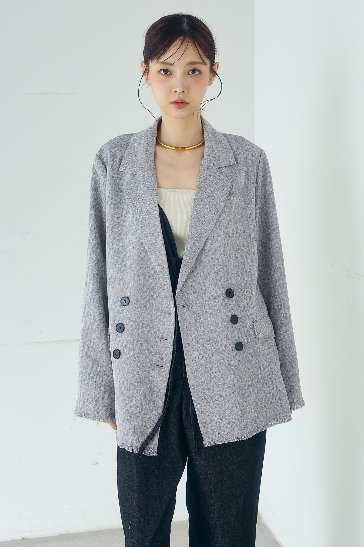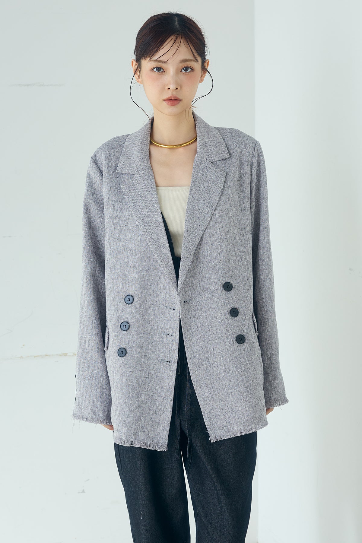 さりげない表情が、装いに奥行きを添える一着。 スラブネップツイード素材ならではの凹凸感が印象的なテーラードジャケット。繊細なフリンジディテールが程よいアクセントになり、きちんと感の中に抜け感をプラスします。 ダブルボタン仕様の程よくゆとりを持たせたシルエットが、羽織るだけでバランスの整った印象に。かっちりしすぎない軽やかな着心地で、デイリーにも取り入れやすい仕上がりです。 デニムやワイドパンツと合わせたラフなスタイルから、きれいめボトムとの組み合わせまで幅広く活躍。季節の変わり目にも重宝する、長く楽しめるアイテムです。