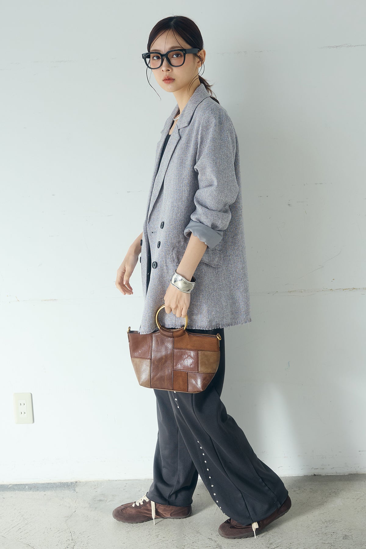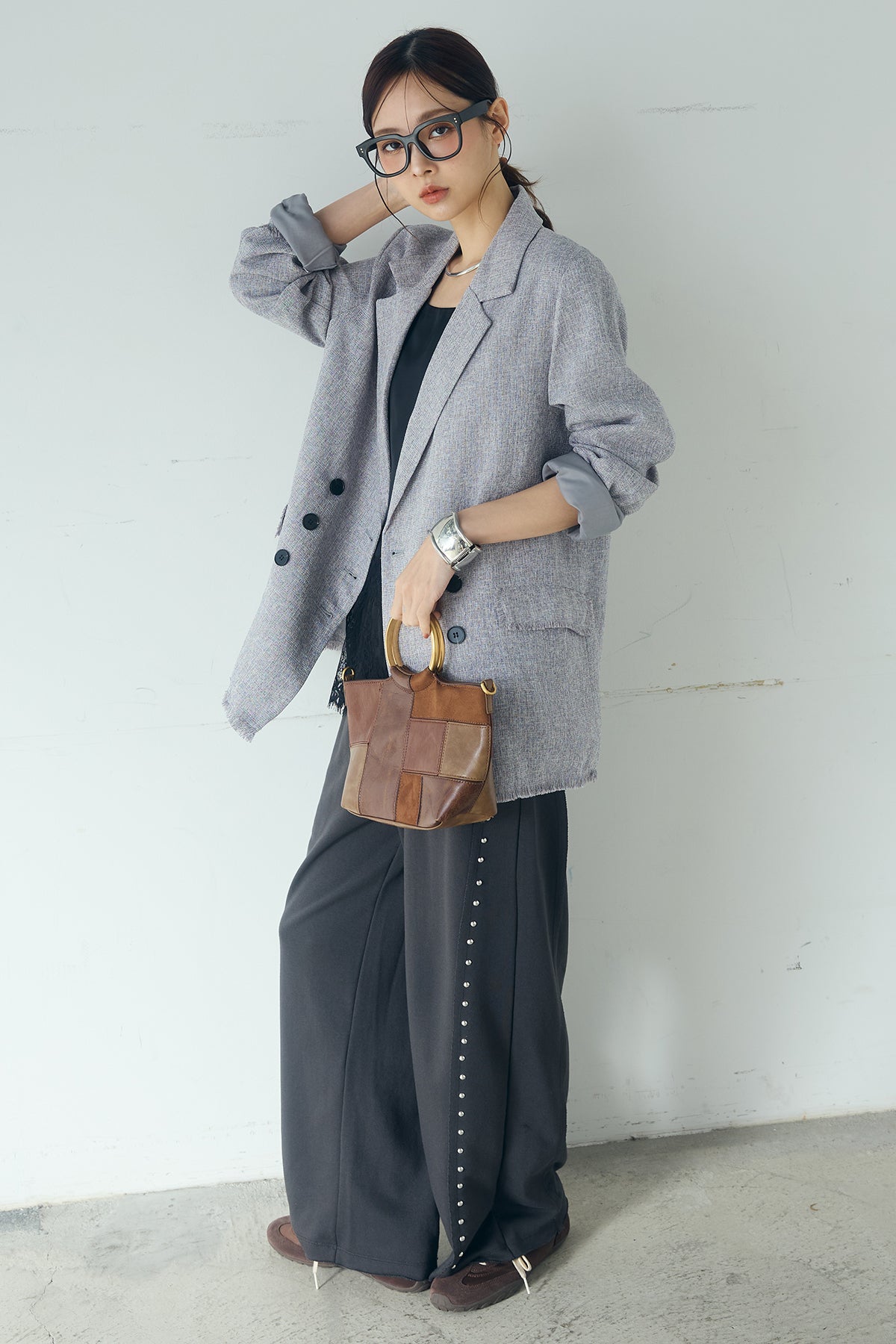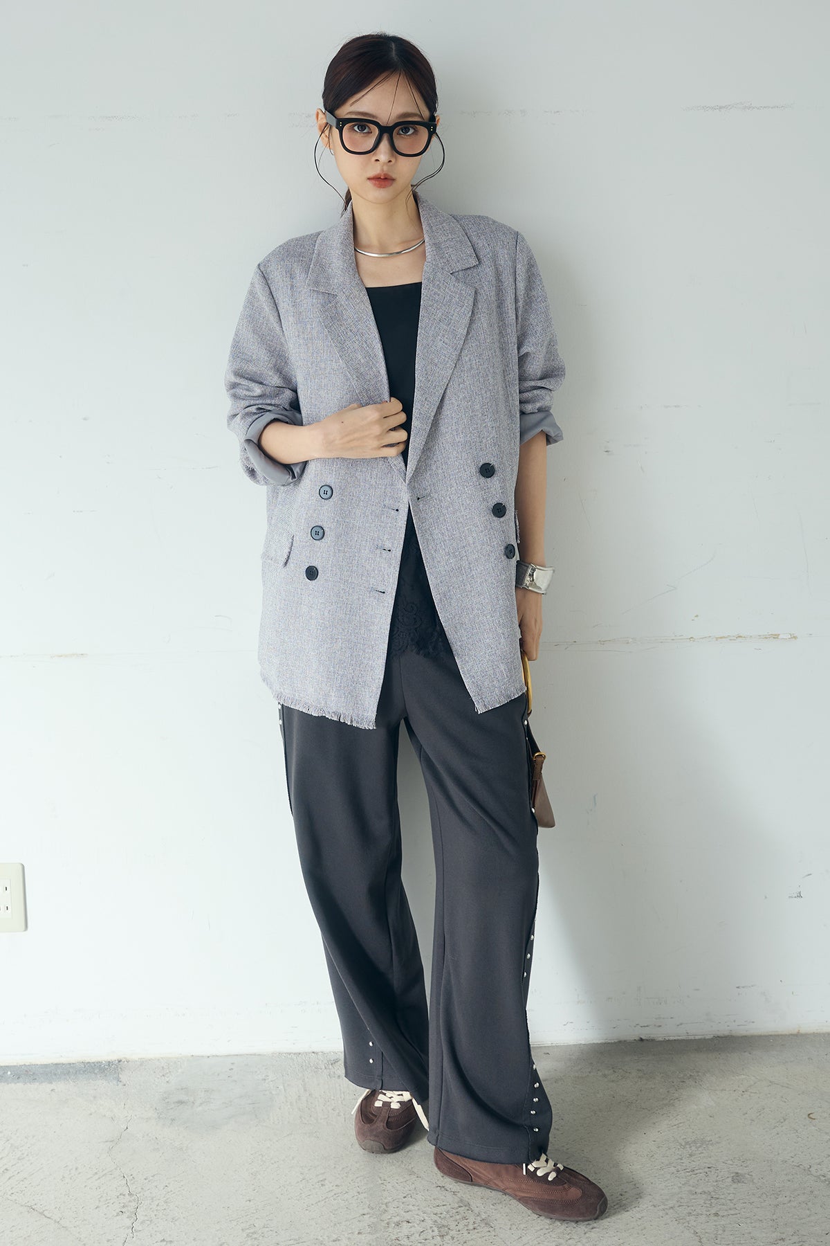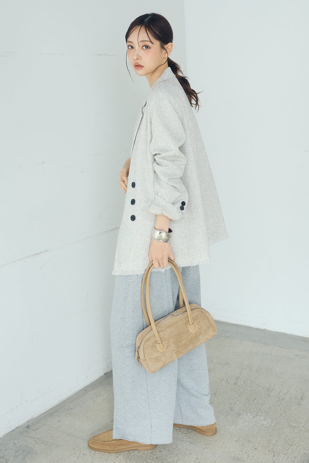 さりげない表情が、装いに奥行きを添える一着。 スラブネップツイード素材ならではの凹凸感が印象的なテーラードジャケット。繊細なフリンジディテールが程よいアクセントになり、きちんと感の中に抜け感をプラスします。 ダブルボタン仕様の程よくゆとりを持たせたシルエットが、羽織るだけでバランスの整った印象に。かっちりしすぎない軽やかな着心地で、デイリーにも取り入れやすい仕上がりです。 デニムやワイドパンツと合わせたラフなスタイルから、きれいめボトムとの組み合わせまで幅広く活躍。季節の変わり目にも重宝する、長く楽しめるアイテムです。
