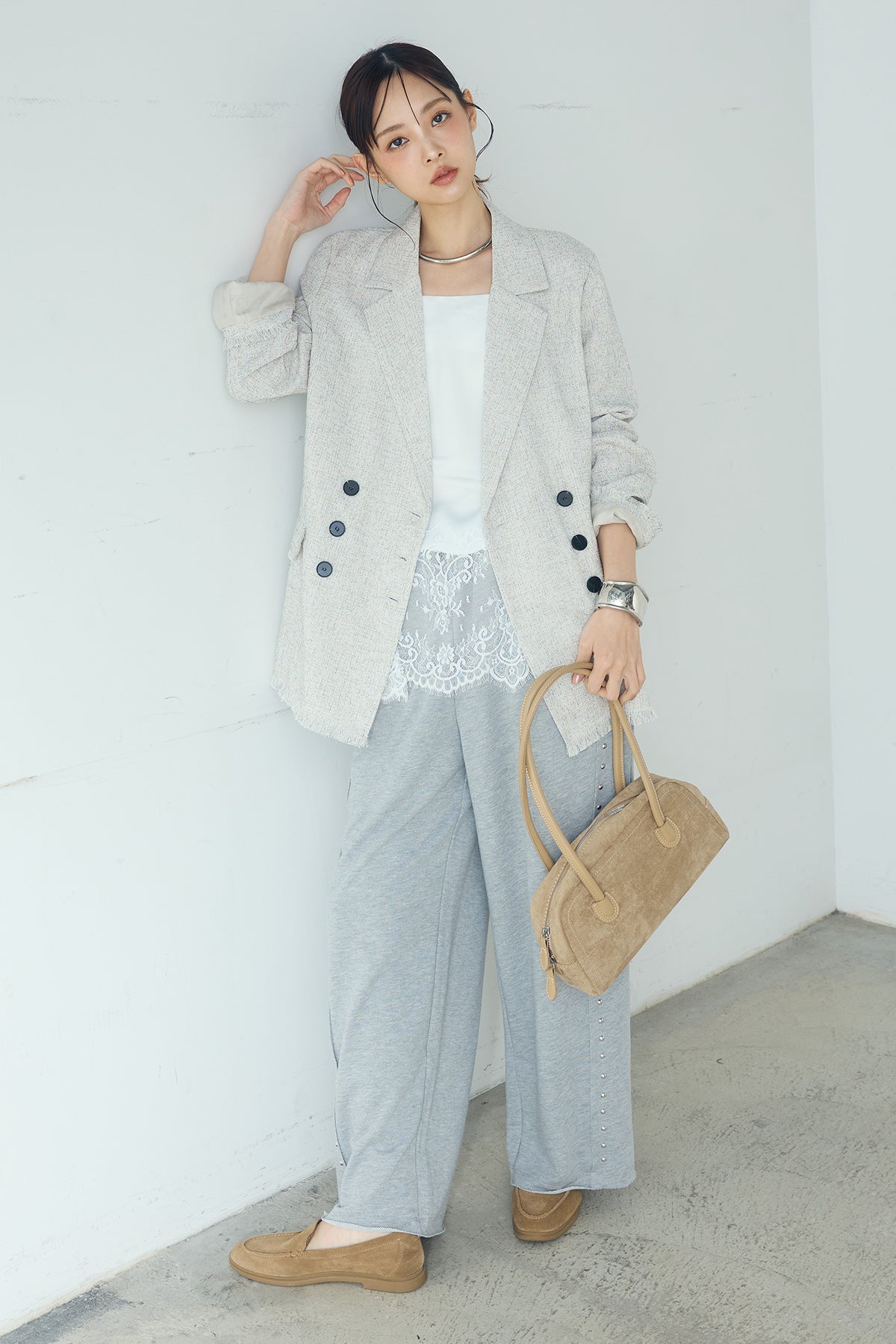 [SET]スラブネップツイードフリンジテーラードジャケット+サイドデザイン入りスウェットパンツ+裾レースキャミソール(3set)