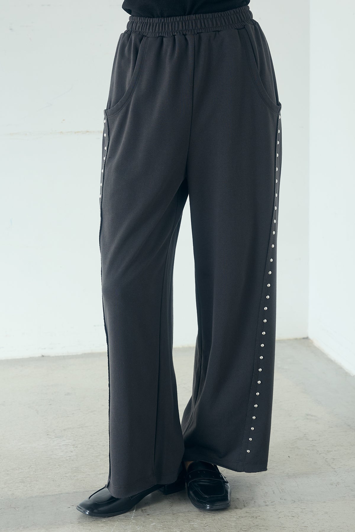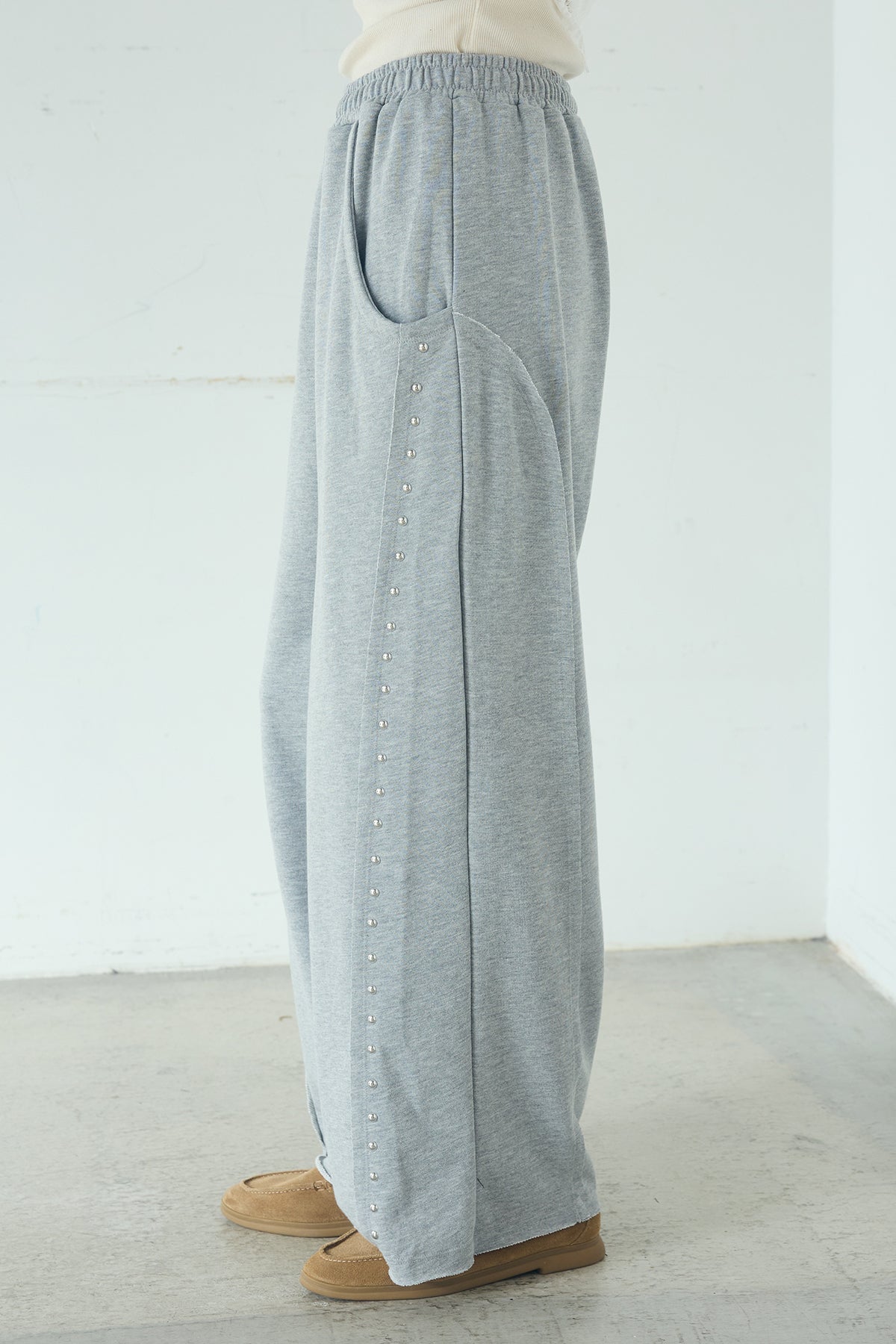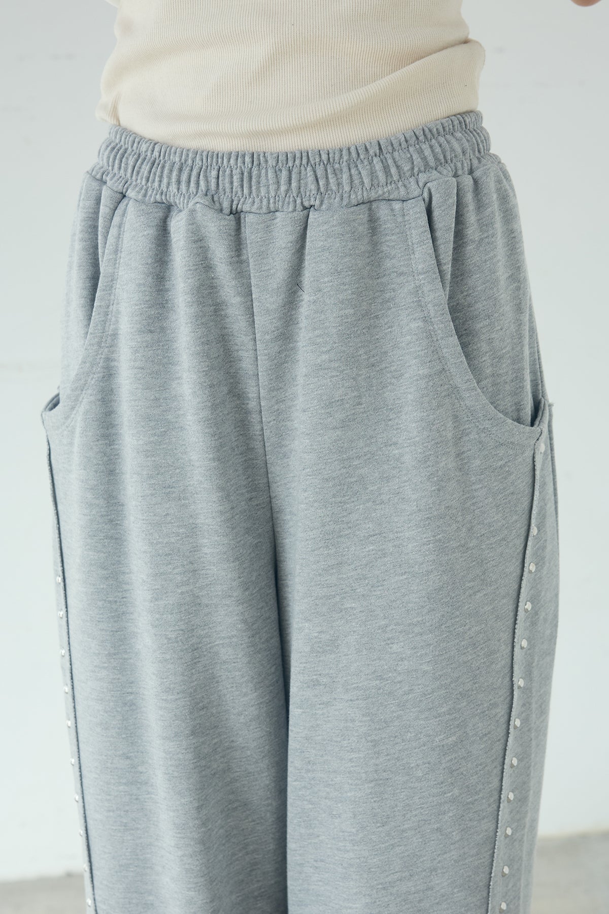 リラックス感の中に、さりげないアクセントを添えて。 程よくラフな穿き心地が魅力のスウェットパンツに、サイドデザインを効かせた一本。シンプルなシルエットにライン状のディテールを加えることで、カジュアルになりすぎずスタイリングにほどよい存在感をプラスします。 ウエストはイージー仕様でストレスフリーな着用感。ゆとりのあるストレートラインが脚のラインを拾いにくく、自然な抜け感のあるバランスに仕上がります。 コンパクトなトップスからオーバーサイズのシャツやニットまで幅広く合わせやすく、デイリーに取り入れやすいのも魅力。ラフさとデザイン性を両立した、着回し力の高いアイテムです。