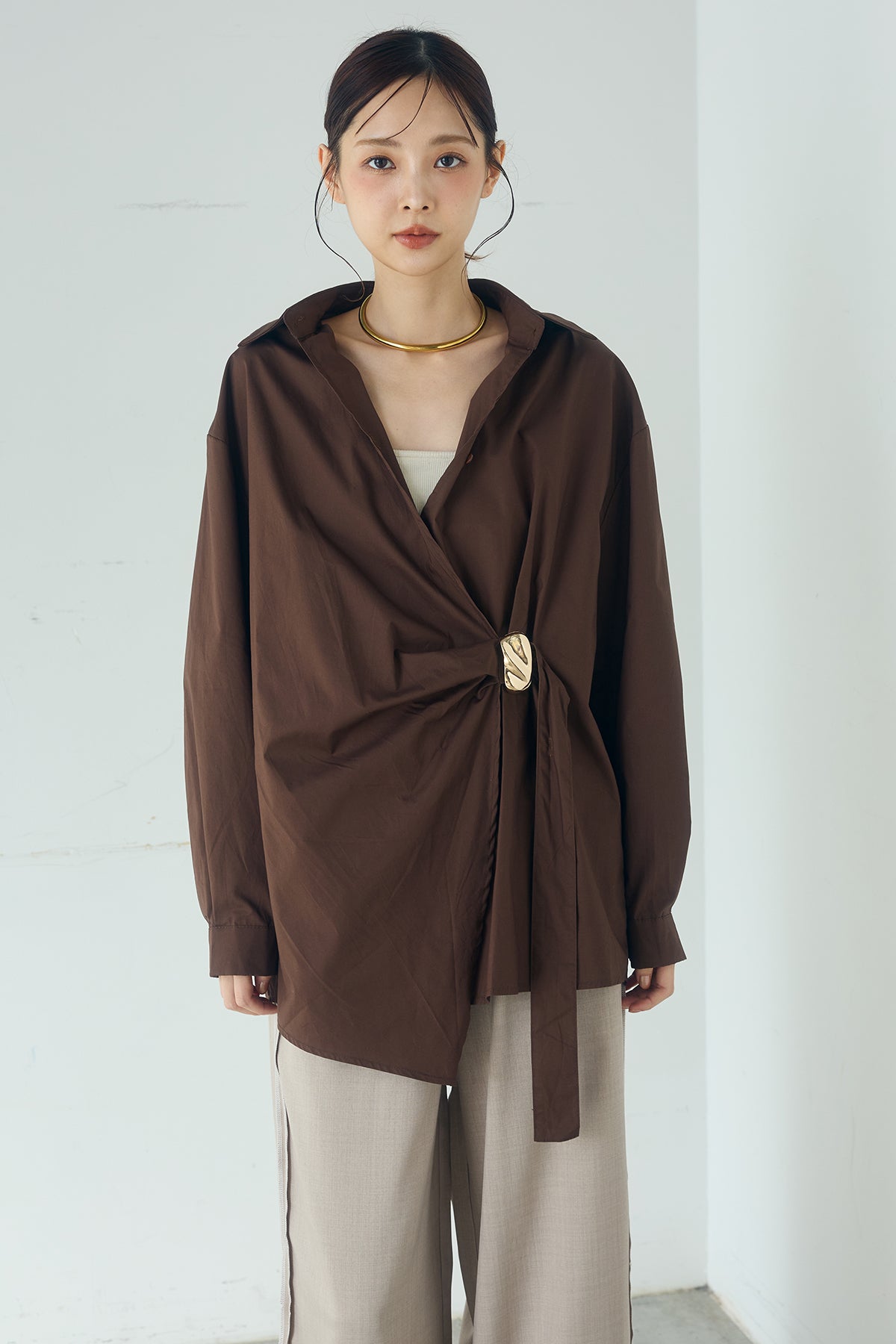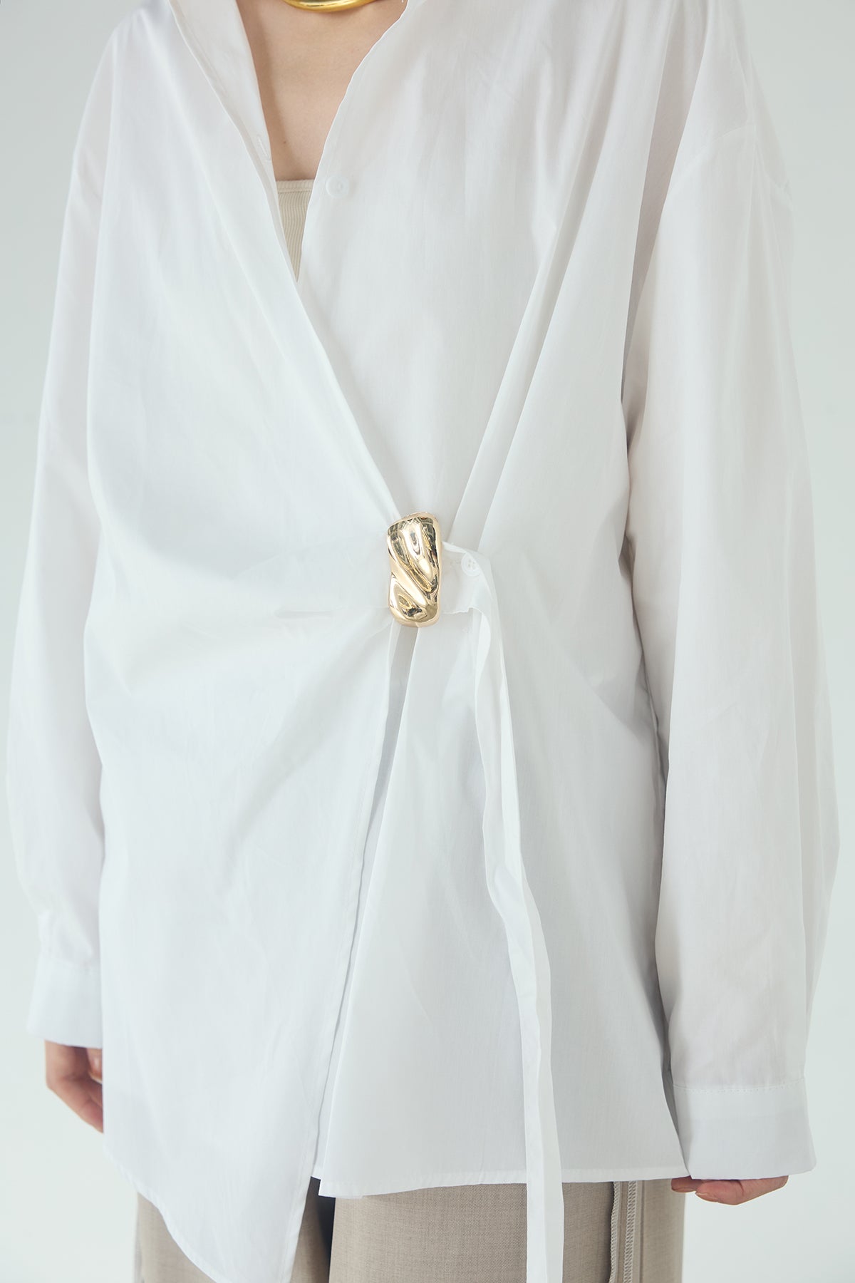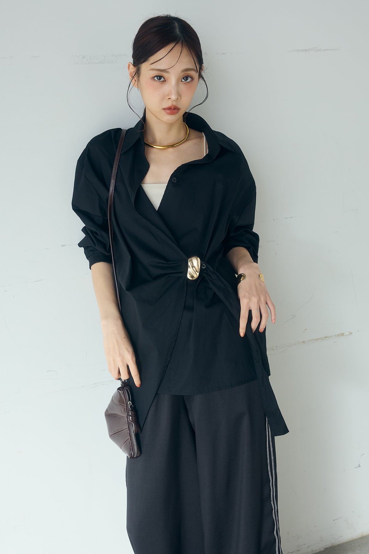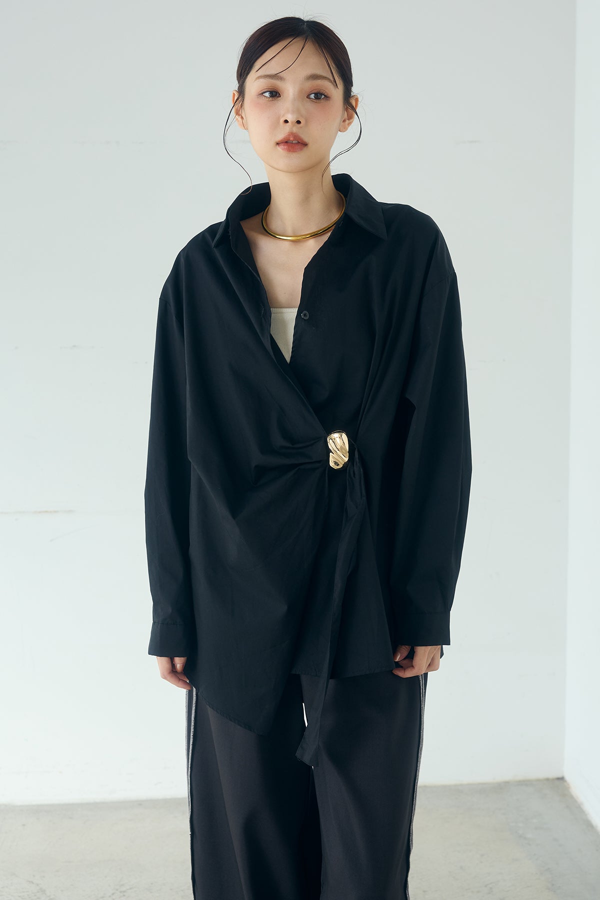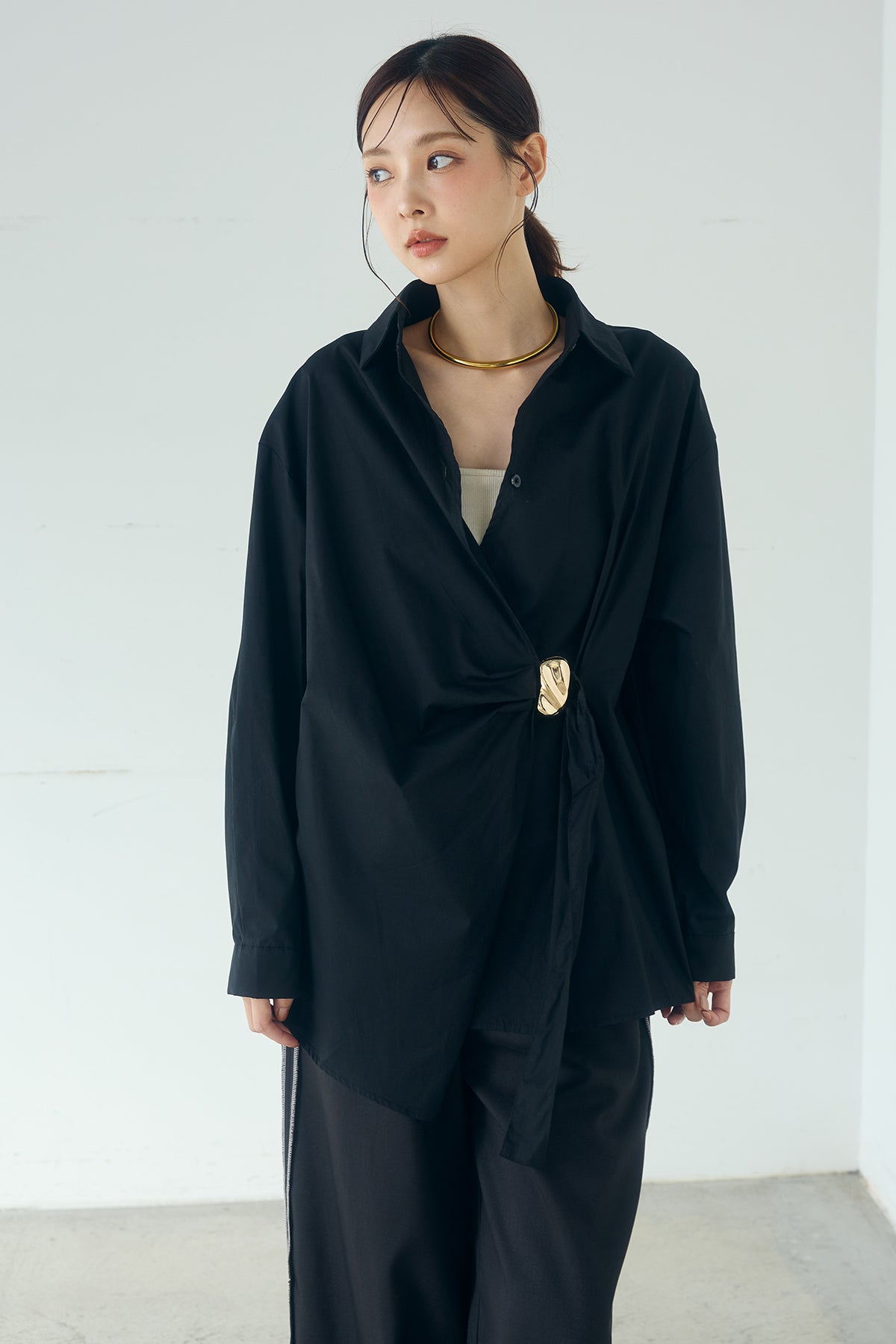 ひとさじのデザインで、印象が変わる一枚。 サイドにあしらった留め具デザインが目を惹くデザインシャツ。ラップ風に重なるフロントが立体感を生み、シンプルながらも動きのあるシルエットを楽しめます。 程よくゆとりのあるサイズ感と長めの着丈が、自然な抜け感をプラス。シャープな襟元とのバランスが整い、きちんと感と軽やかさを兼ね備えた仕上がりです。 パンツスタイルはもちろん、スカートやワイドボトムとも相性が良く、合わせるアイテム次第で印象を変えられるのも魅力。日常からお出かけまで幅広く取り入れやすい一着です。