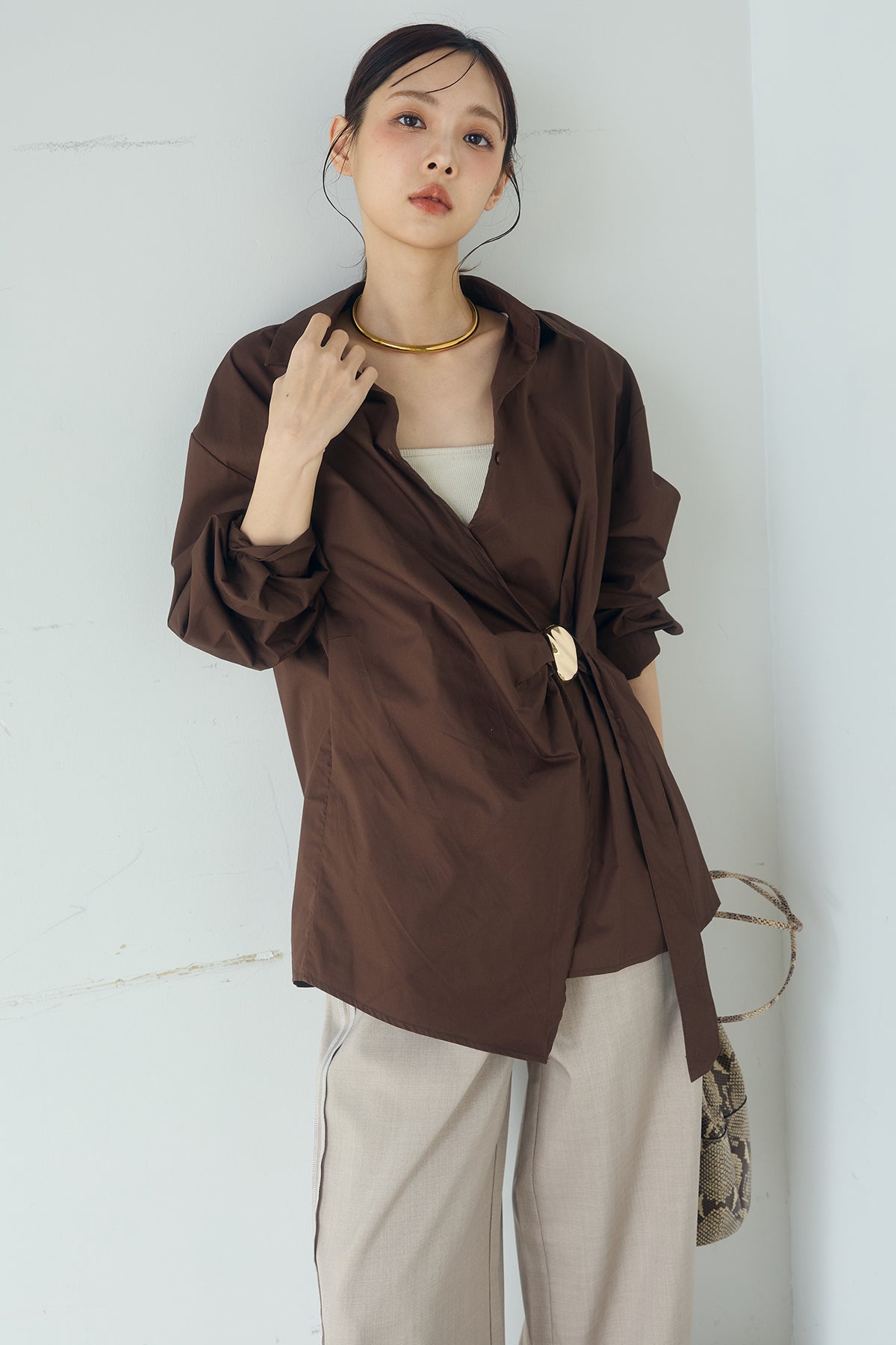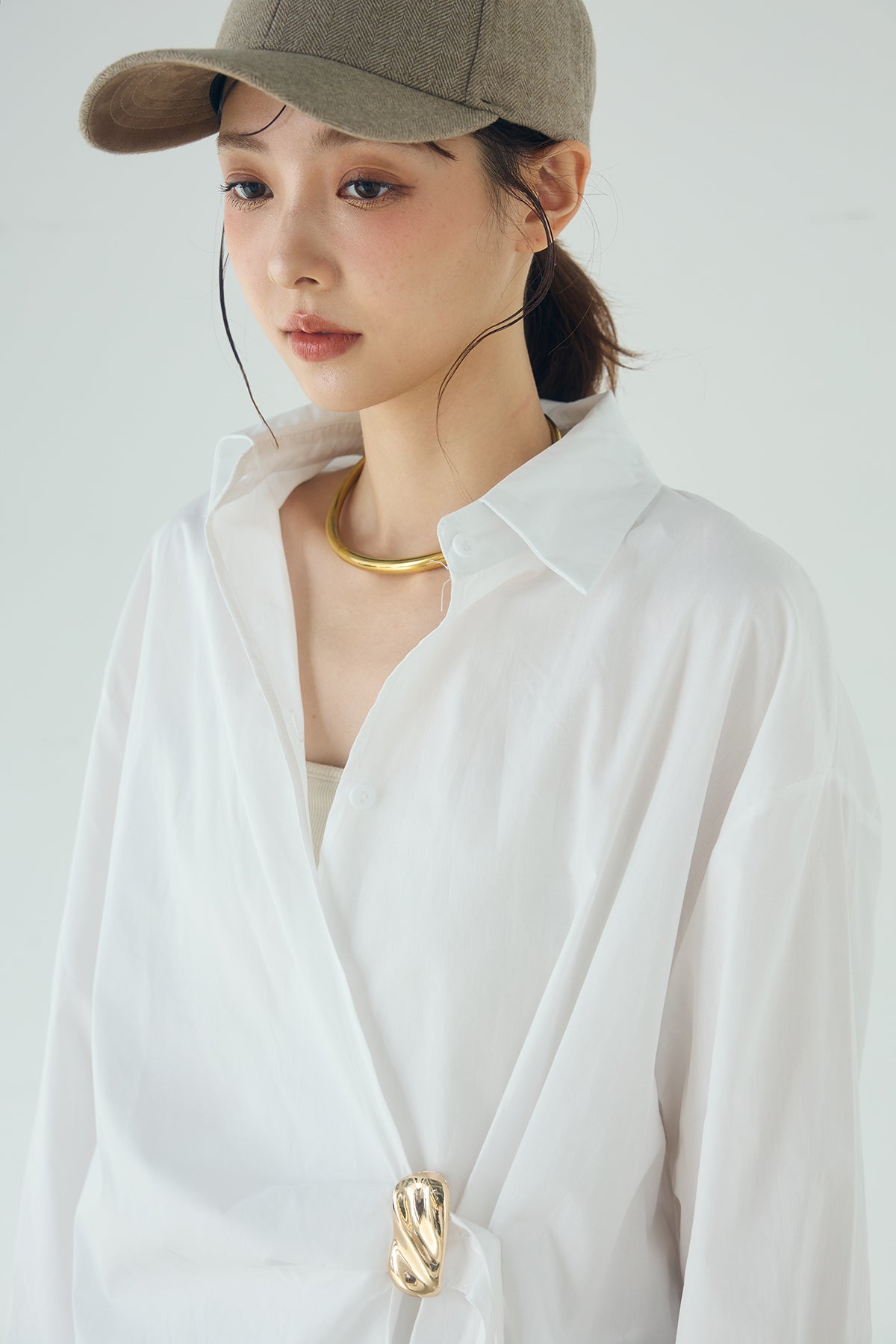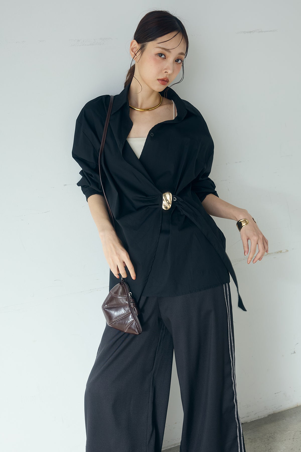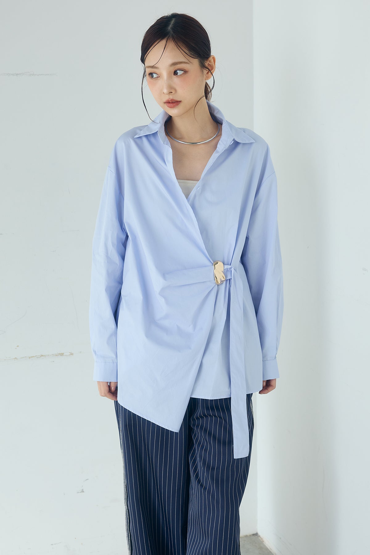 ひとさじのデザインで、印象が変わる一枚。 サイドにあしらった留め具デザインが目を惹くデザインシャツ。ラップ風に重なるフロントが立体感を生み、シンプルながらも動きのあるシルエットを楽しめます。 程よくゆとりのあるサイズ感と長めの着丈が、自然な抜け感をプラス。シャープな襟元とのバランスが整い、きちんと感と軽やかさを兼ね備えた仕上がりです。 パンツスタイルはもちろん、スカートやワイドボトムとも相性が良く、合わせるアイテム次第で印象を変えられるのも魅力。日常からお出かけまで幅広く取り入れやすい一着です。