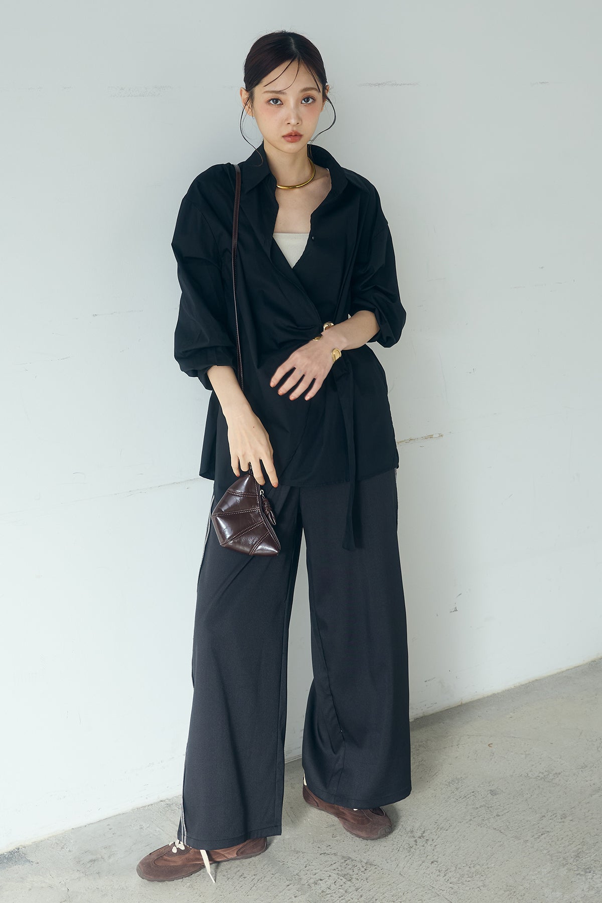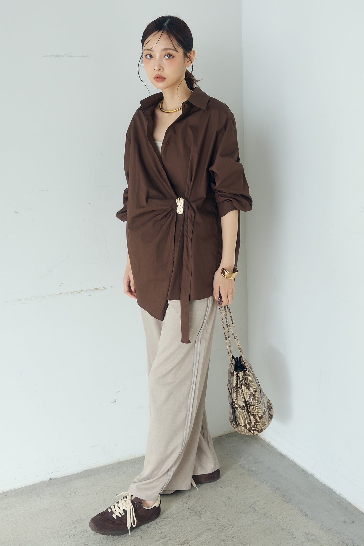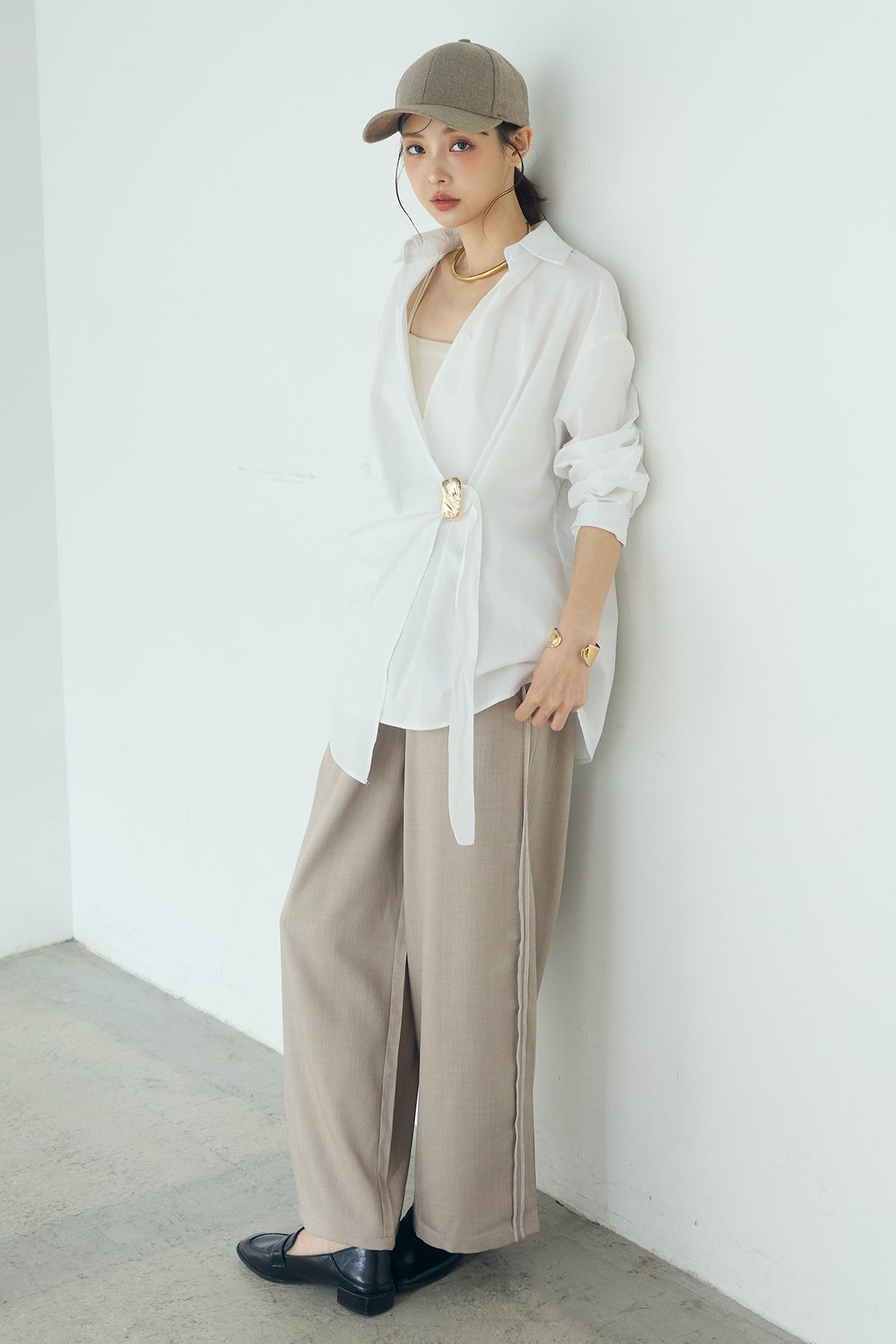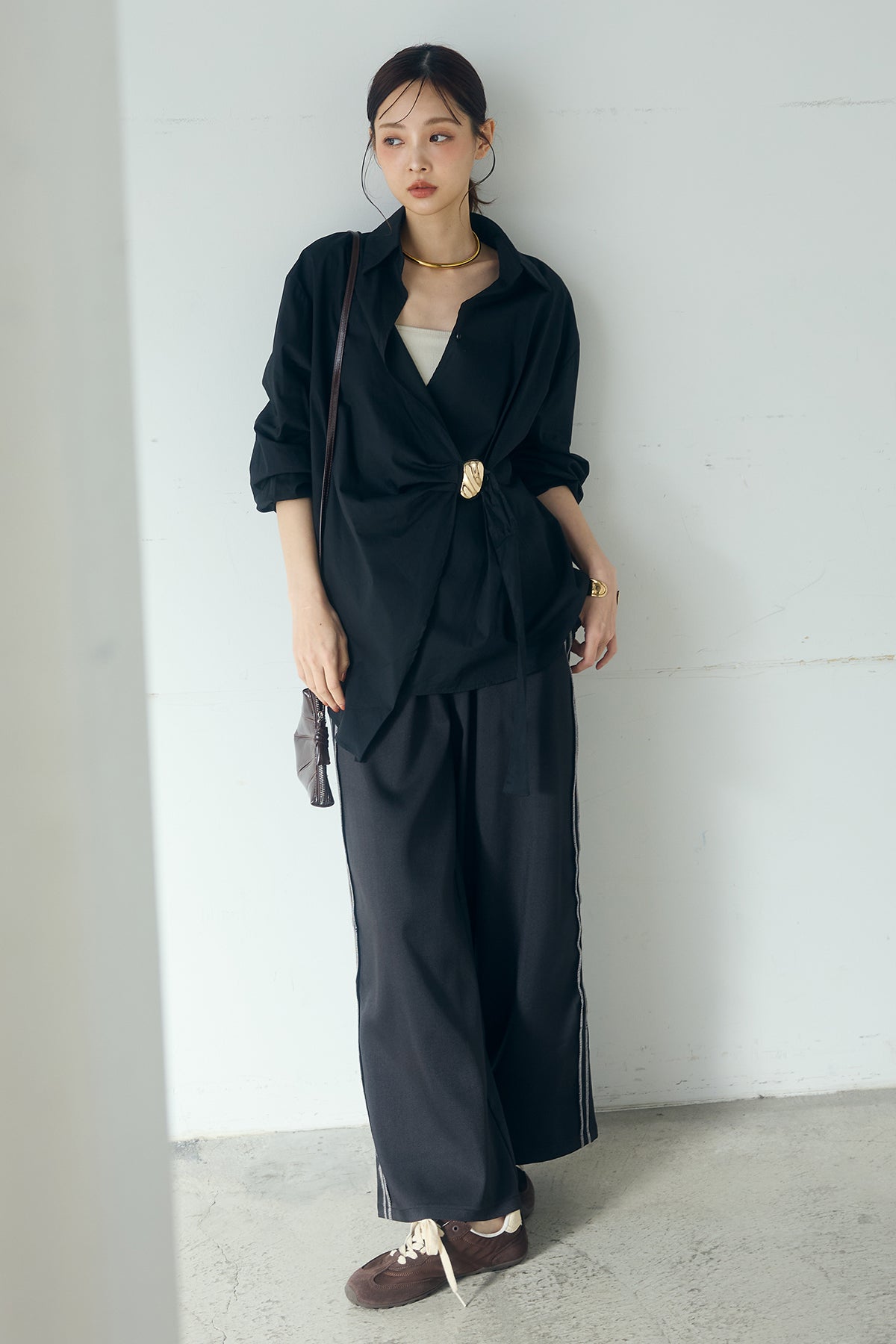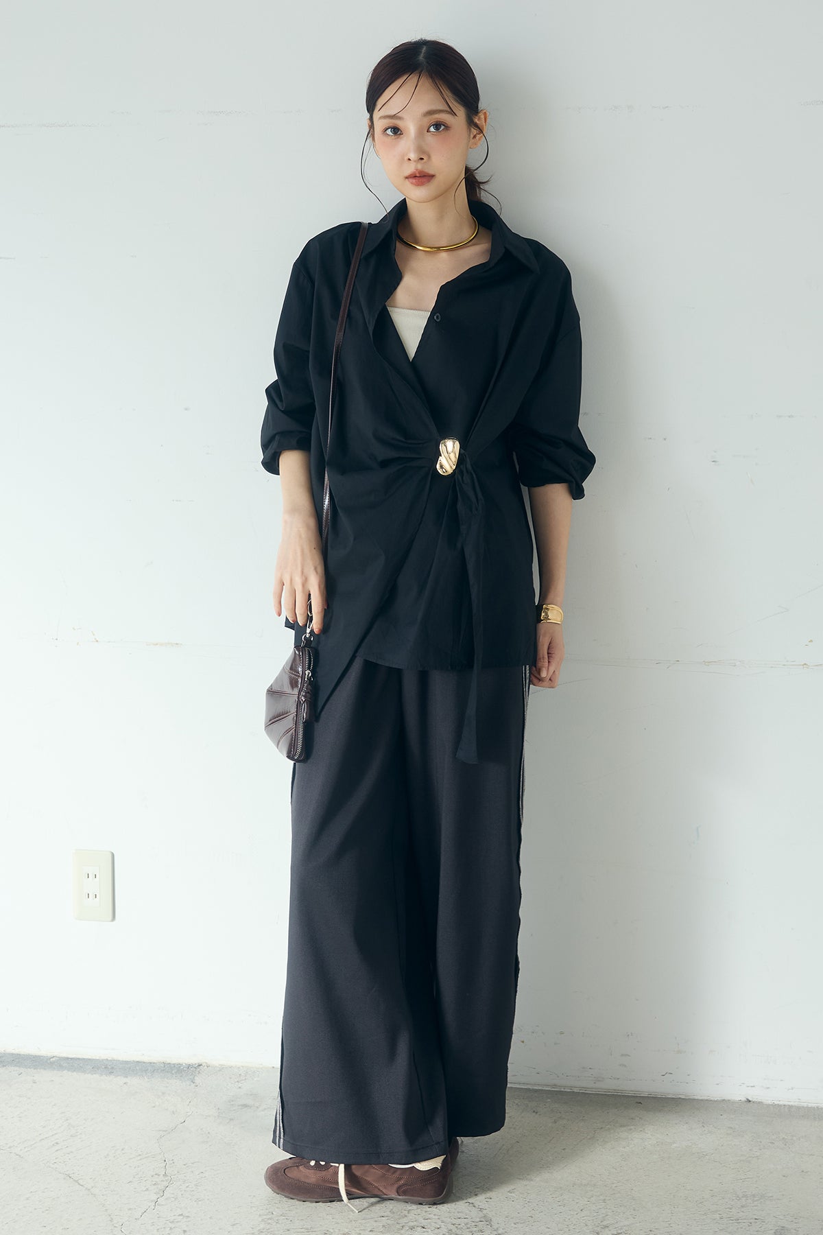 ひとさじのデザインで、印象が変わる一枚。 サイドにあしらった留め具デザインが目を惹くデザインシャツ。ラップ風に重なるフロントが立体感を生み、シンプルながらも動きのあるシルエットを楽しめます。 程よくゆとりのあるサイズ感と長めの着丈が、自然な抜け感をプラス。シャープな襟元とのバランスが整い、きちんと感と軽やかさを兼ね備えた仕上がりです。 パンツスタイルはもちろん、スカートやワイドボトムとも相性が良く、合わせるアイテム次第で印象を変えられるのも魅力。日常からお出かけまで幅広く取り入れやすい一着です。
