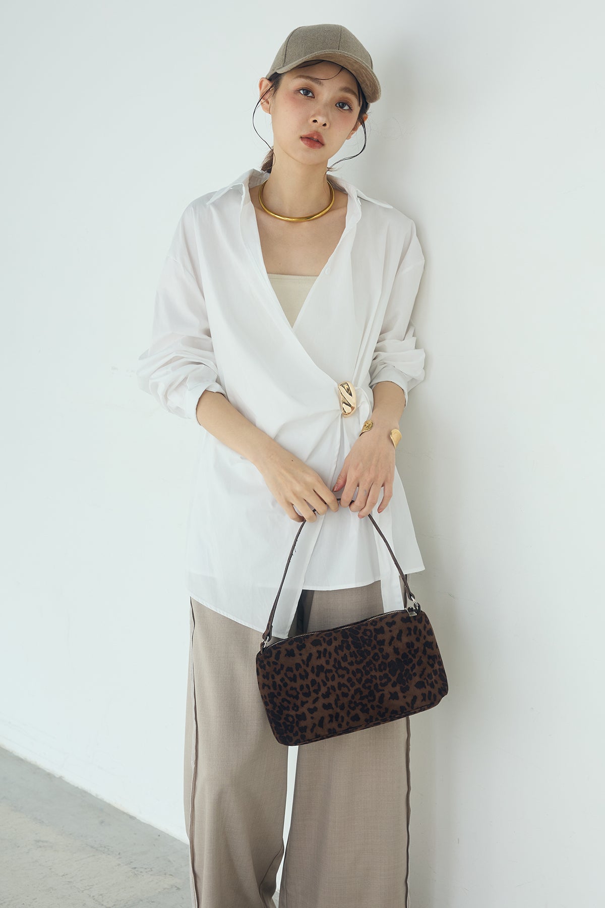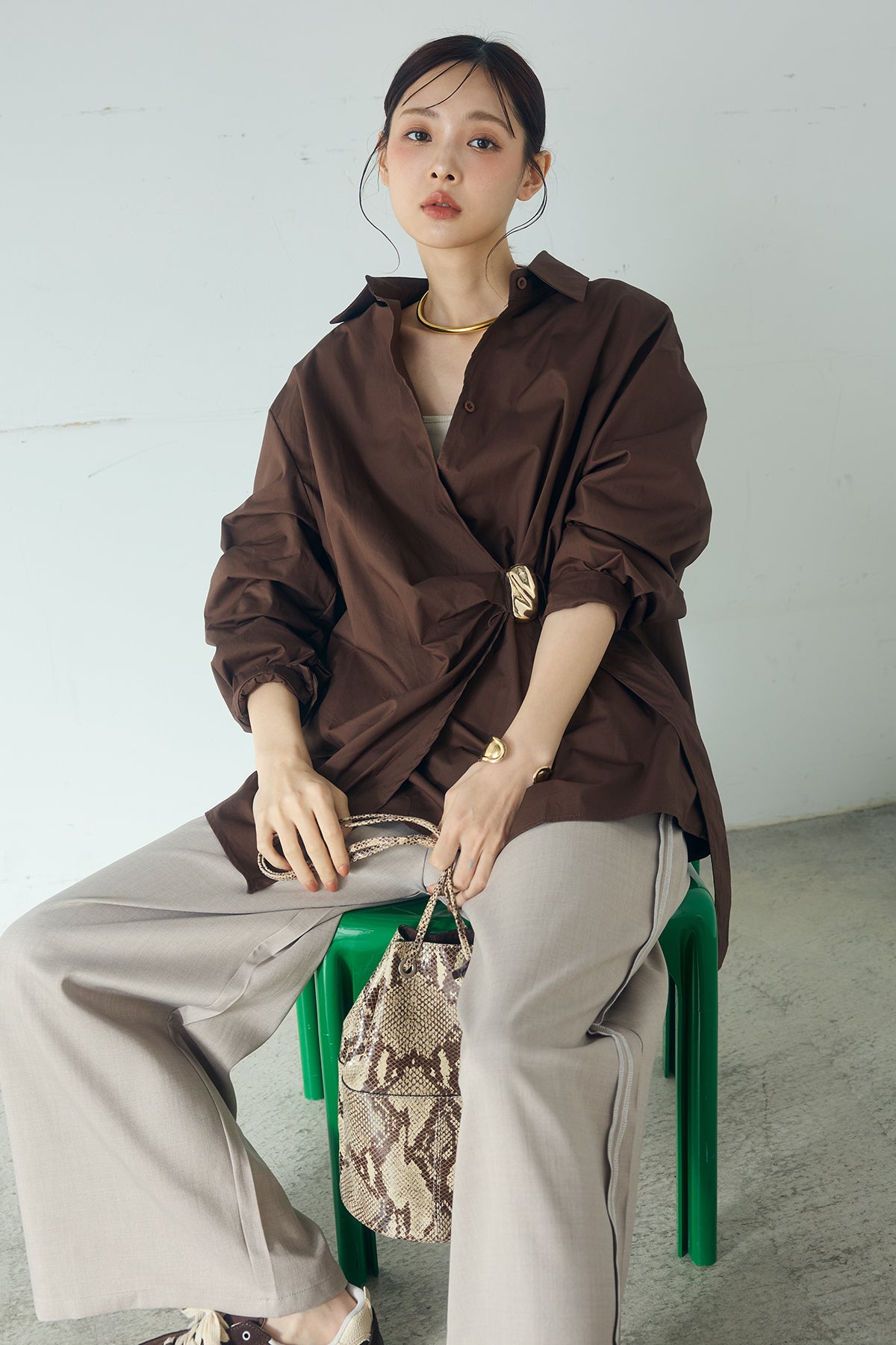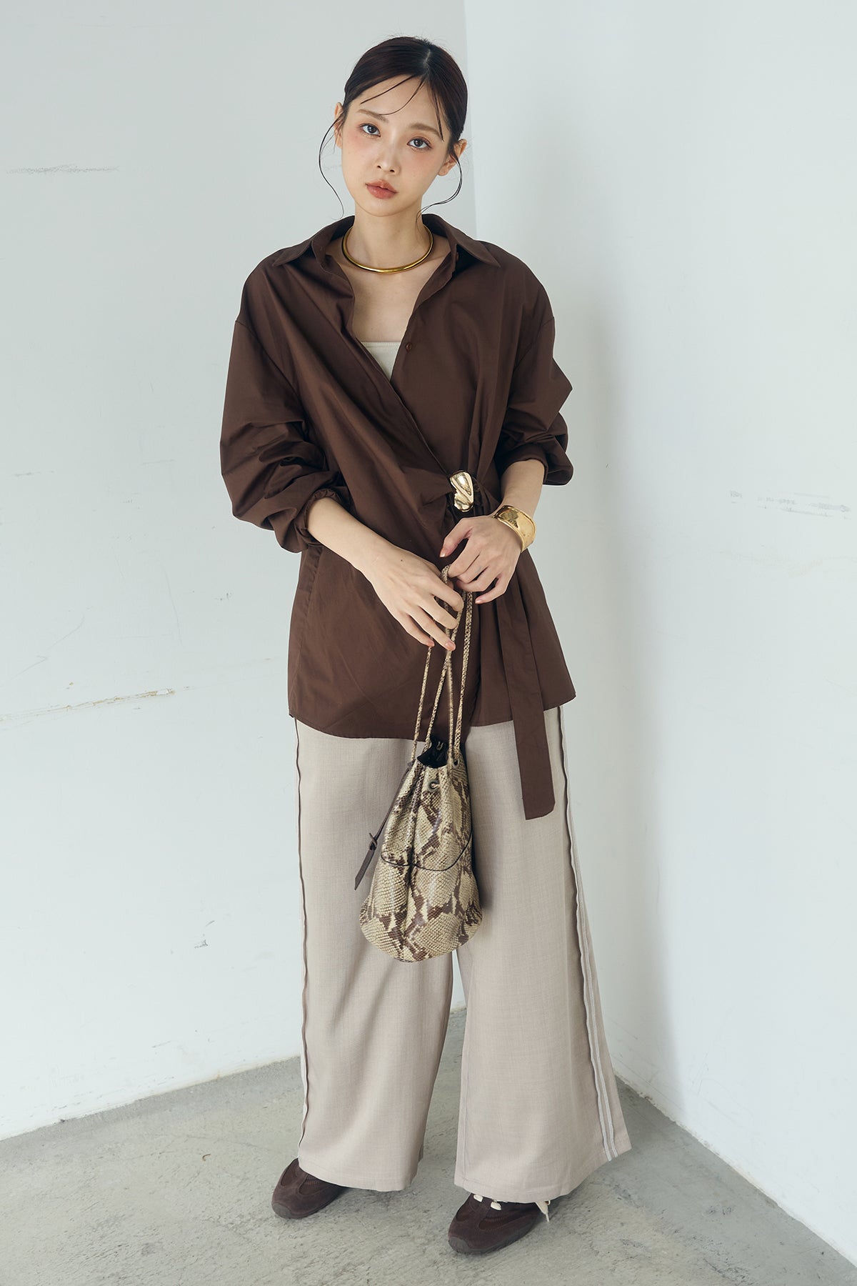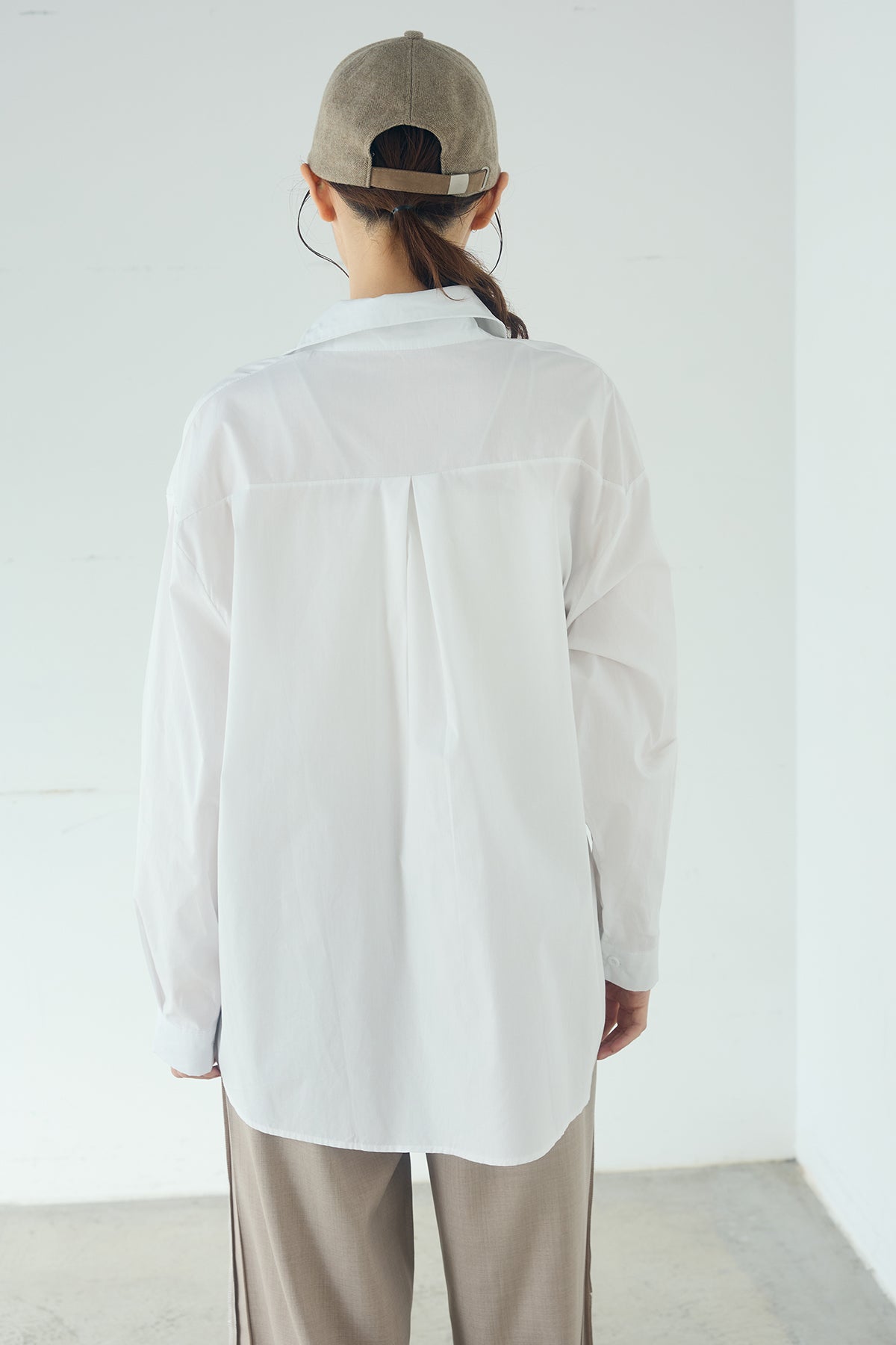 ひとさじのデザインで、印象が変わる一枚。 サイドにあしらった留め具デザインが目を惹くデザインシャツ。ラップ風に重なるフロントが立体感を生み、シンプルながらも動きのあるシルエットを楽しめます。 程よくゆとりのあるサイズ感と長めの着丈が、自然な抜け感をプラス。シャープな襟元とのバランスが整い、きちんと感と軽やかさを兼ね備えた仕上がりです。 パンツスタイルはもちろん、スカートやワイドボトムとも相性が良く、合わせるアイテム次第で印象を変えられるのも魅力。日常からお出かけまで幅広く取り入れやすい一着です。