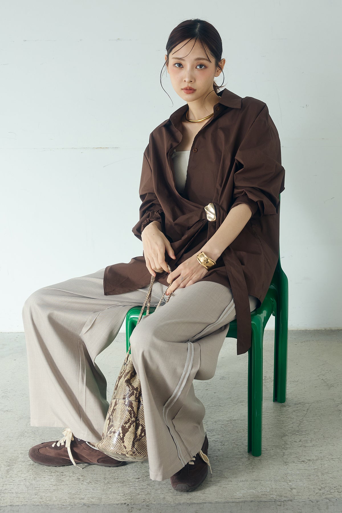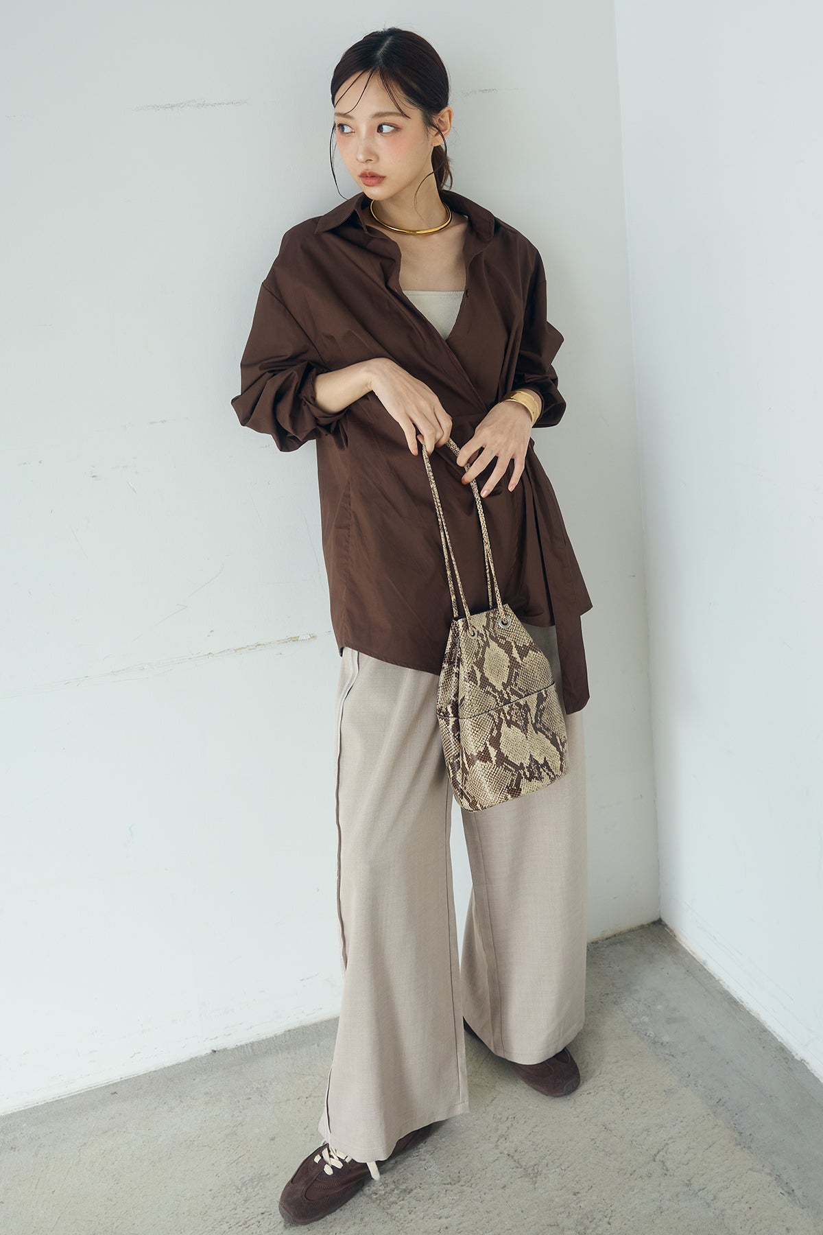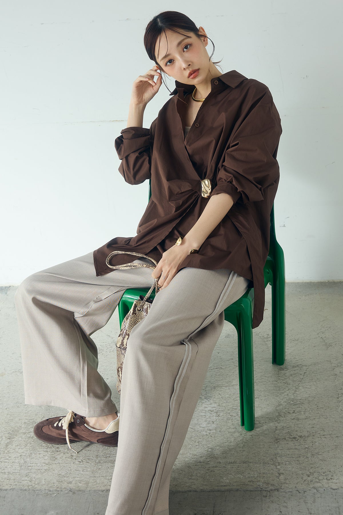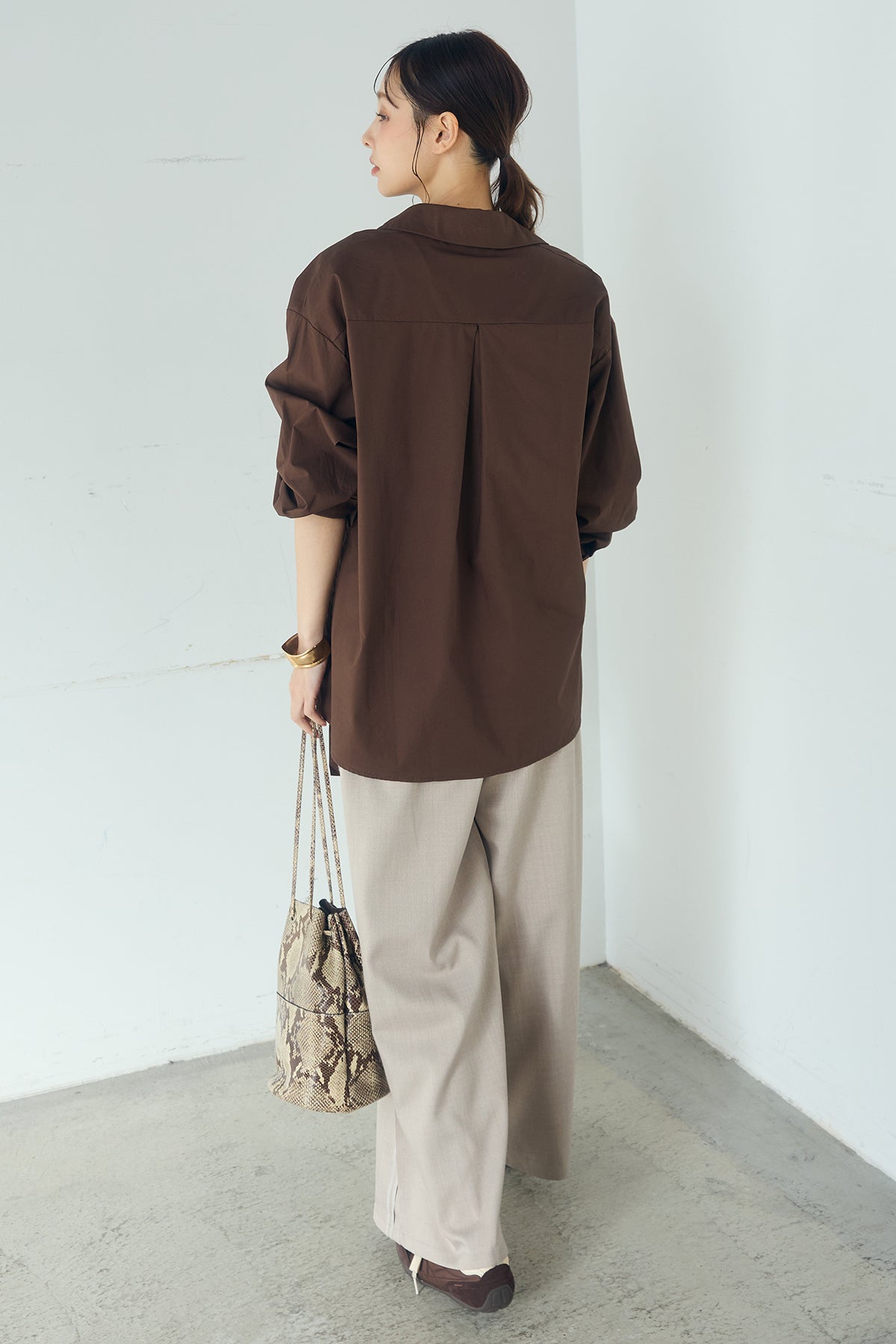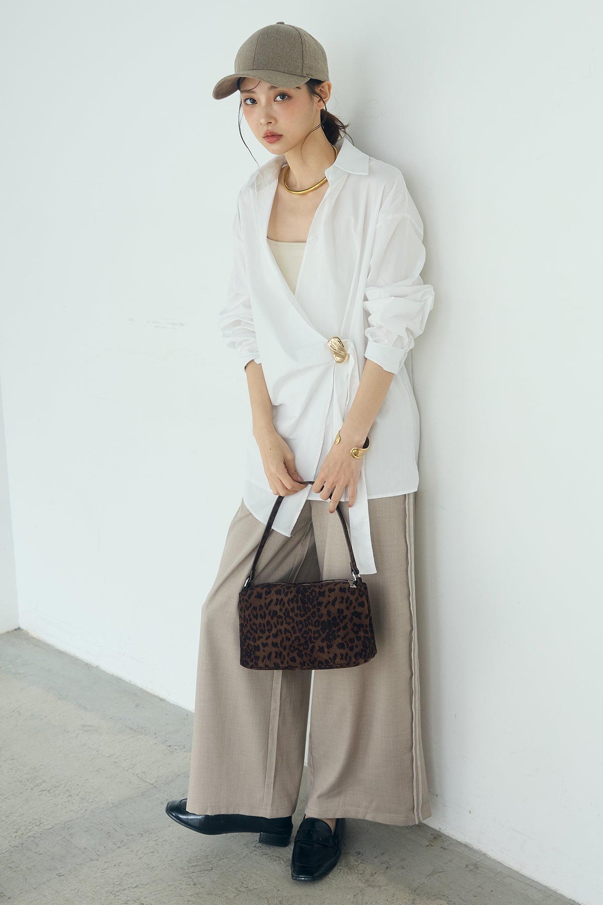 ひとさじのデザインで、印象が変わる一枚。 サイドにあしらった留め具デザインが目を惹くデザインシャツ。ラップ風に重なるフロントが立体感を生み、シンプルながらも動きのあるシルエットを楽しめます。 程よくゆとりのあるサイズ感と長めの着丈が、自然な抜け感をプラス。シャープな襟元とのバランスが整い、きちんと感と軽やかさを兼ね備えた仕上がりです。 パンツスタイルはもちろん、スカートやワイドボトムとも相性が良く、合わせるアイテム次第で印象を変えられるのも魅力。日常からお出かけまで幅広く取り入れやすい一着です。