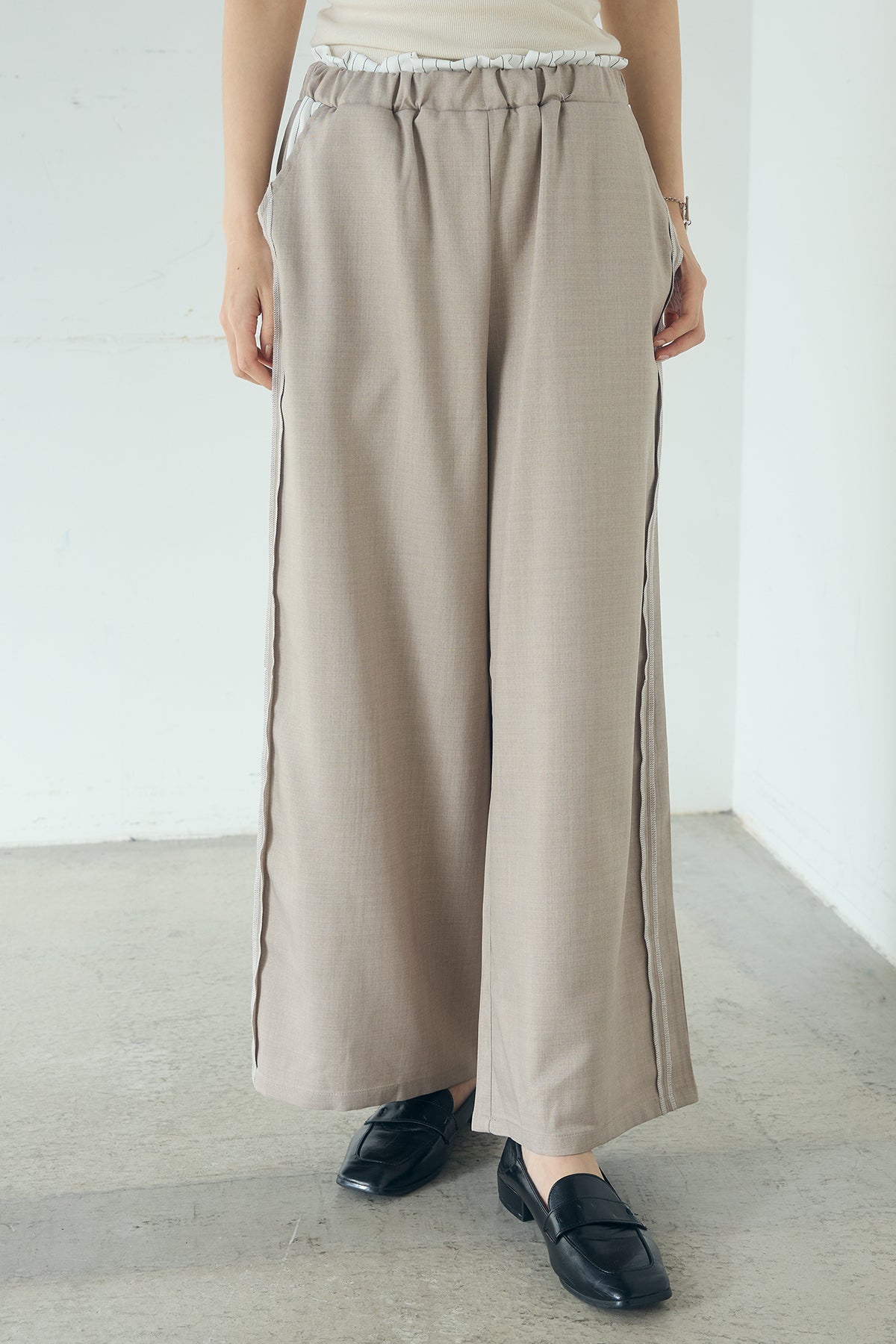 リラックス感ときちんと見えを両立した、大人のイージーパンツ。 ほどよく落ち感のある素材が魅力のトラックイージーパンツ。ゆとりを持たせたストレートシルエットが自然な抜け感を生み、ラフになりすぎず洗練された印象に仕上がります。 サイドにあしらったラインデザインがさりげないアクセントとなり、シンプルなトップスと合わせるだけでもバランスの整ったスタイリングに。ウエストはイージー仕様で快適な穿き心地を叶え、日常使いにも取り入れやすい一本です。 シャツやジャケットを合わせたきれいめな装いから、ニットやスウェットとのリラックススタイルまで幅広く活躍。季節を問わず取り入れやすい着回し力の高いアイテムです。