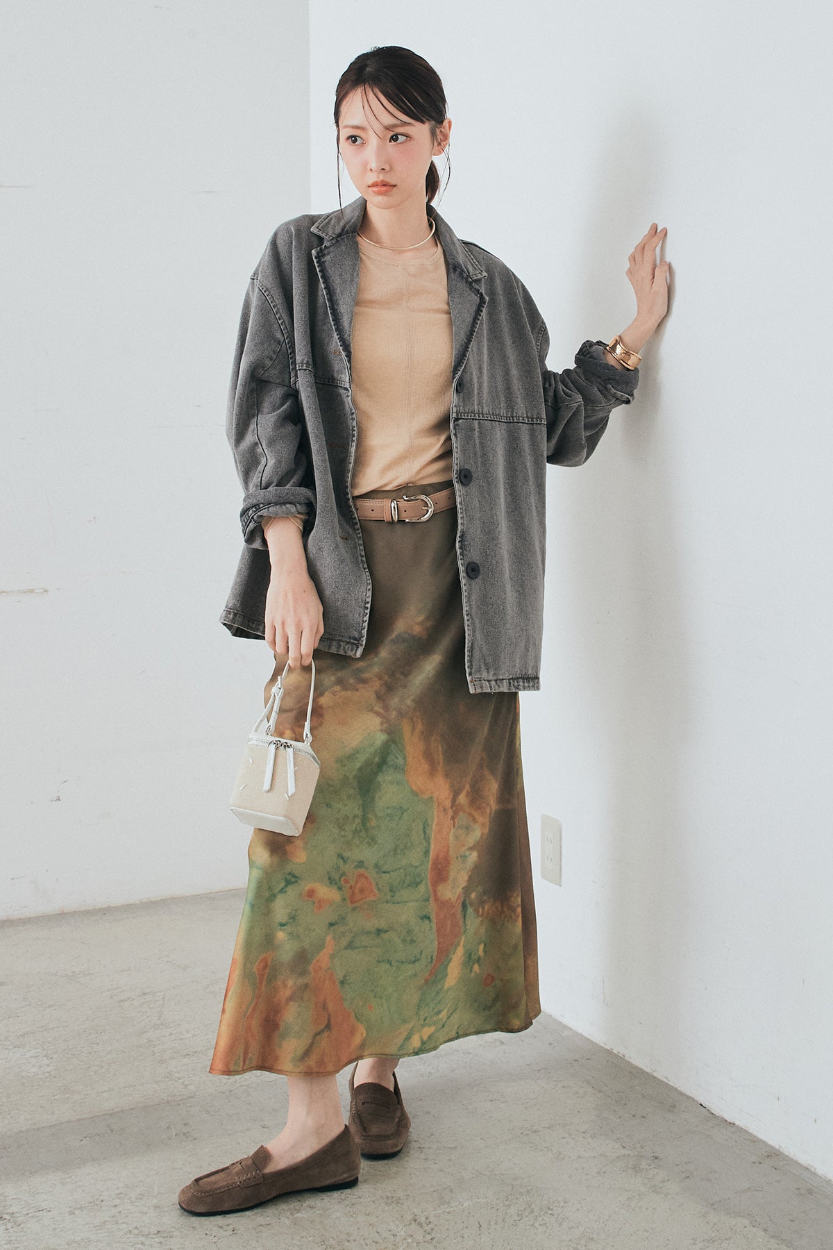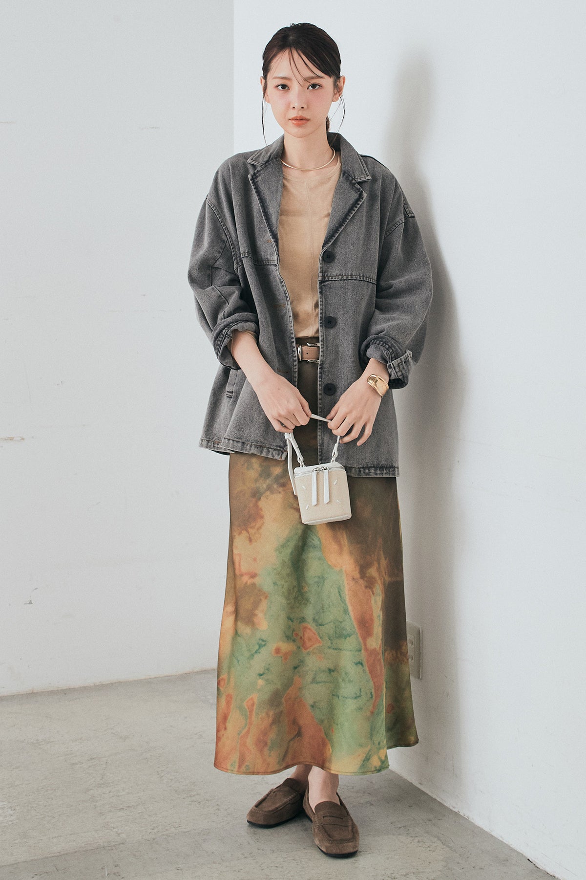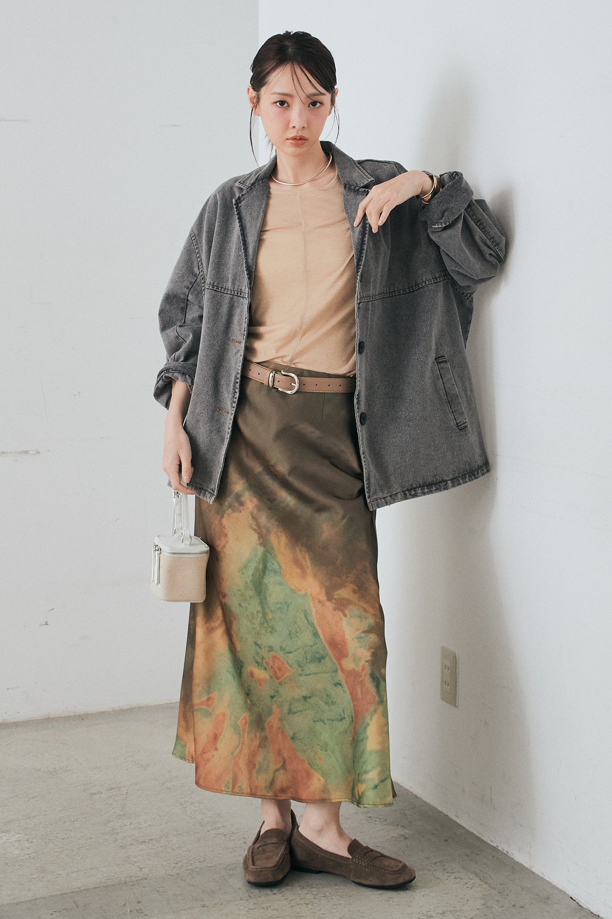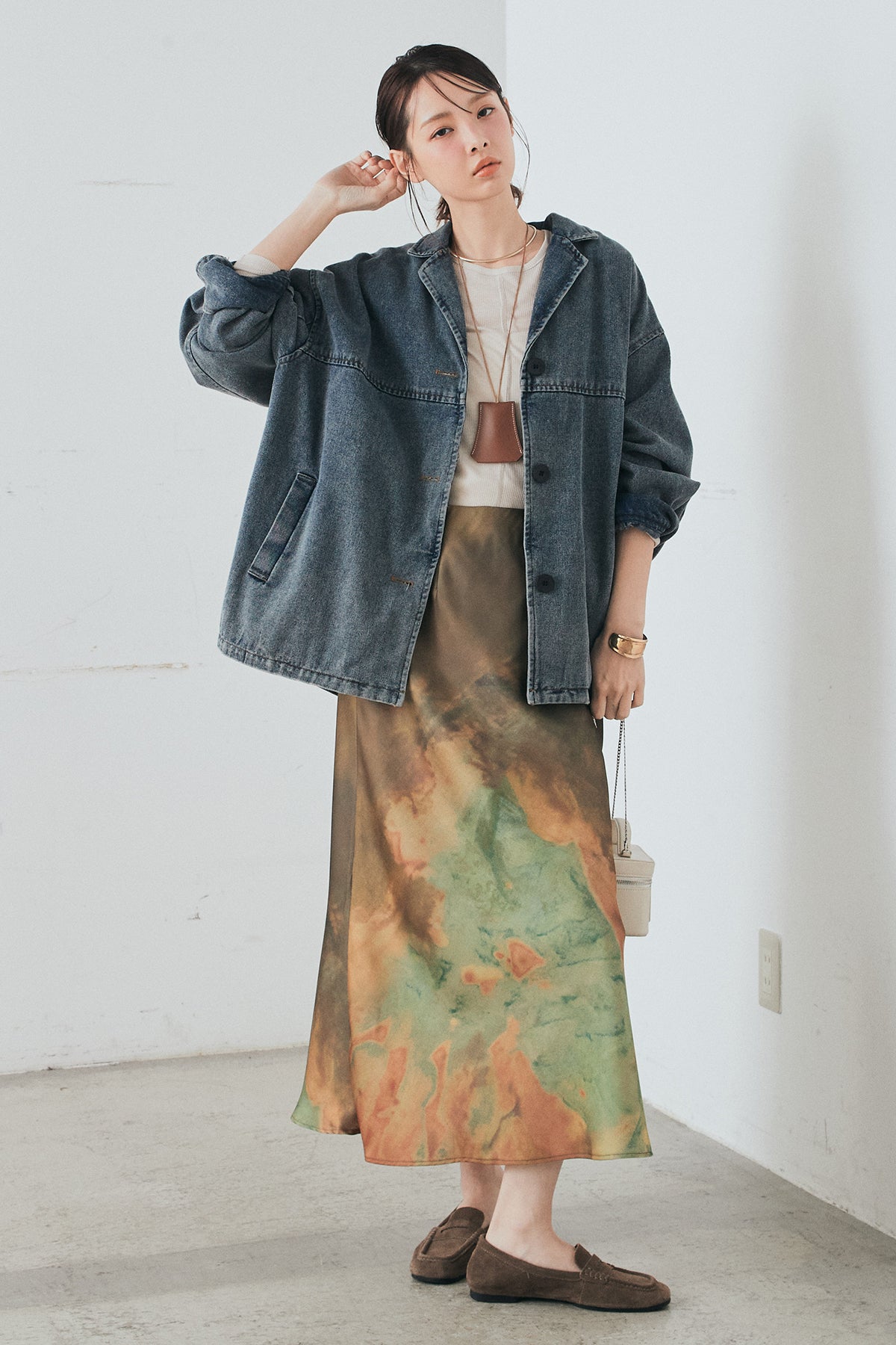 [SET]オーバーデニムジャケット+ニュアンス柄サテンスカート(2set)