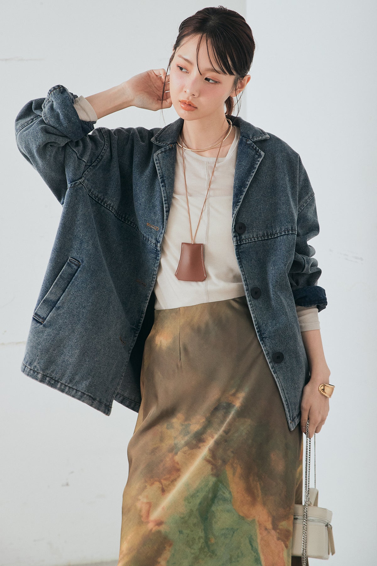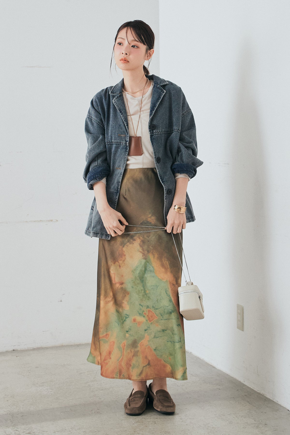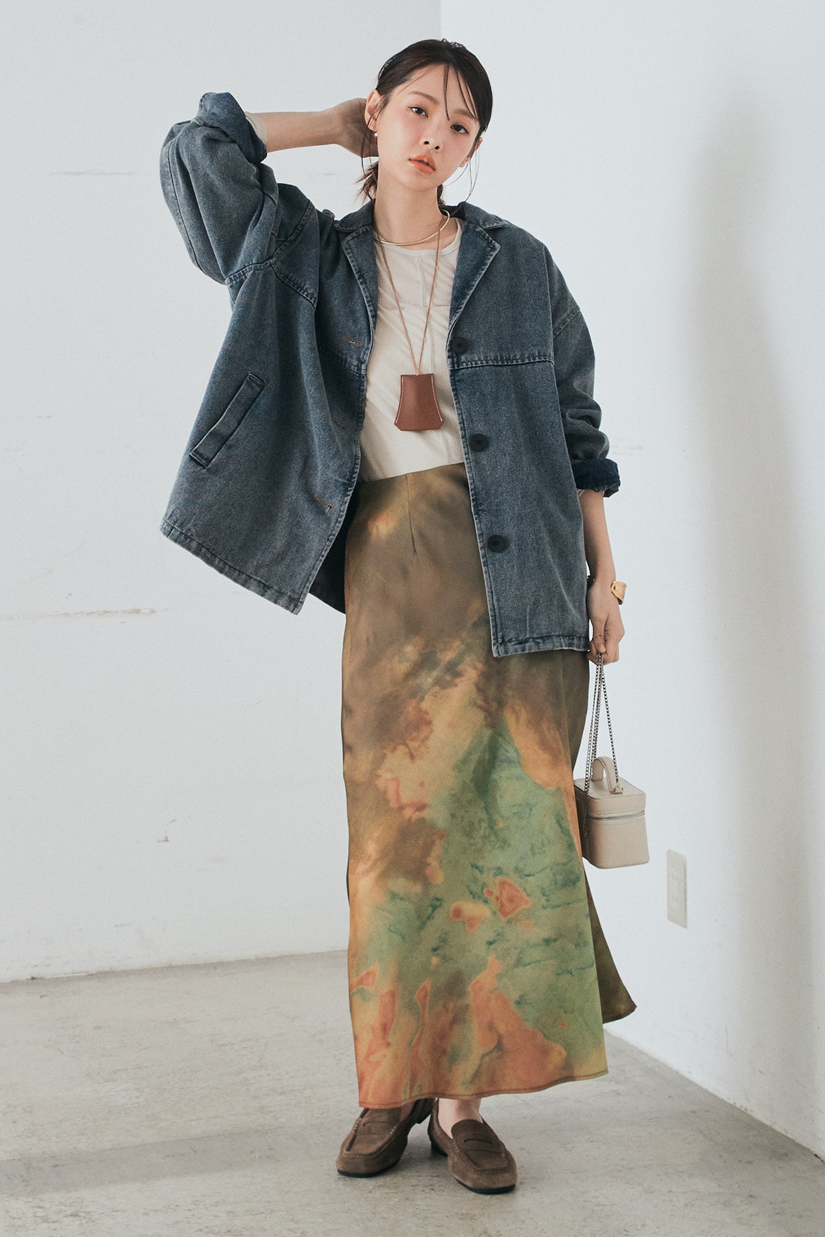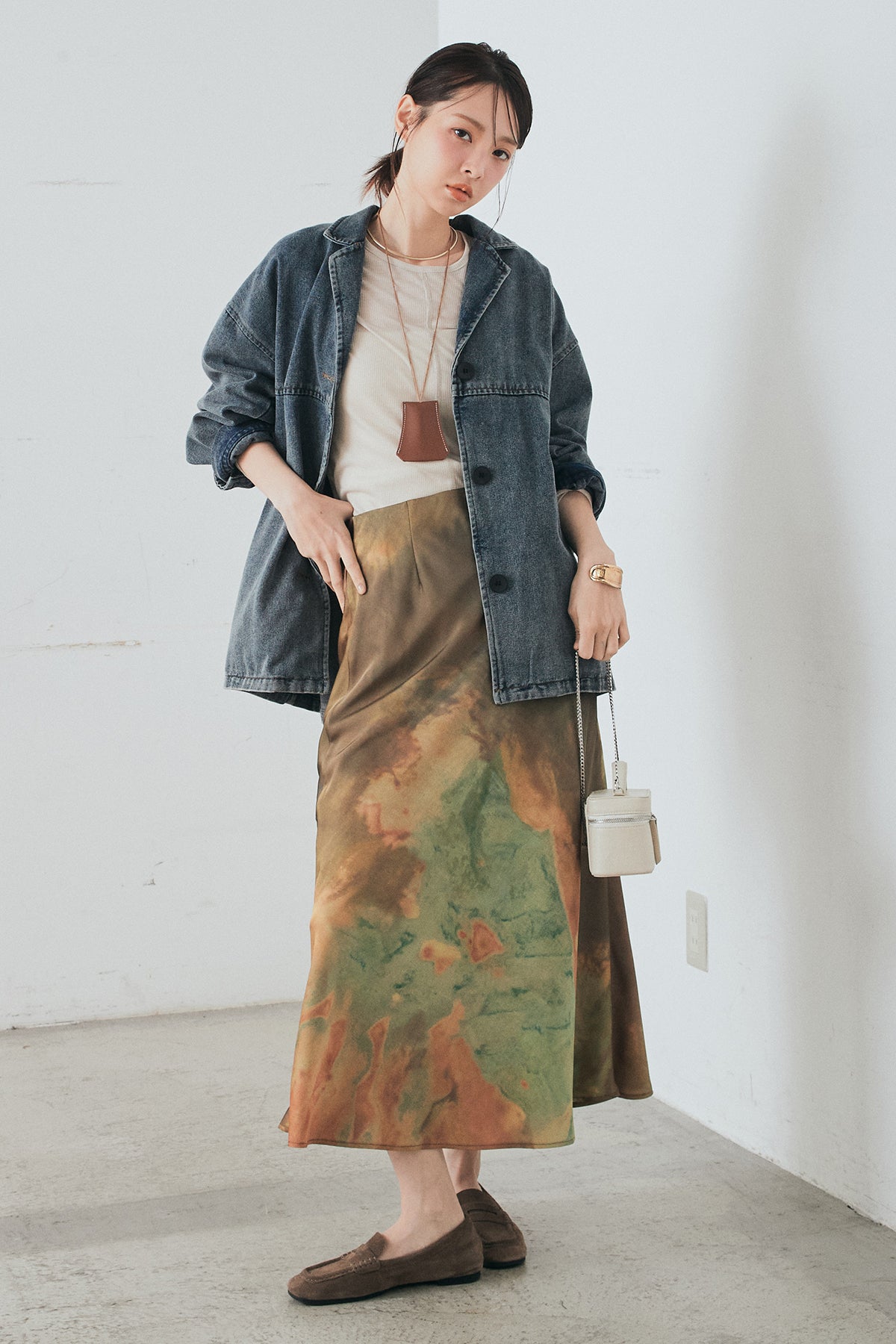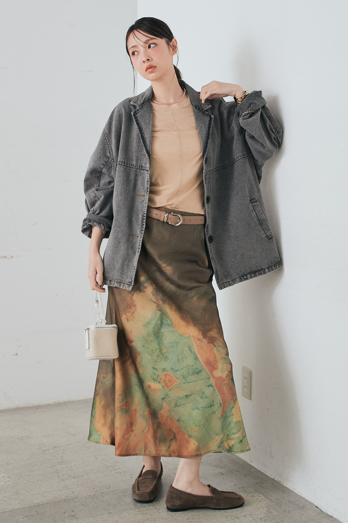 [SET]オーバーデニムジャケット+ニュアンス柄サテンスカート(2set)
