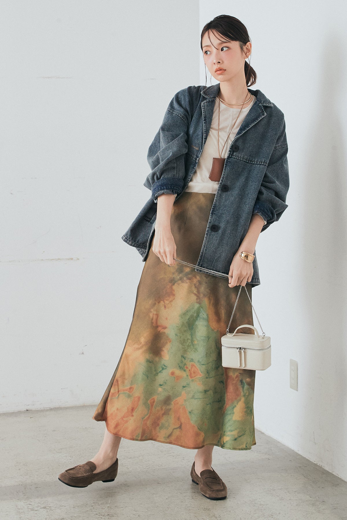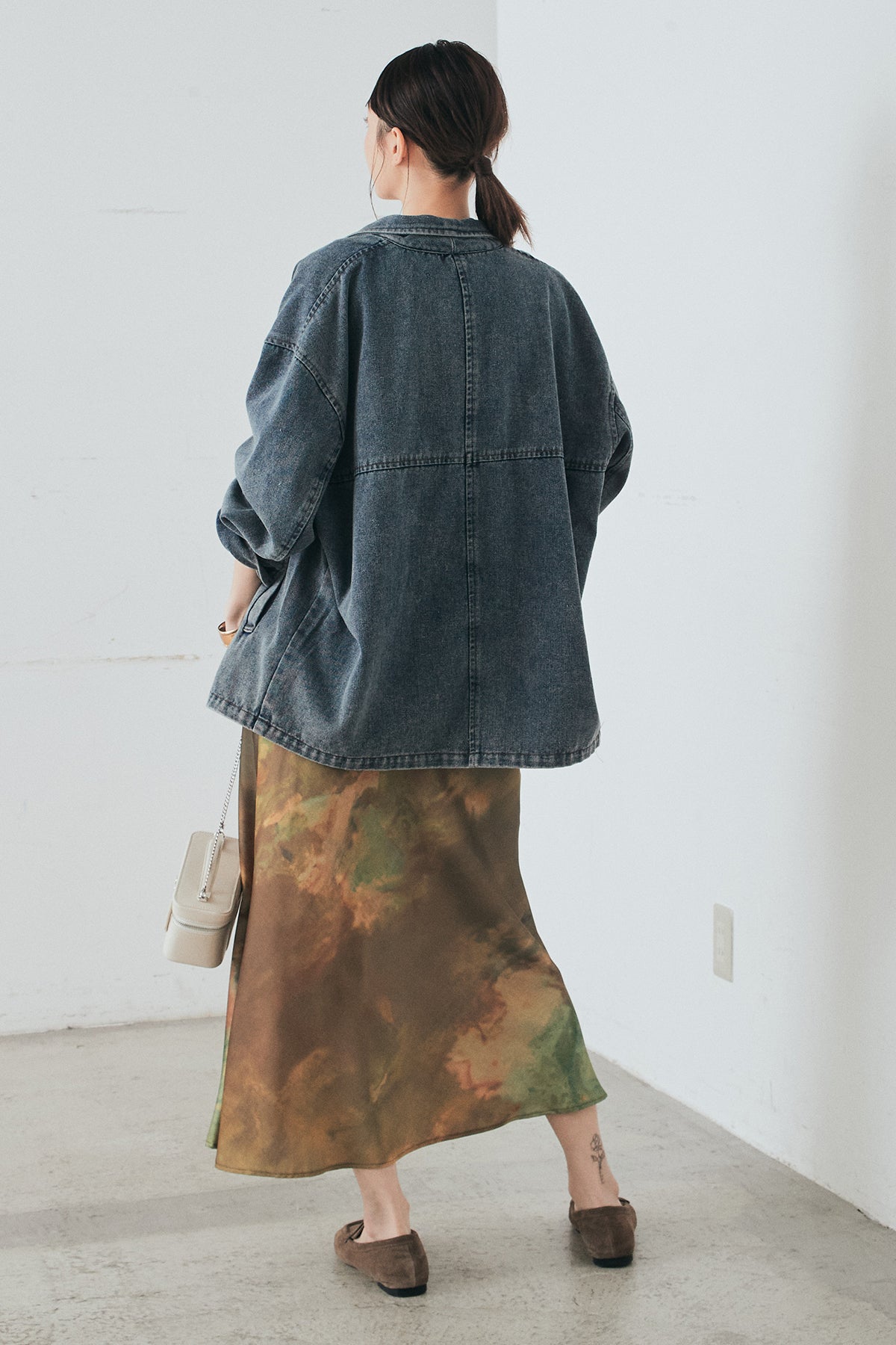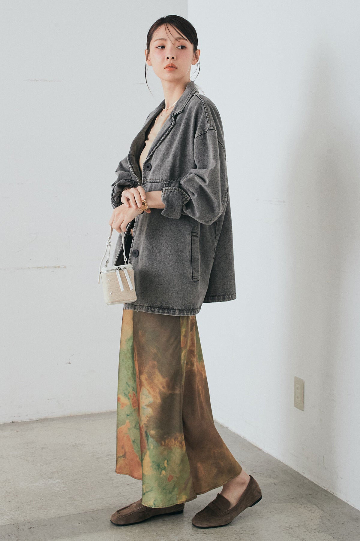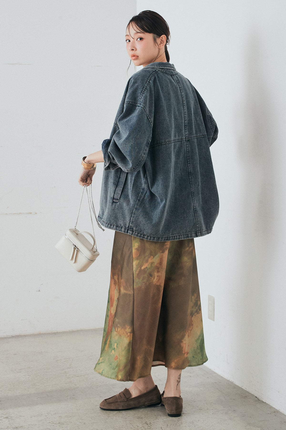 [SET]オーバーデニムジャケット+ニュアンス柄サテンスカート(2set)