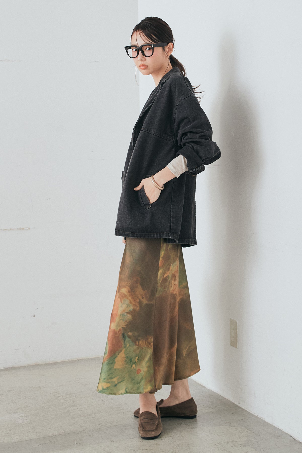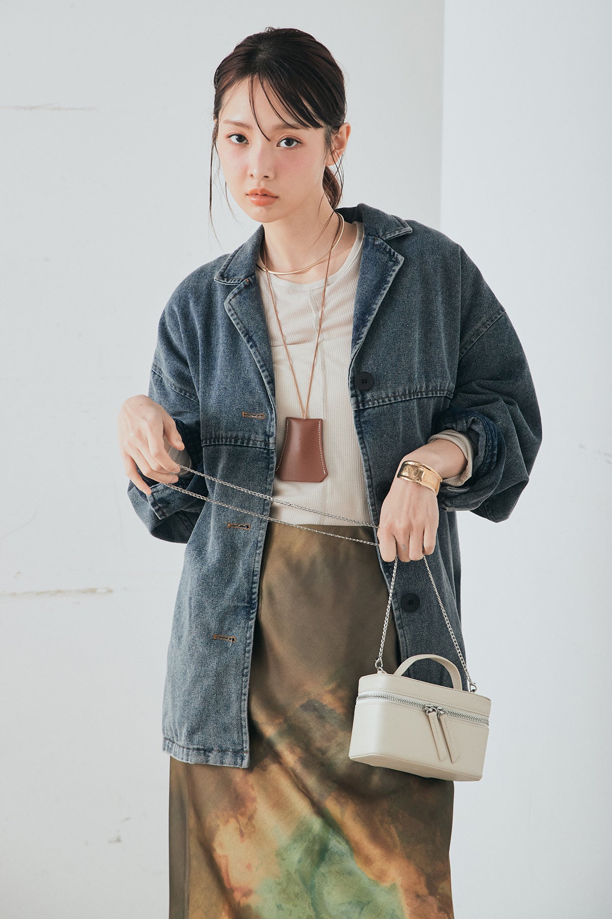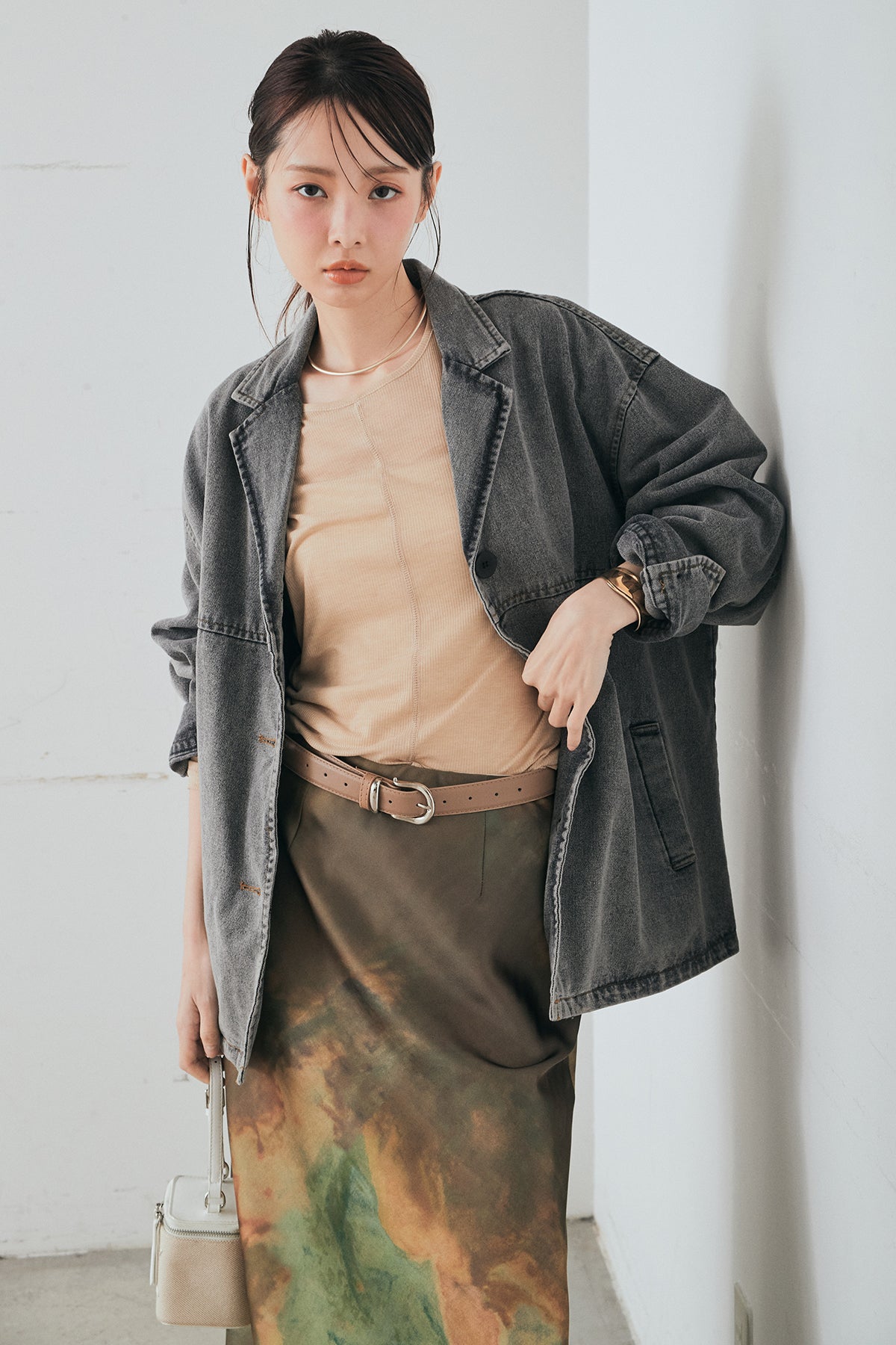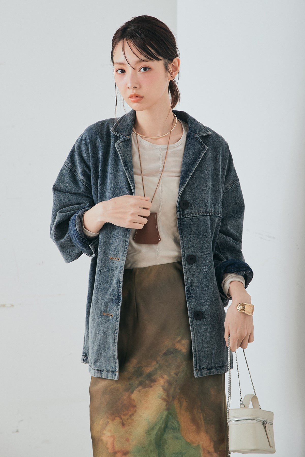 [SET]オーバーデニムジャケット+ニュアンス柄サテンスカート(2set)