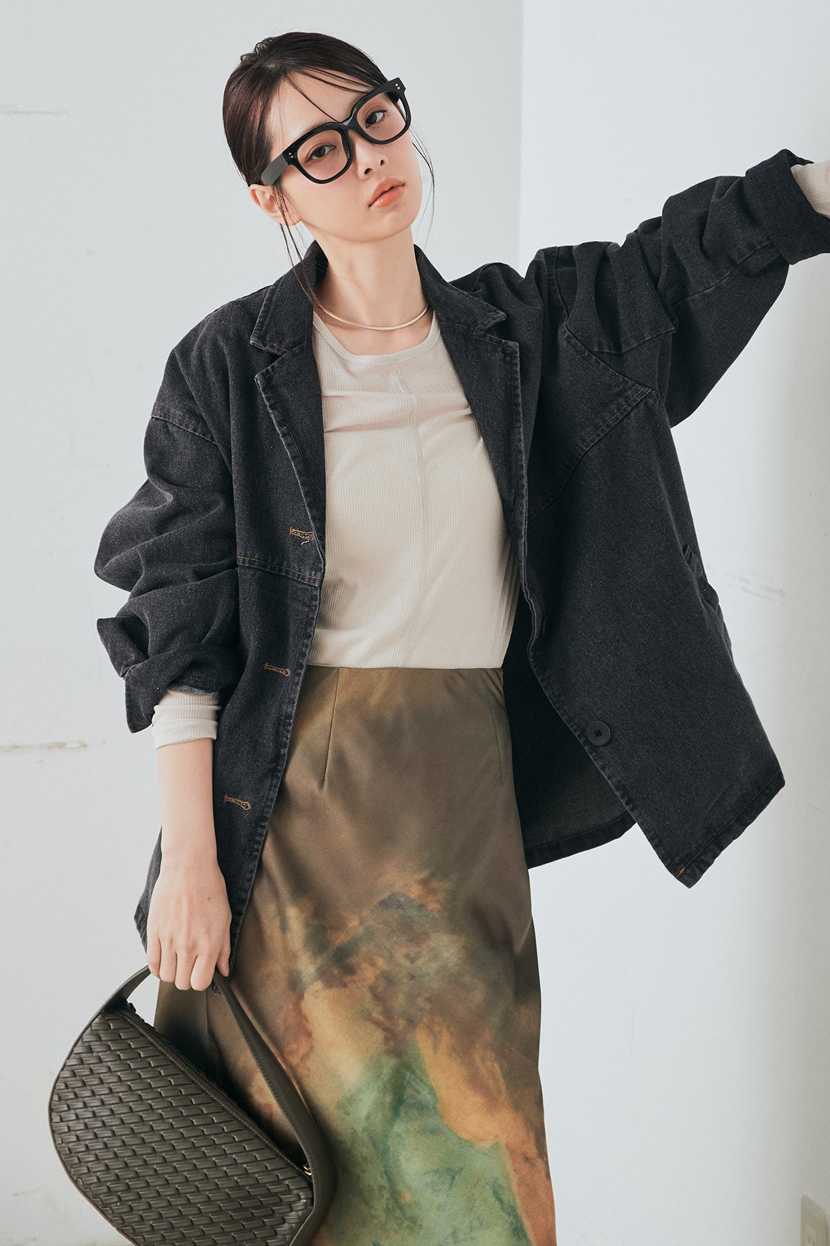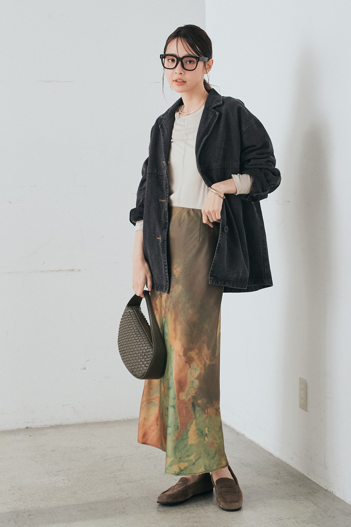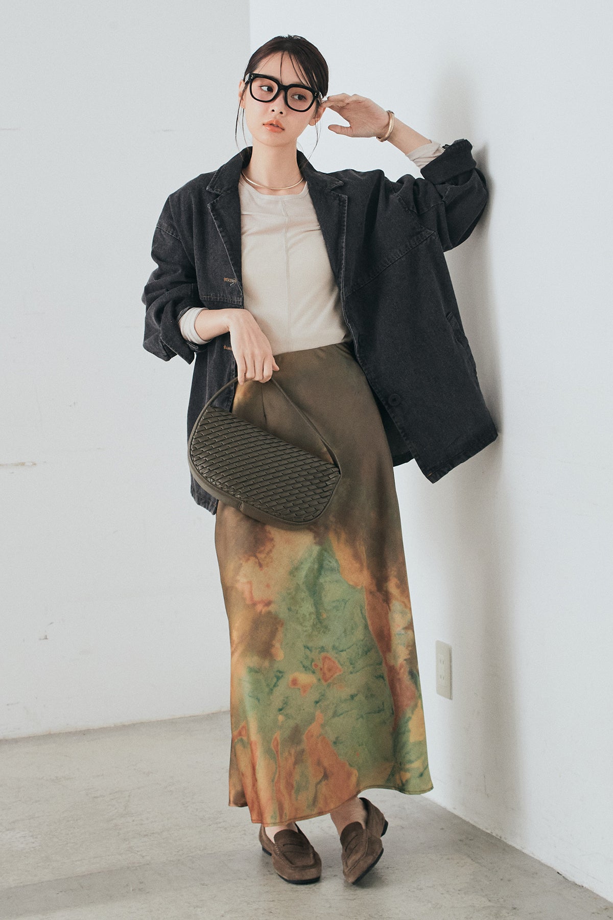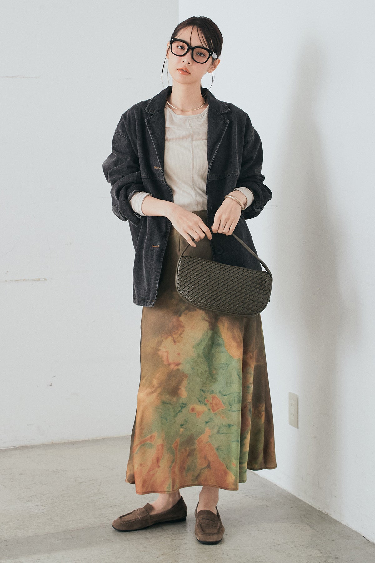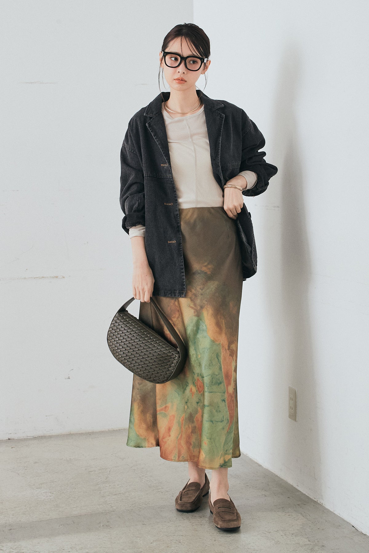 [SET]オーバーデニムジャケット+ニュアンス柄サテンスカート(2set)
