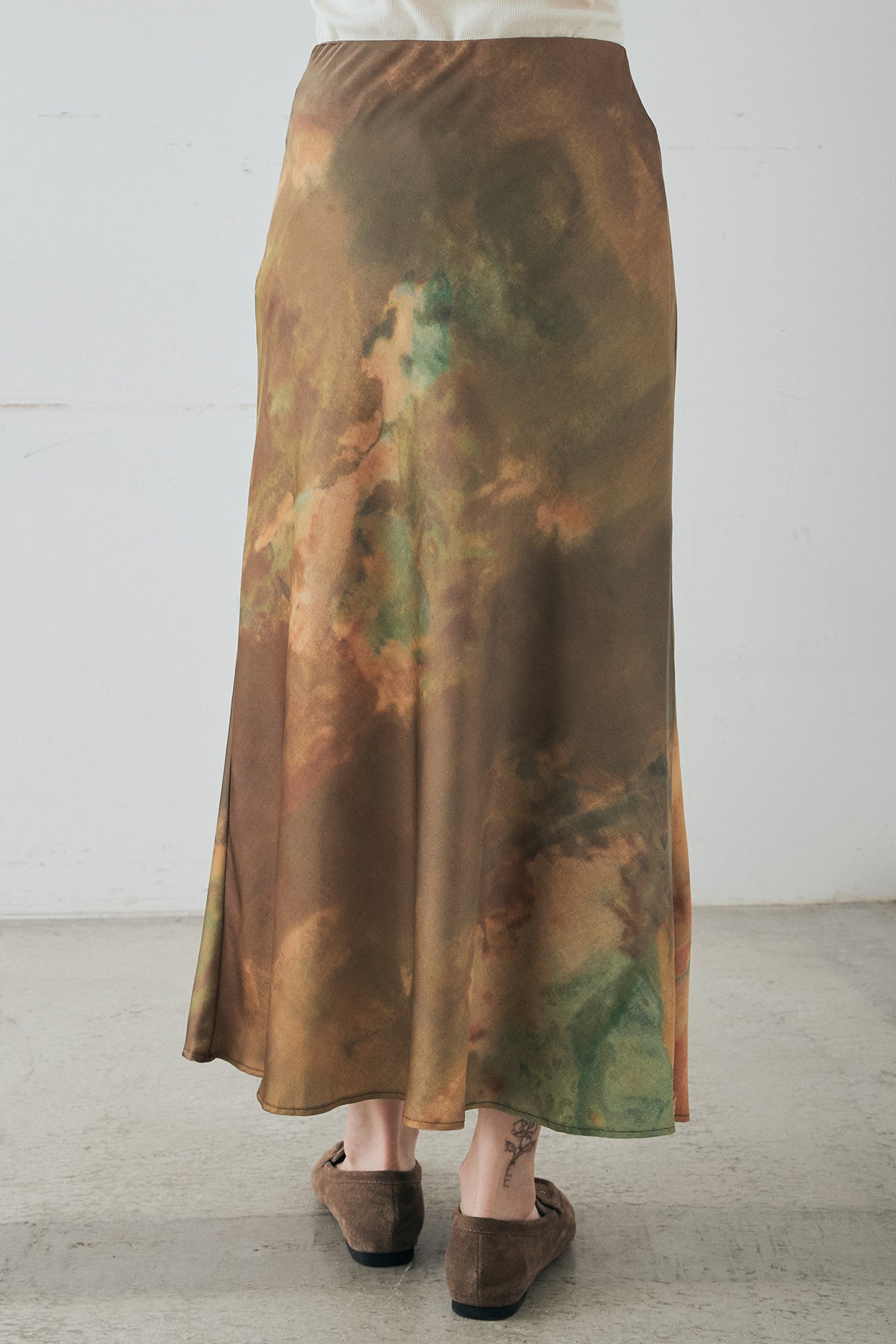 ニュアンス感のある柄が目を惹くサテンスカート。 なめらかな光沢素材が上品な印象を添え、落ち感のあるシルエットがすっきりとした縦ラインを描きます。存在感のあるデザインながらも、落ち着いたトーンでスタイリングに自然と馴染む一枚。 シンプルなトップスと合わせるだけでバランスよくまとまり、コーディネートの主役になるアイテムです。
