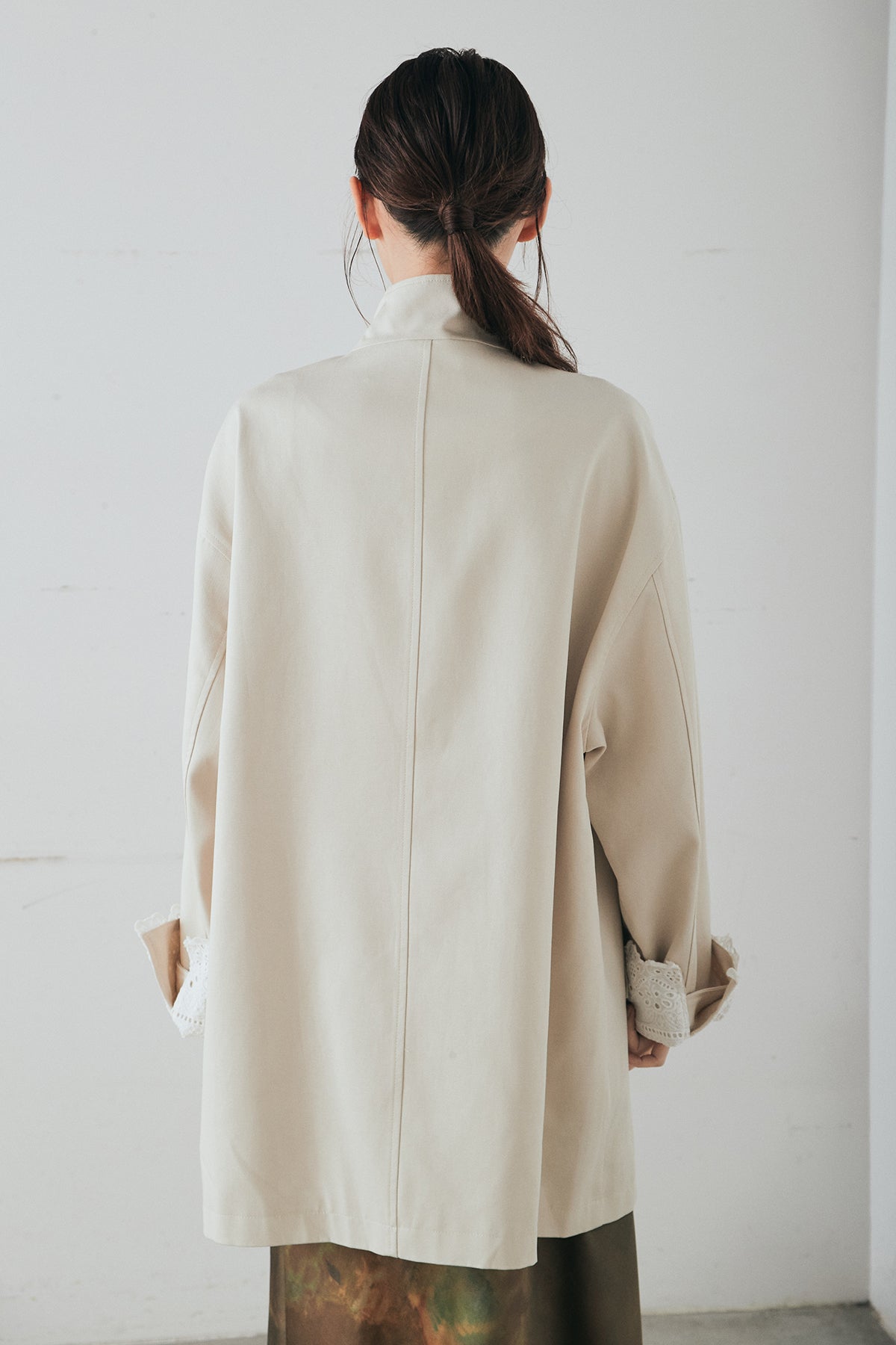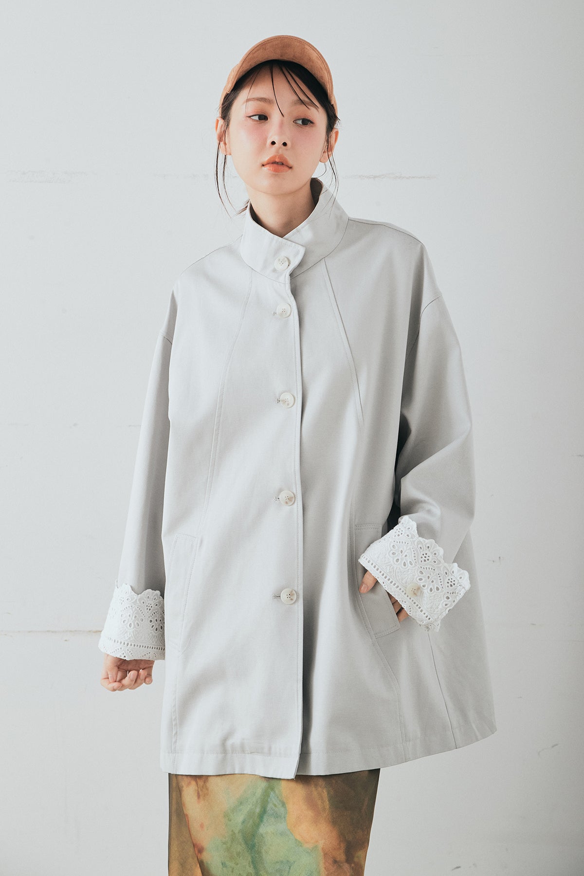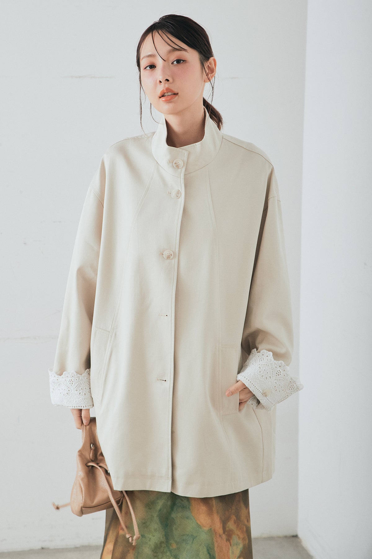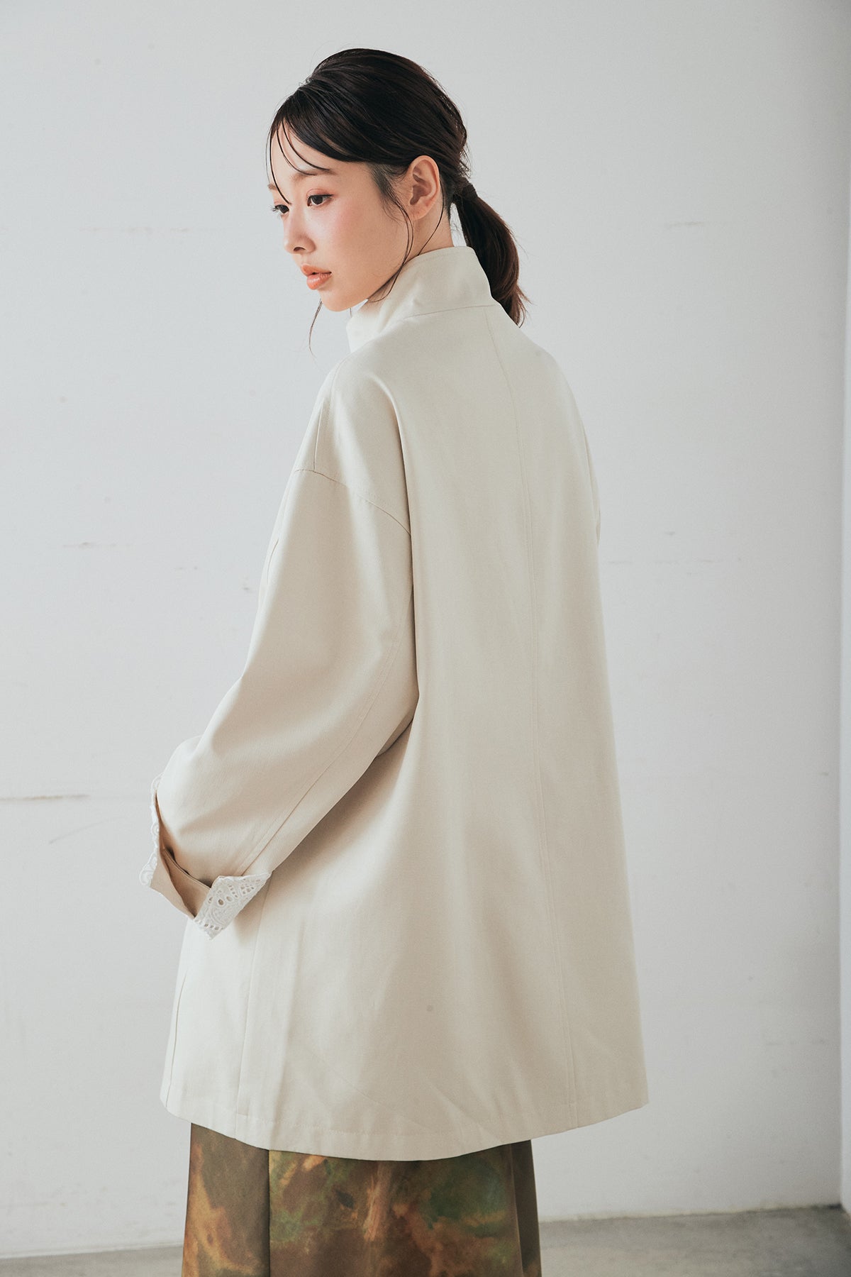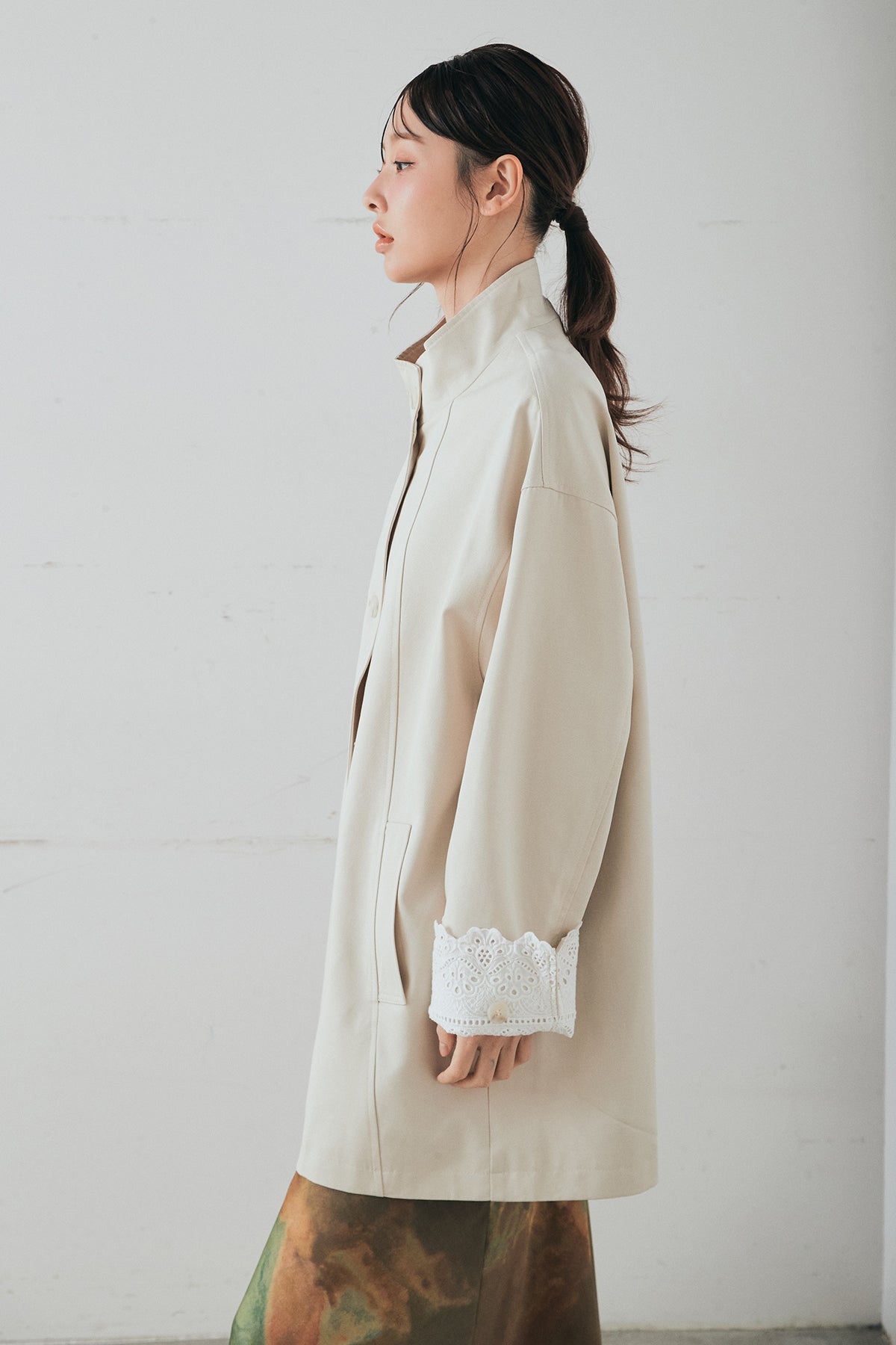 袖の折り返しにあしらったレースが印象的なデザインアウター。 シンプルなシルエットに繊細なディテールをプラスし、さりげない華やかさを添えた一枚です。ゆとりのあるサイズ感で羽織りやすく、スタンドカラーがすっきりとした印象に。 さらっと羽織るだけでコーディネートに表情を加え、デイリーからきれいめスタイルまで幅広く活躍するアイテムです。