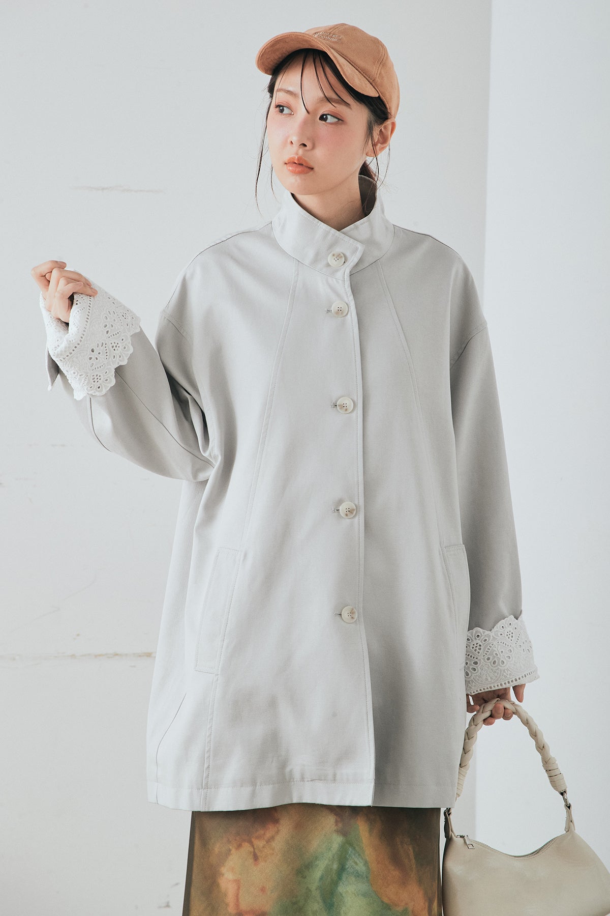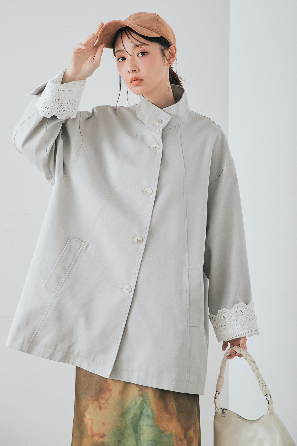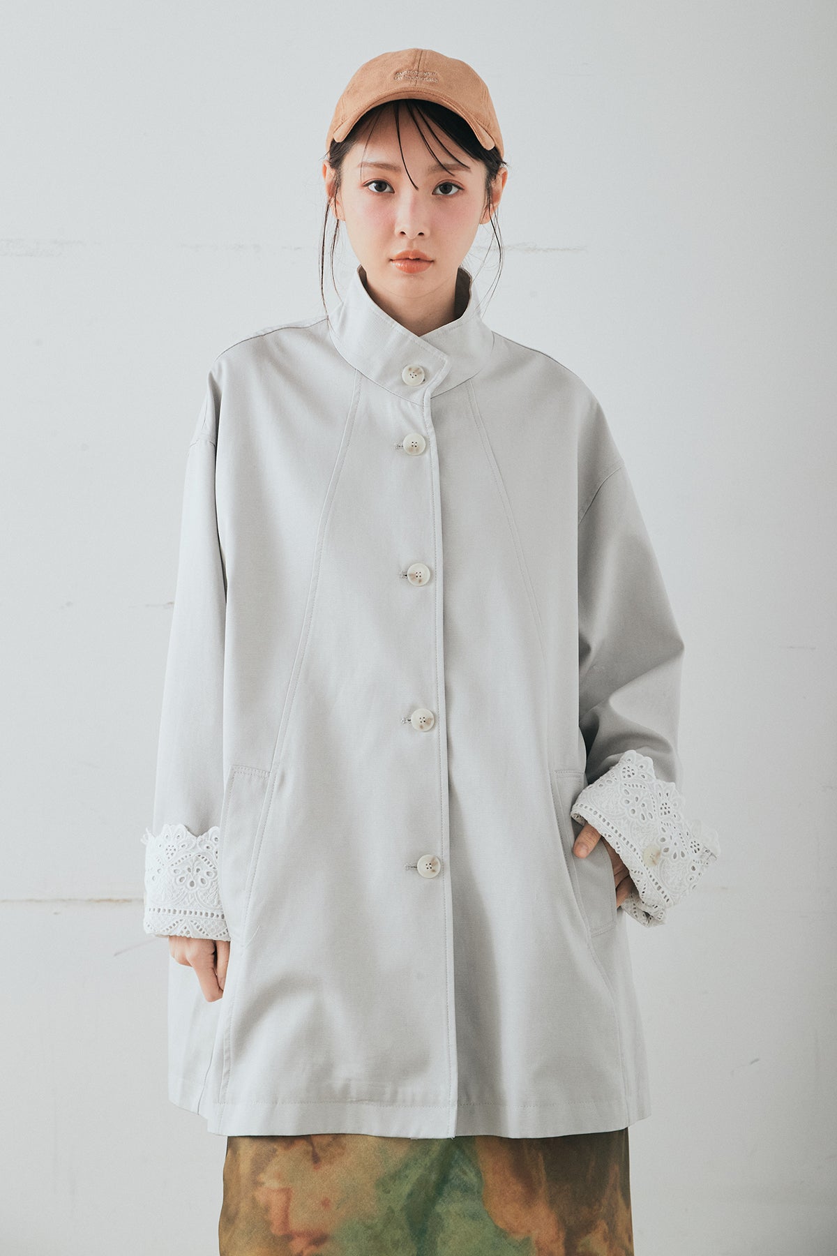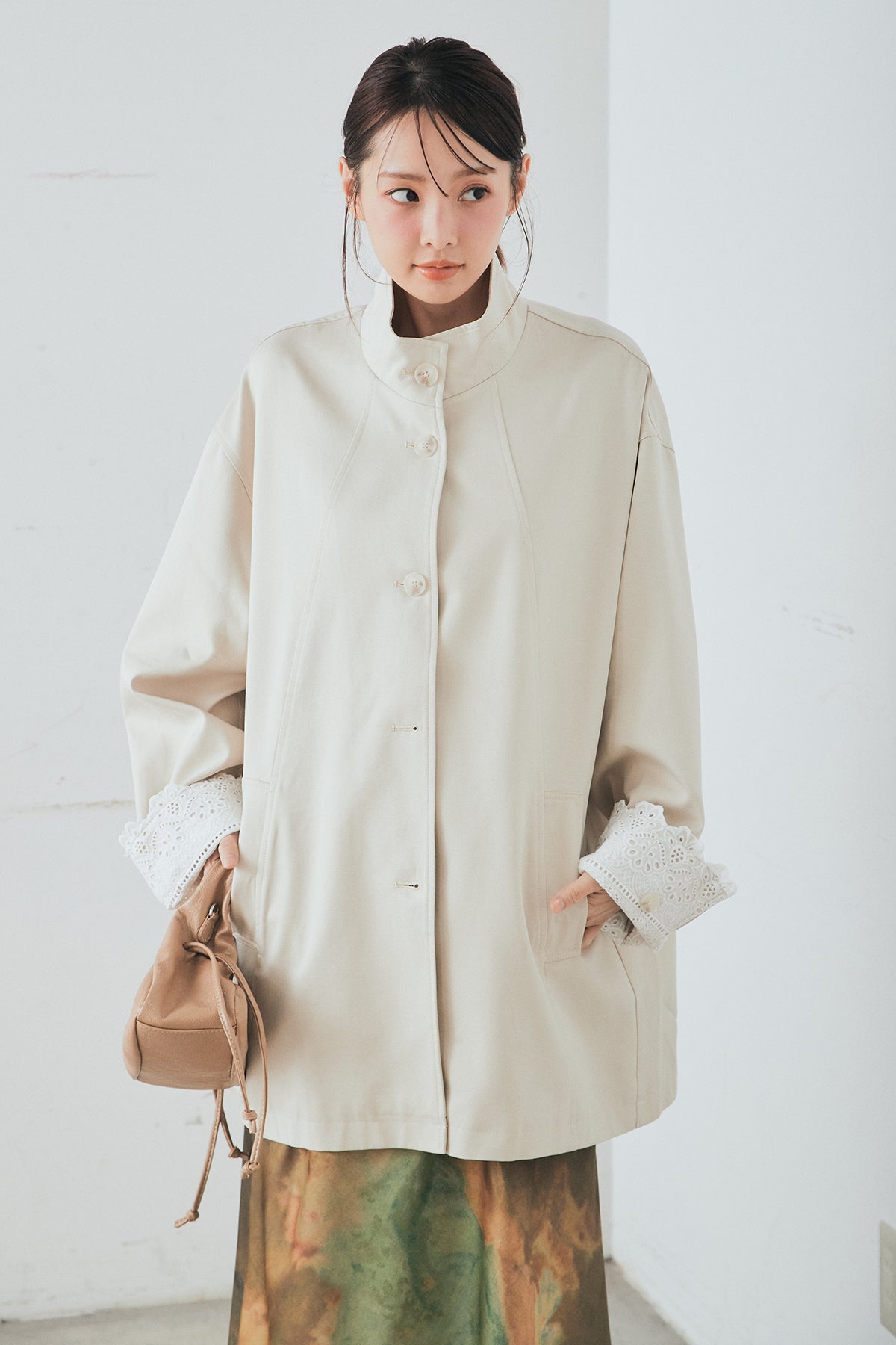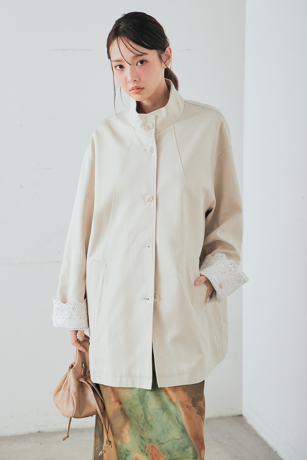 袖の折り返しにあしらったレースが印象的なデザインアウター。 シンプルなシルエットに繊細なディテールをプラスし、さりげない華やかさを添えた一枚です。ゆとりのあるサイズ感で羽織りやすく、スタンドカラーがすっきりとした印象に。 さらっと羽織るだけでコーディネートに表情を加え、デイリーからきれいめスタイルまで幅広く活躍するアイテムです。