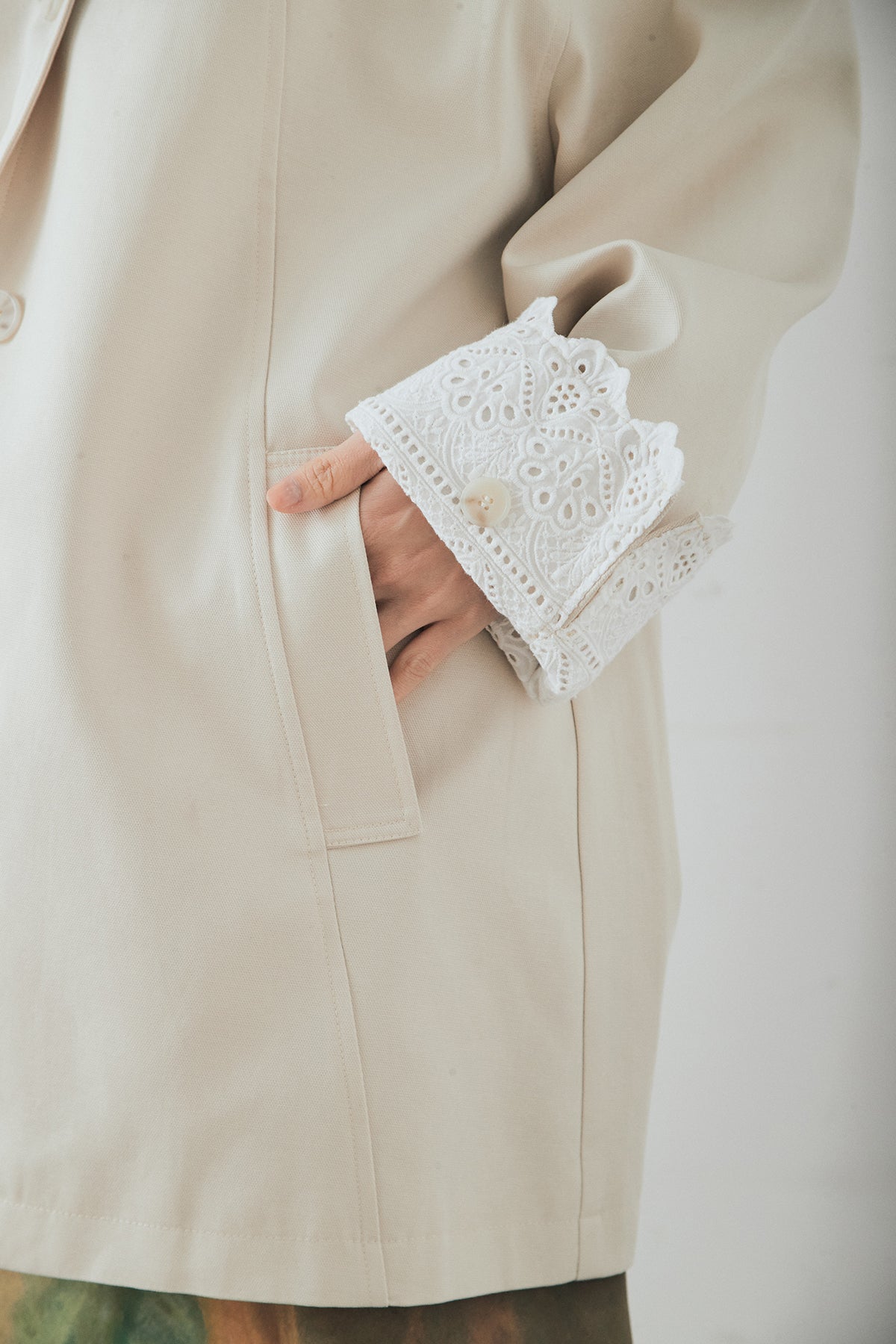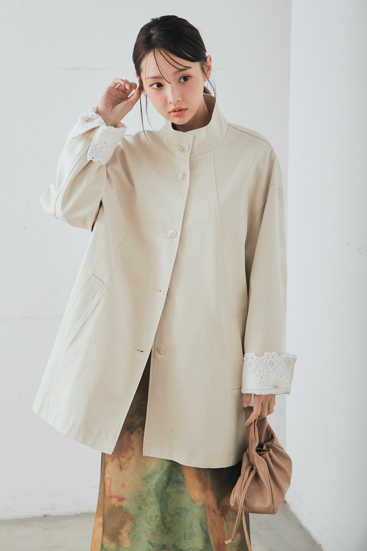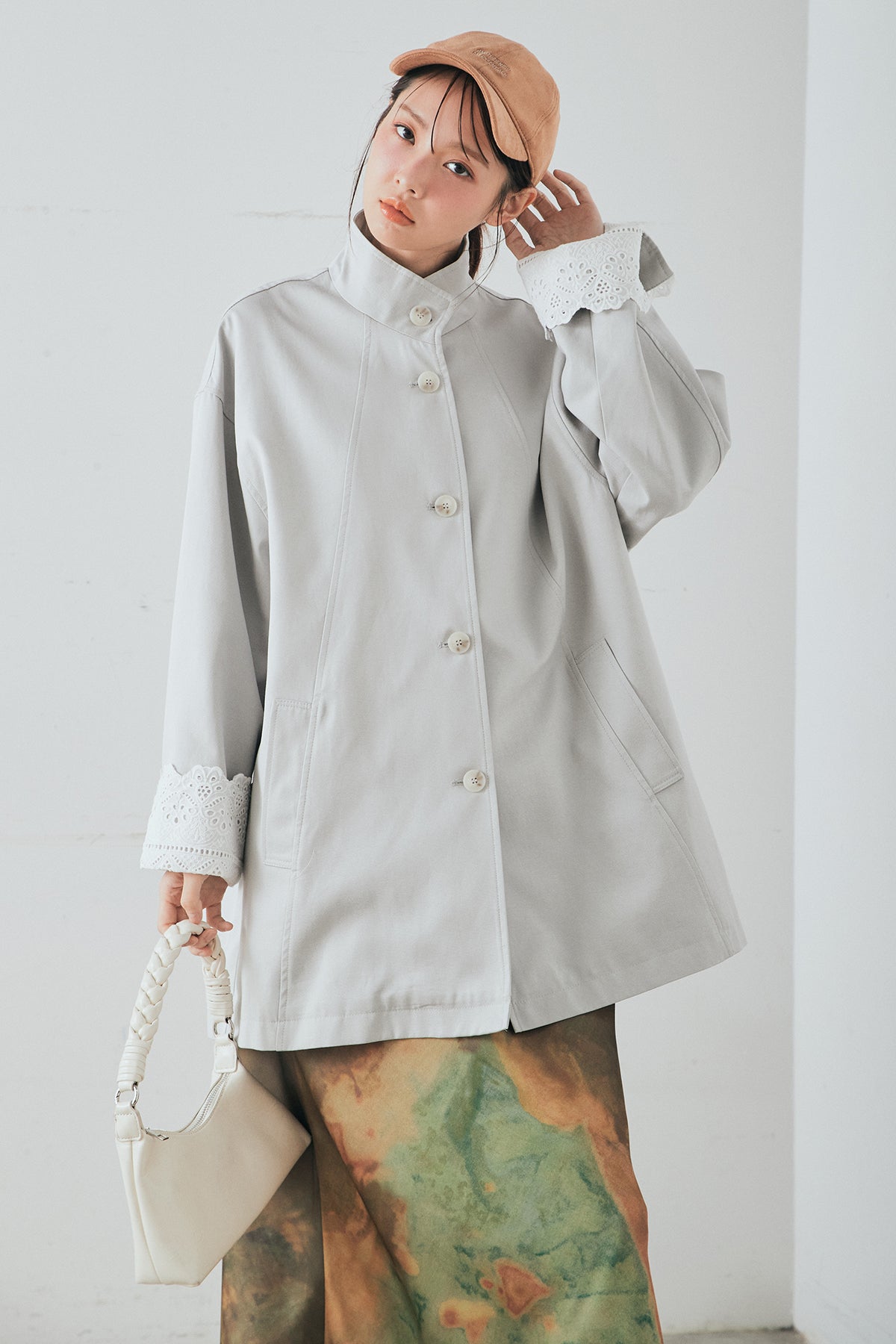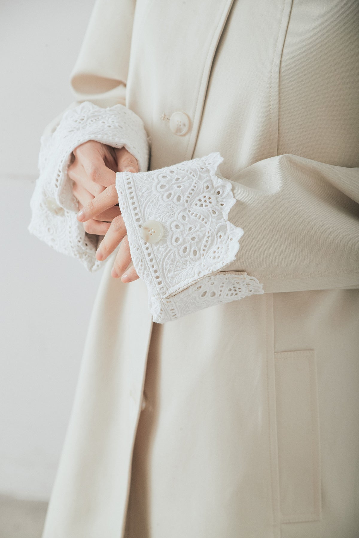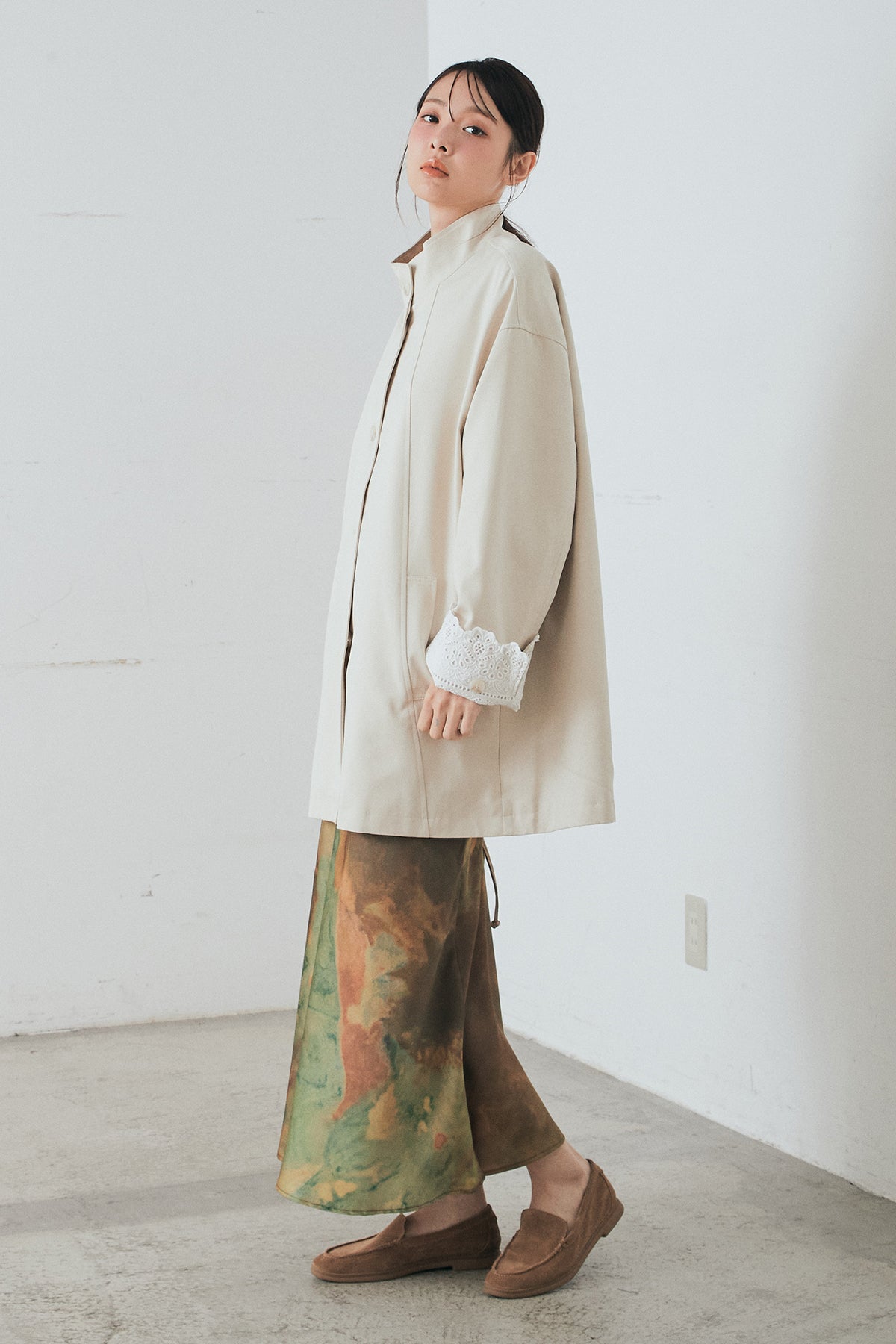 袖の折り返しにあしらったレースが印象的なデザインアウター。 シンプルなシルエットに繊細なディテールをプラスし、さりげない華やかさを添えた一枚です。ゆとりのあるサイズ感で羽織りやすく、スタンドカラーがすっきりとした印象に。 さらっと羽織るだけでコーディネートに表情を加え、デイリーからきれいめスタイルまで幅広く活躍するアイテムです。