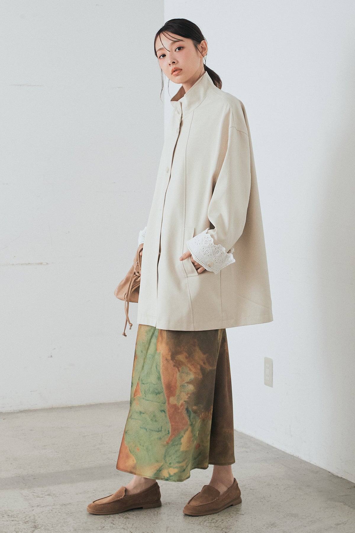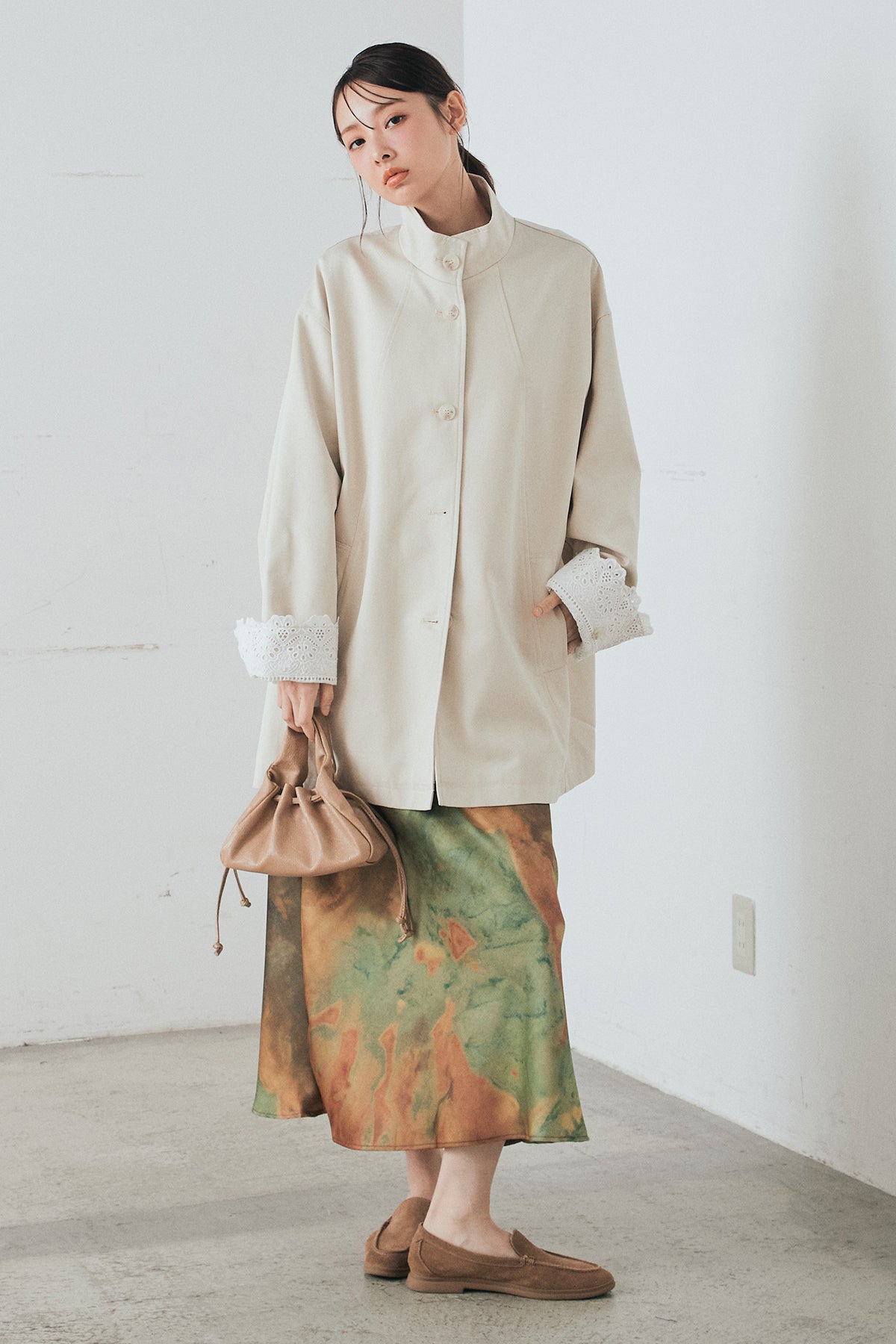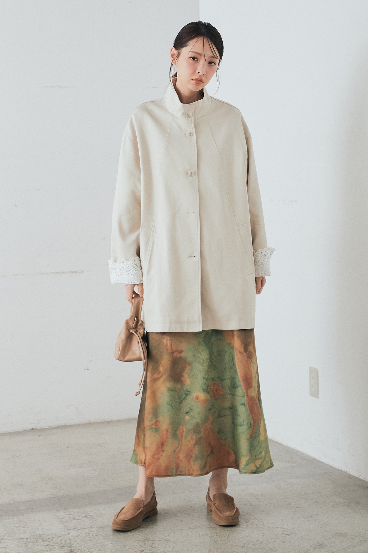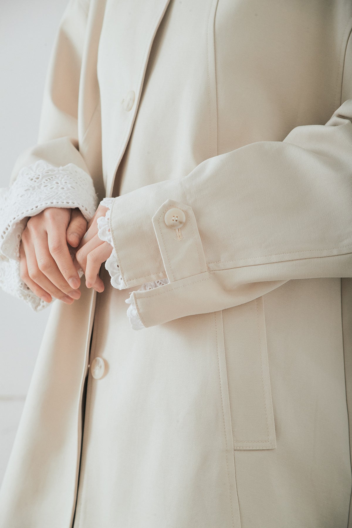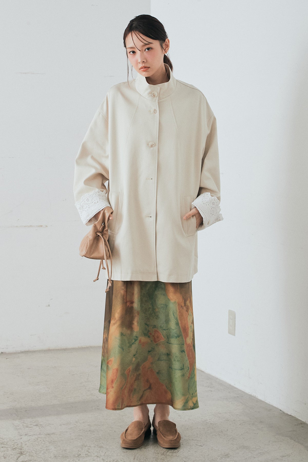 袖の折り返しにあしらったレースが印象的なデザインアウター。 シンプルなシルエットに繊細なディテールをプラスし、さりげない華やかさを添えた一枚です。ゆとりのあるサイズ感で羽織りやすく、スタンドカラーがすっきりとした印象に。 さらっと羽織るだけでコーディネートに表情を加え、デイリーからきれいめスタイルまで幅広く活躍するアイテムです。