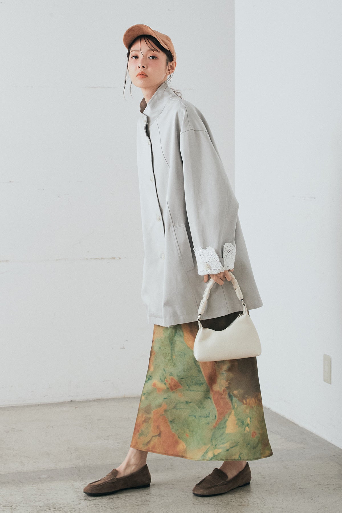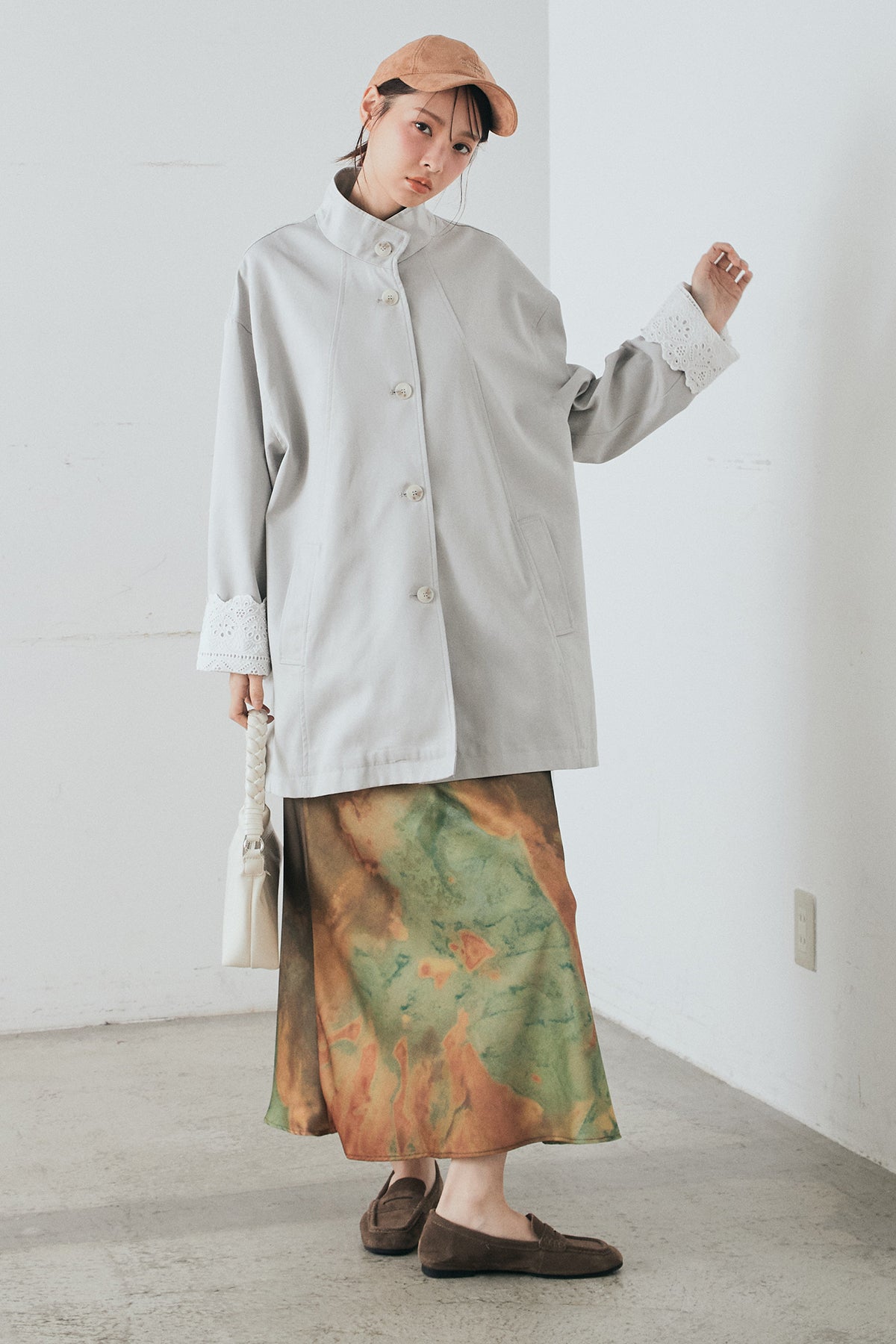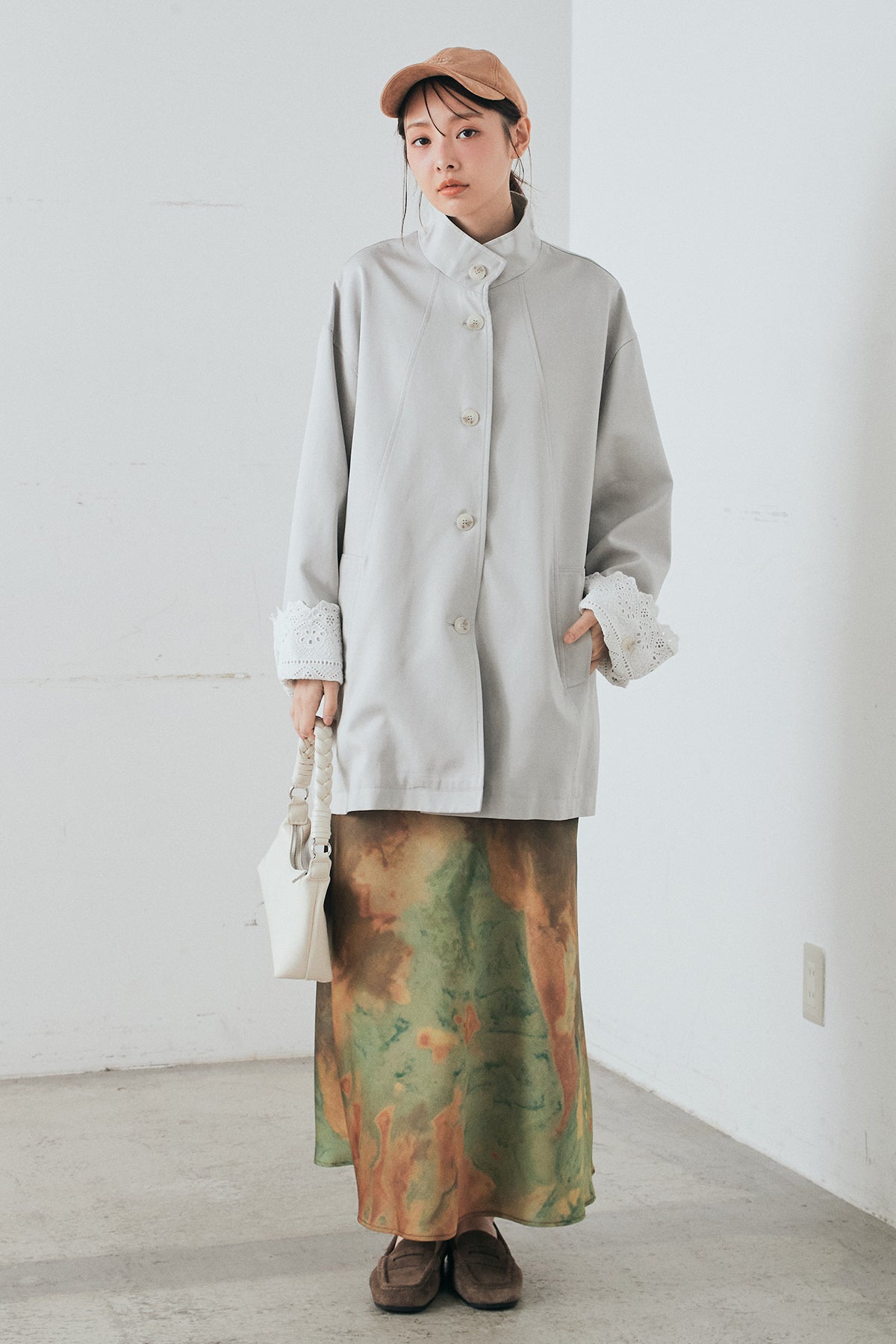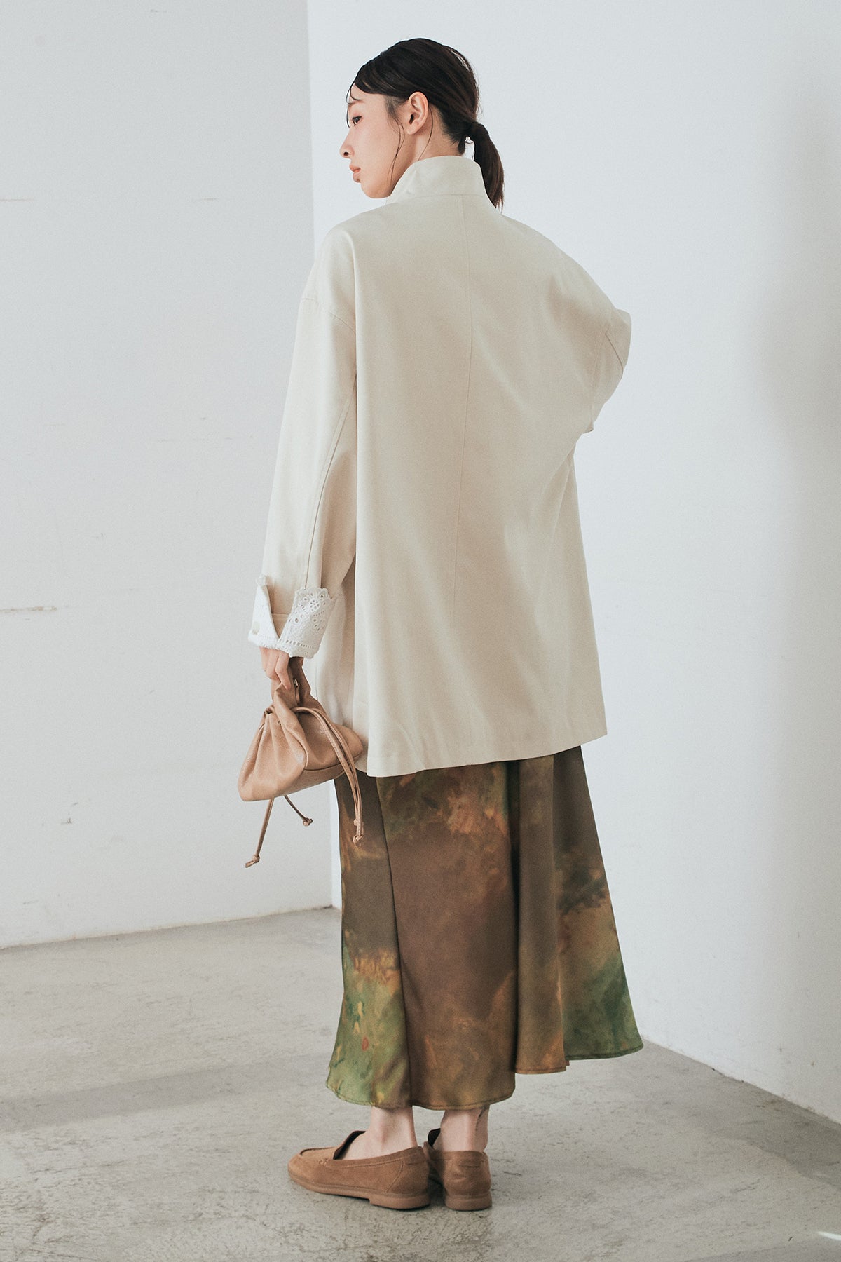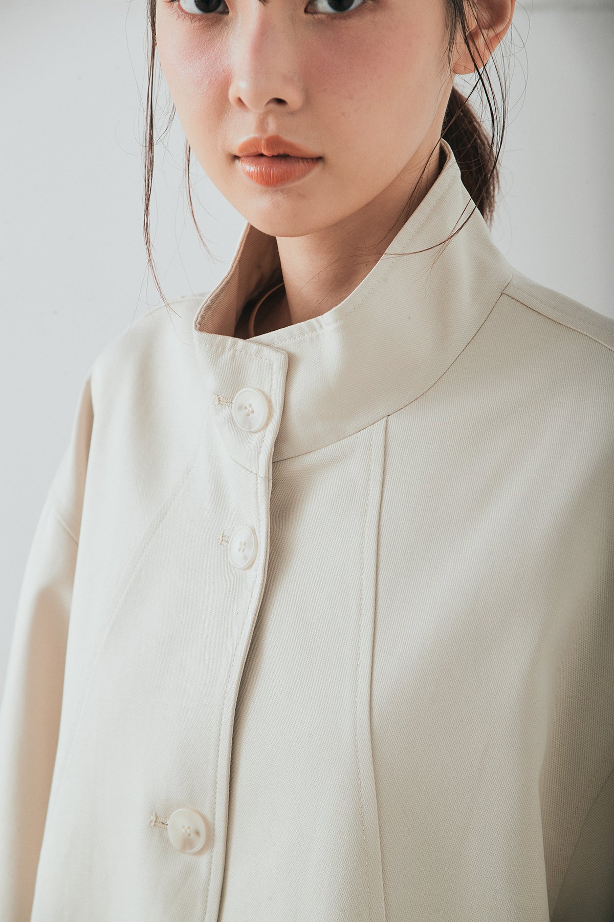 袖の折り返しにあしらったレースが印象的なデザインアウター。 シンプルなシルエットに繊細なディテールをプラスし、さりげない華やかさを添えた一枚です。ゆとりのあるサイズ感で羽織りやすく、スタンドカラーがすっきりとした印象に。 さらっと羽織るだけでコーディネートに表情を加え、デイリーからきれいめスタイルまで幅広く活躍するアイテムです。