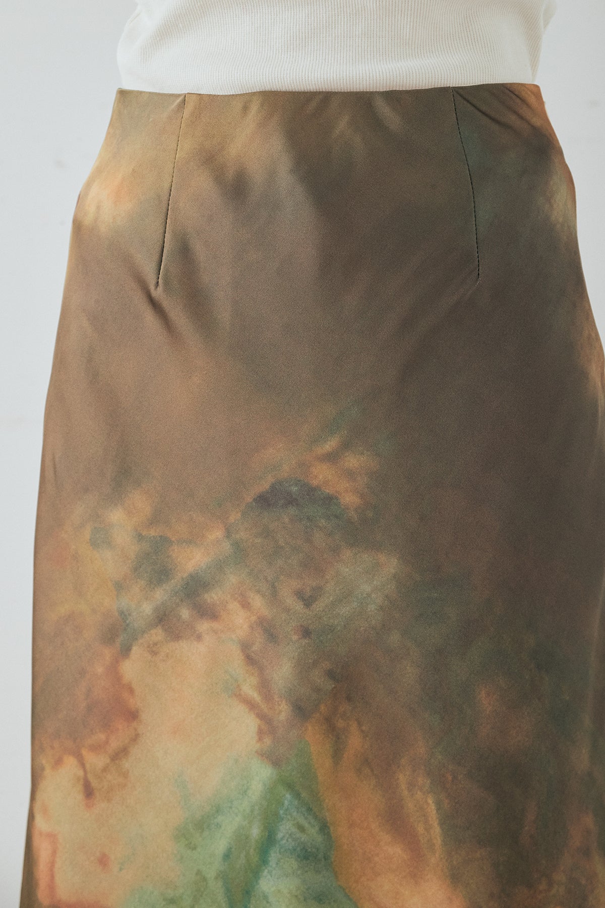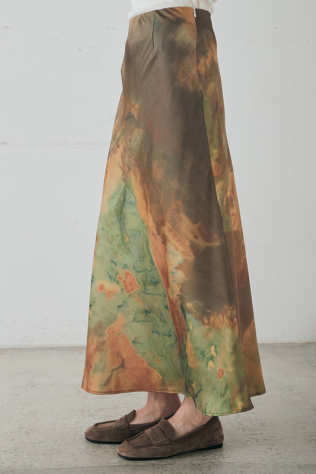 ニュアンス感のある柄が目を惹くサテンスカート。 なめらかな光沢素材が上品な印象を添え、落ち感のあるシルエットがすっきりとした縦ラインを描きます。存在感のあるデザインながらも、落ち着いたトーンでスタイリングに自然と馴染む一枚。 シンプルなトップスと合わせるだけでバランスよくまとまり、コーディネートの主役になるアイテムです。