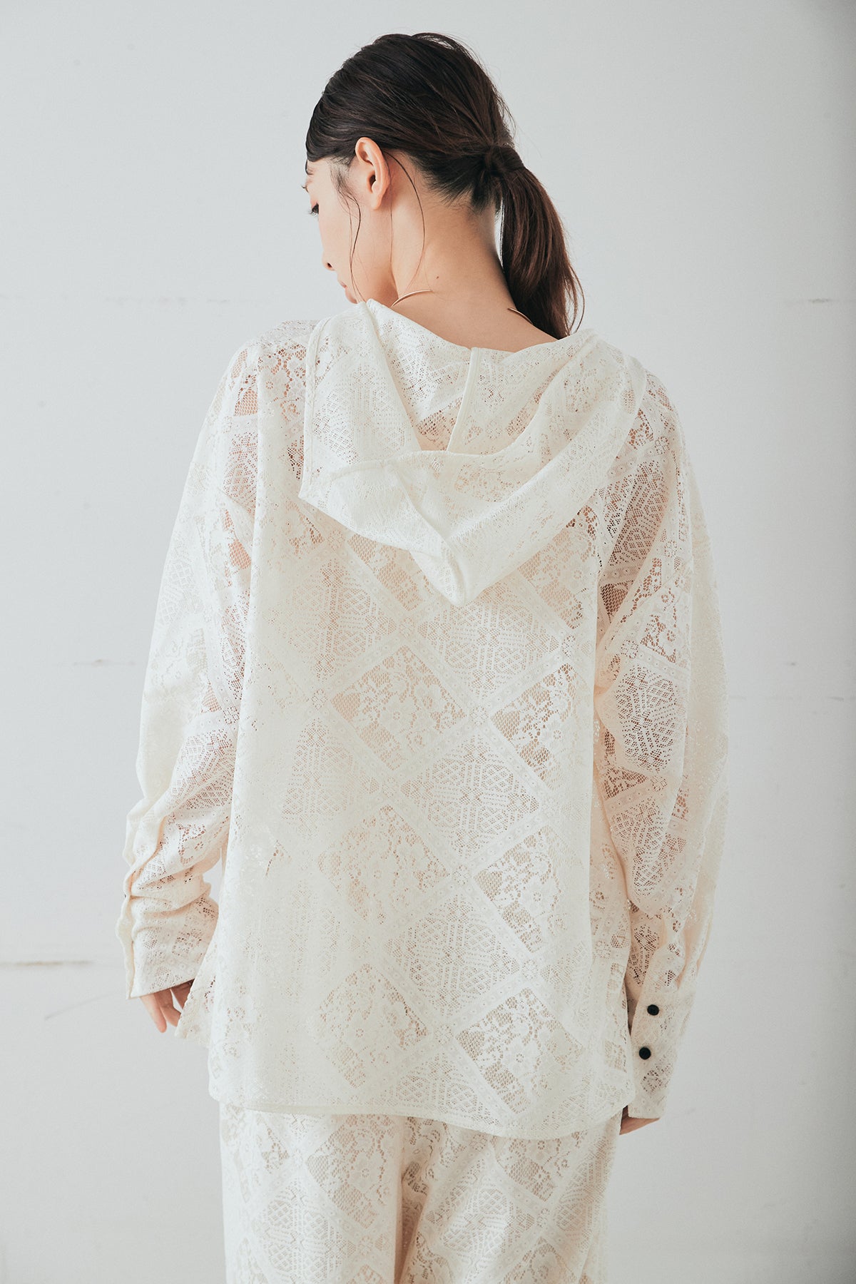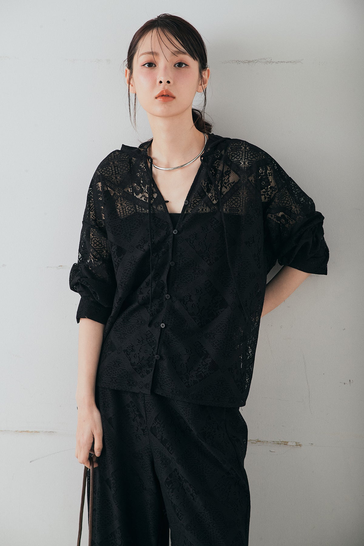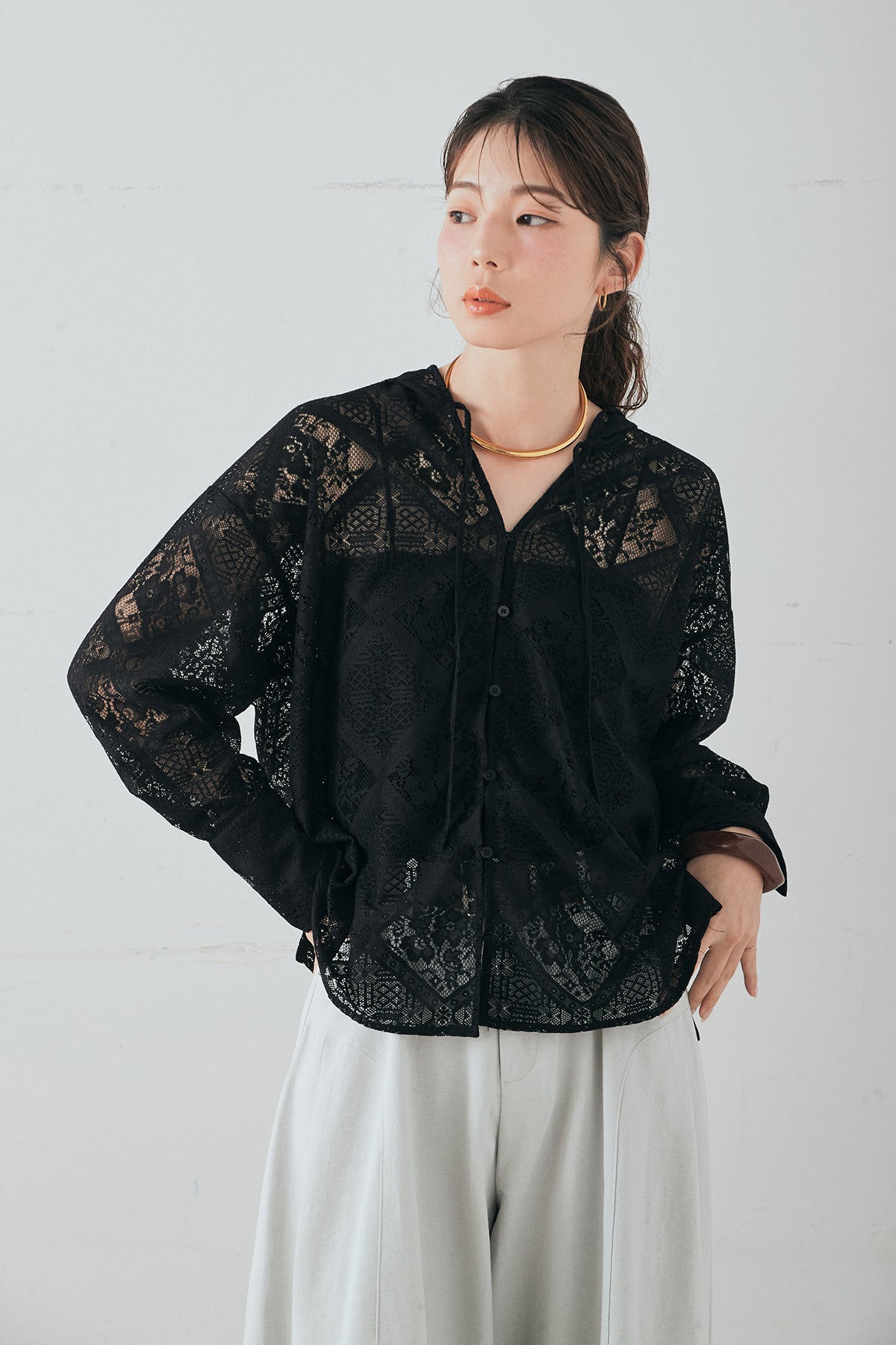 繊細なブロックレースが印象的なフード付きブラウス。 透け感のある軽やかな素材が抜け感を生み、スタイリングにさりげない華やかさをプラスします。フードデザインが程よくカジュアルなニュアンスを添え、甘さを抑えたバランスの良い一枚に。 前開き仕様で羽織りとしても着用でき、インナー次第で幅広いレイヤードスタイルを楽しめるアイテムです。