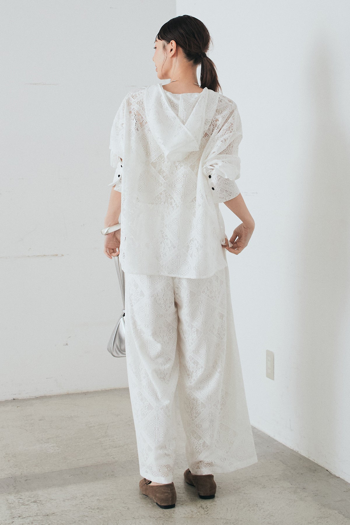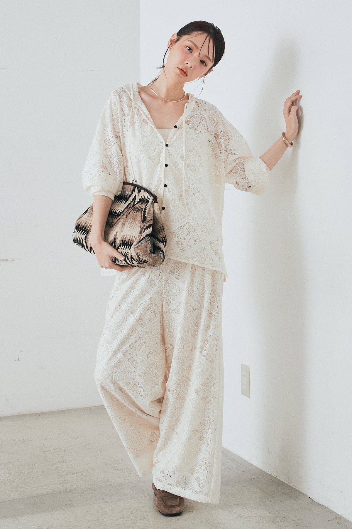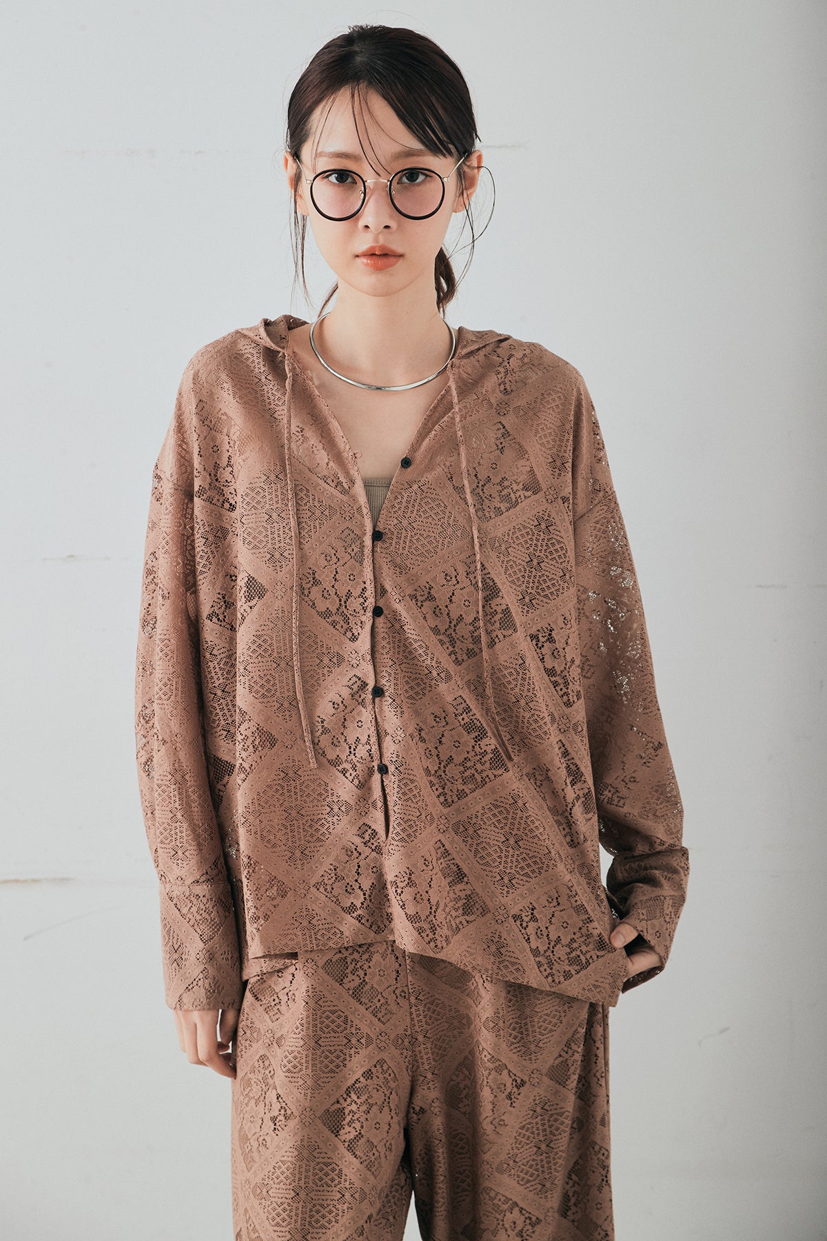繊細なブロックレースが印象的なフード付きブラウス。 透け感のある軽やかな素材が抜け感を生み、スタイリングにさりげない華やかさをプラスします。フードデザインが程よくカジュアルなニュアンスを添え、甘さを抑えたバランスの良い一枚に。 前開き仕様で羽織りとしても着用でき、インナー次第で幅広いレイヤードスタイルを楽しめるアイテムです。