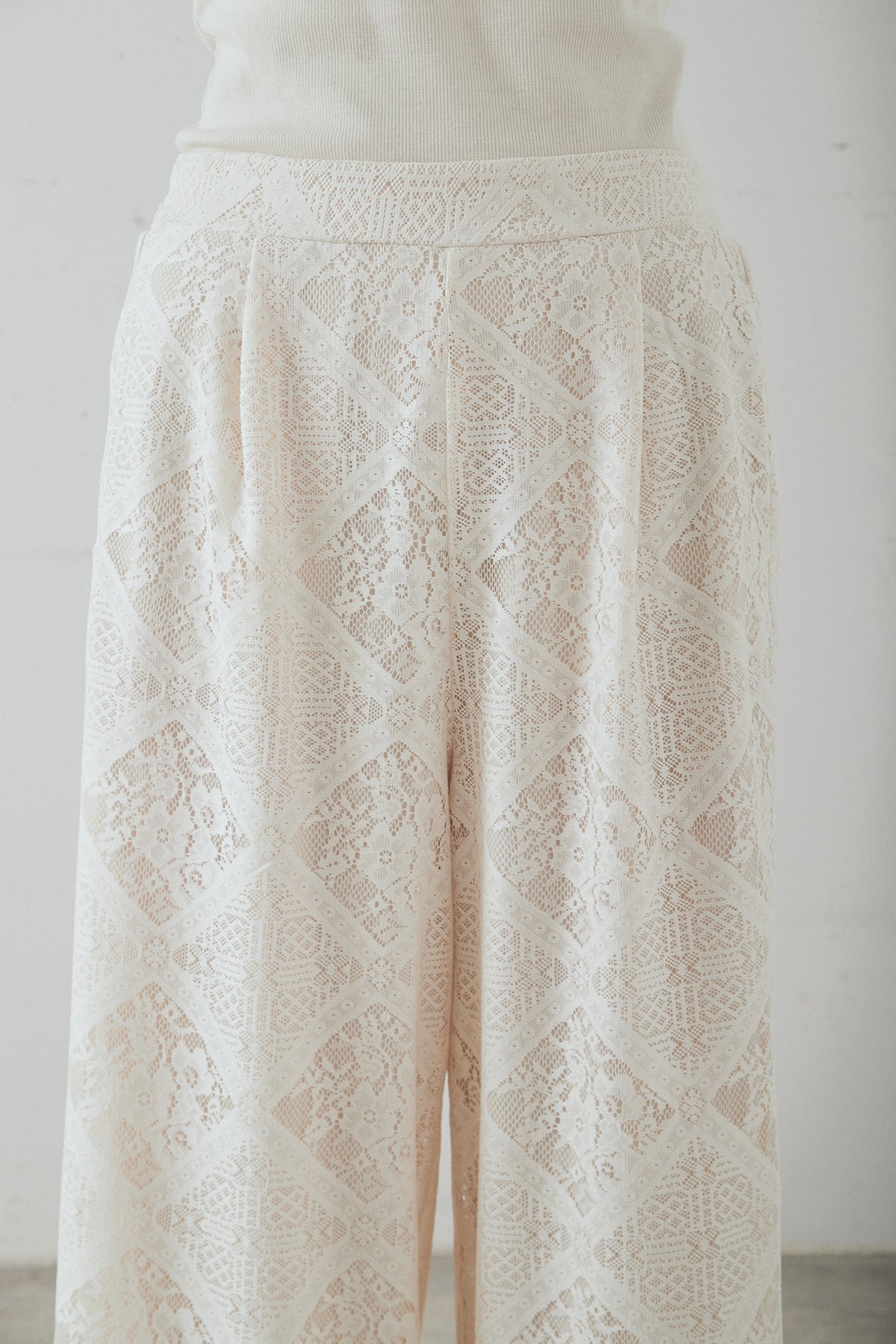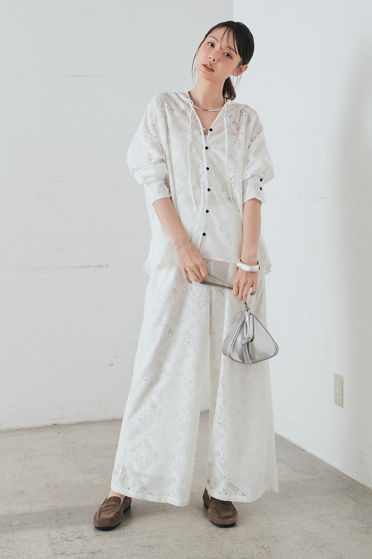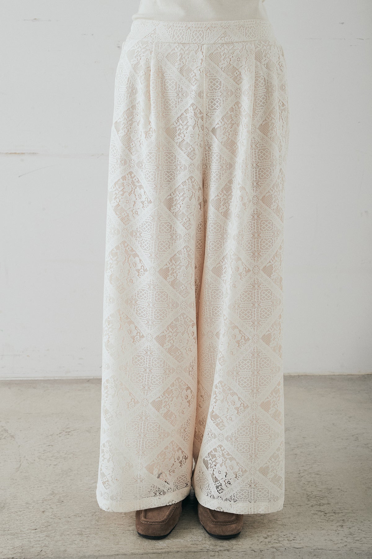 繊細なブロックレースが目を惹くリラックスワイドパンツ。 程よくゆとりのあるシルエットと軽やかな素材感で、抜け感のあるスタイルを叶えます。総レースデザインが上品な印象を添え、シンプルなトップス合わせでも自然と華やかさをプラス。 デイリーにはもちろん、きれいめなスタイリングにも取り入れやすい一本です。