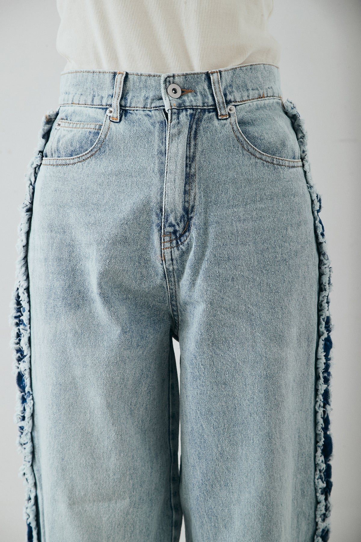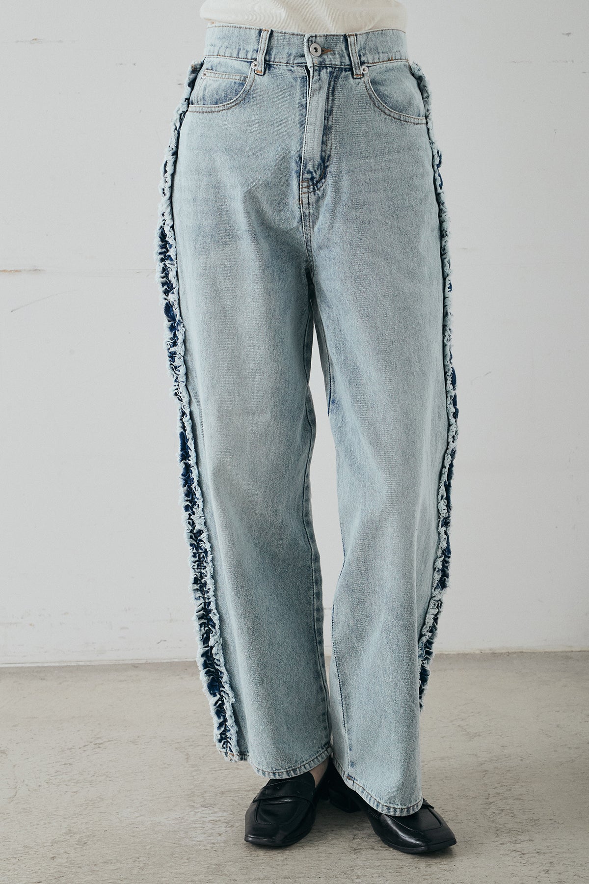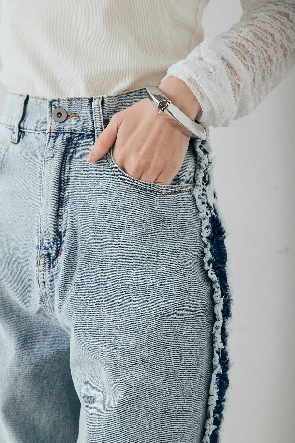 サイドにあしらったフリルデザインが印象的なデニムパンツ。 程よくゆとりのあるシルエットで穿きやすく、カジュアルな中にもさりげない存在感をプラスしてくれる一本です。ヴィンテージライクな風合いがスタイリングに奥行きを与え、シンプルなトップス合わせでもこなれた印象に。 デイリーに取り入れやすく、いつものコーディネートにアクセントを添えてくれるアイテムです。