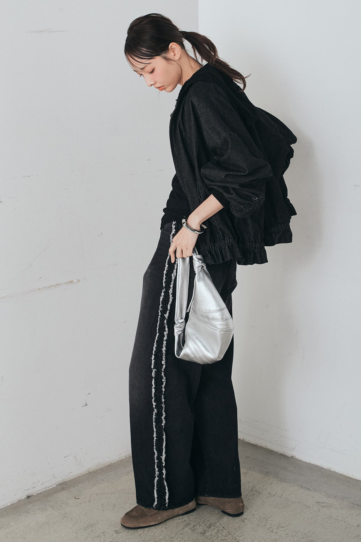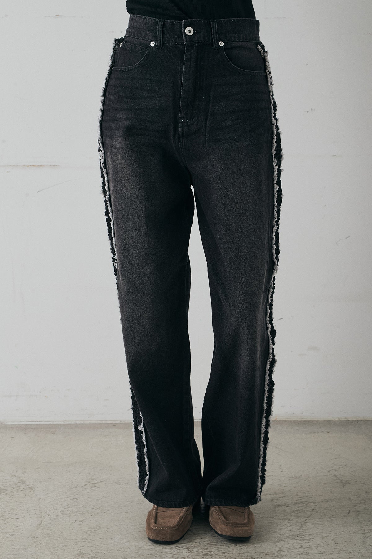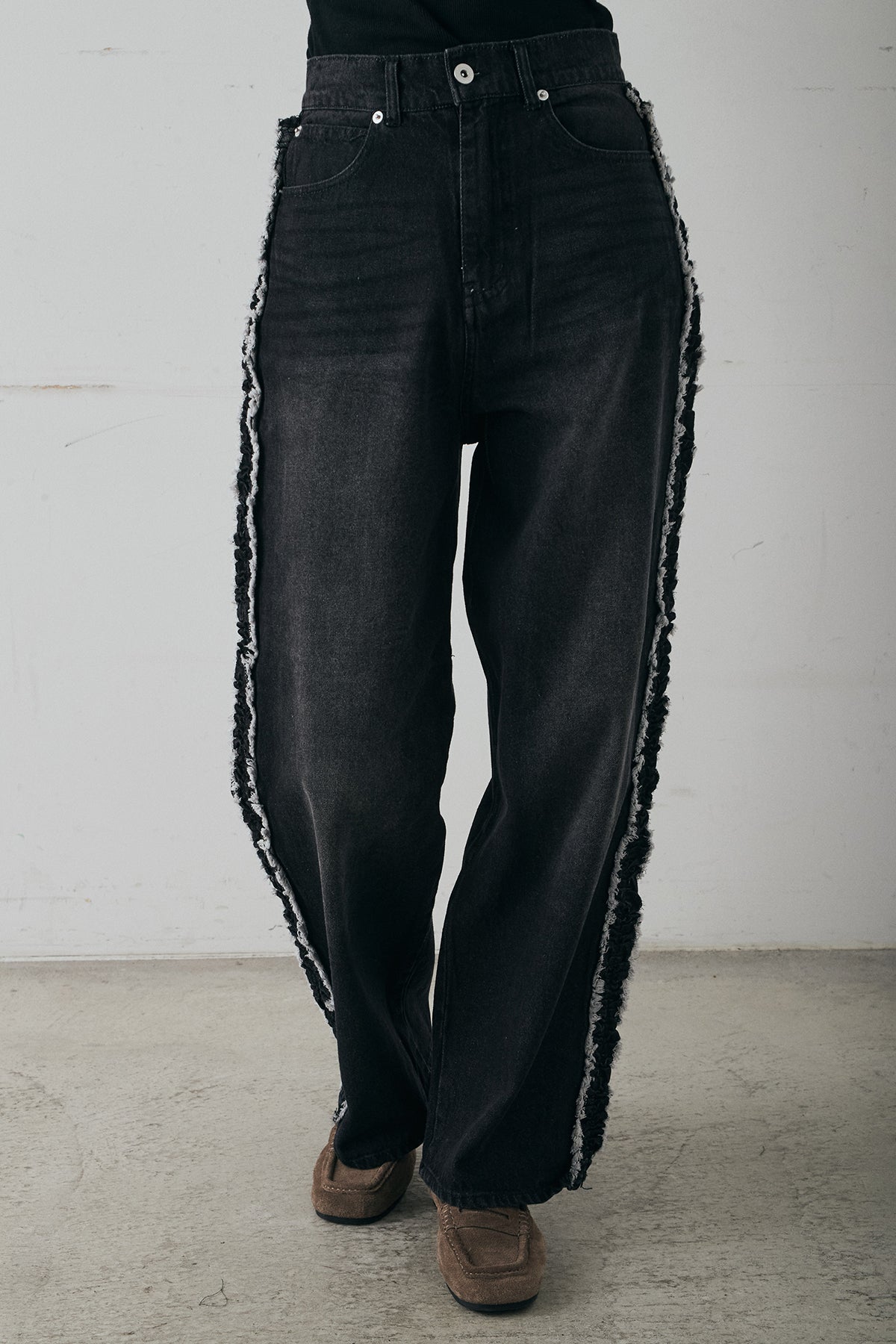 サイドにあしらったフリルデザインが印象的なデニムパンツ。 程よくゆとりのあるシルエットで穿きやすく、カジュアルな中にもさりげない存在感をプラスしてくれる一本です。ヴィンテージライクな風合いがスタイリングに奥行きを与え、シンプルなトップス合わせでもこなれた印象に。 デイリーに取り入れやすく、いつものコーディネートにアクセントを添えてくれるアイテムです。