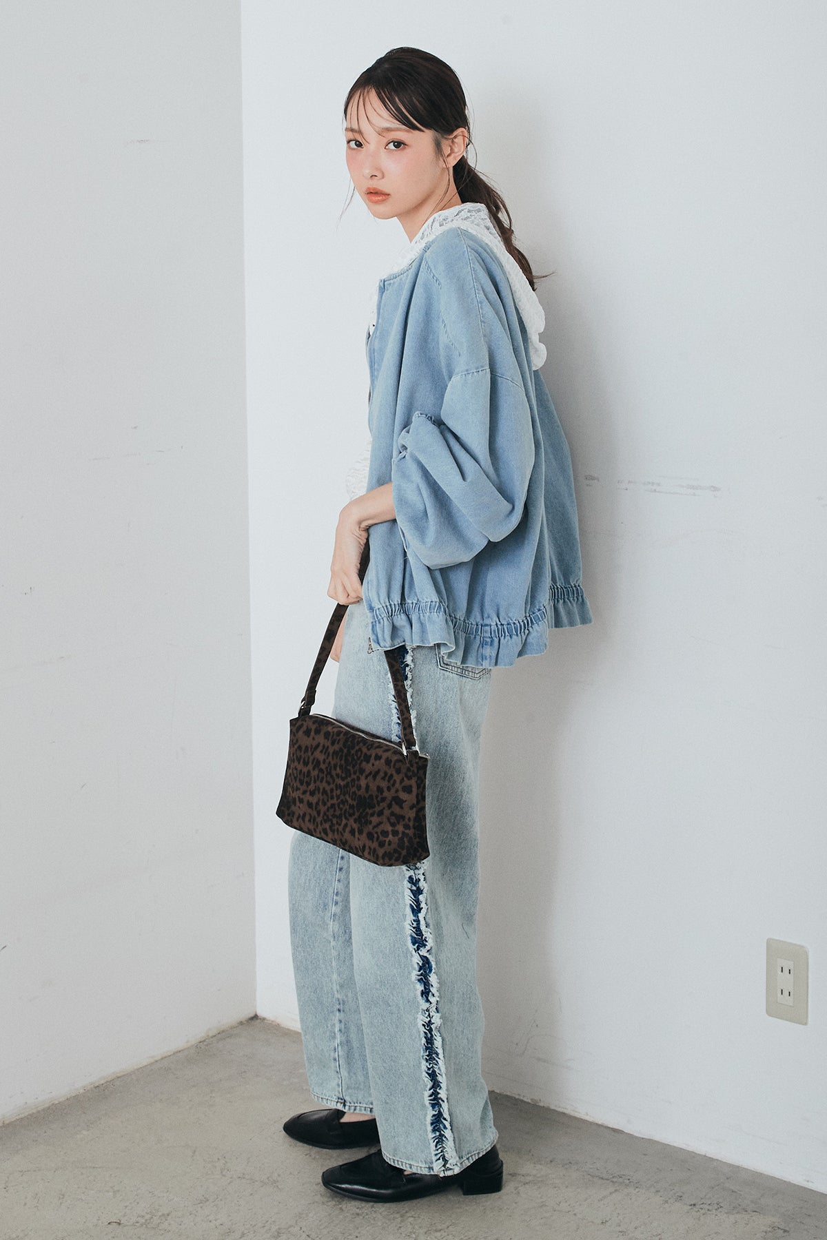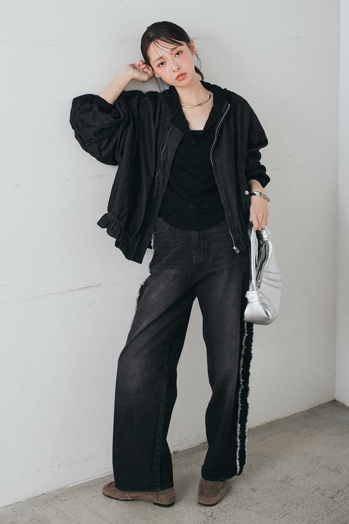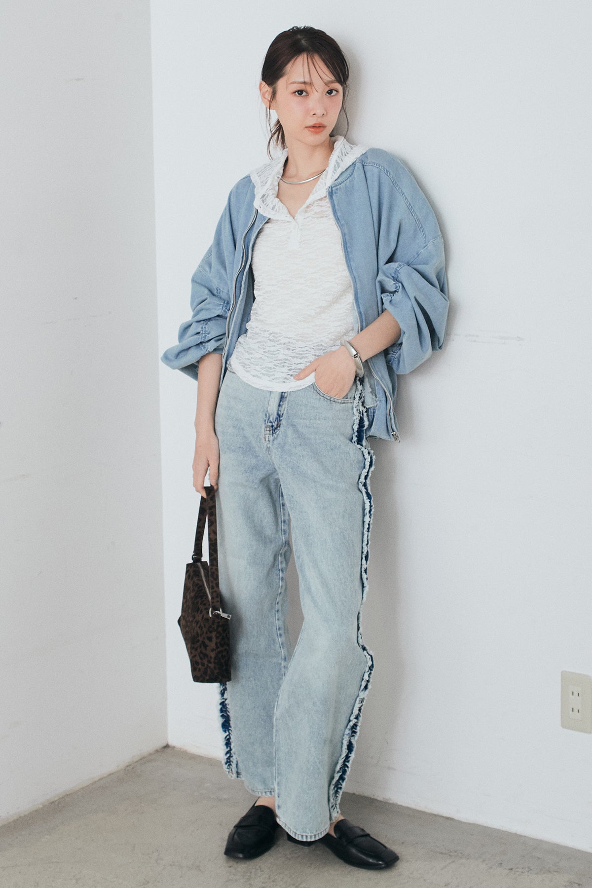 [SET]袖シャーリング裾フリルデニムブルゾン+デニムサイドフリルパンツ(2set)