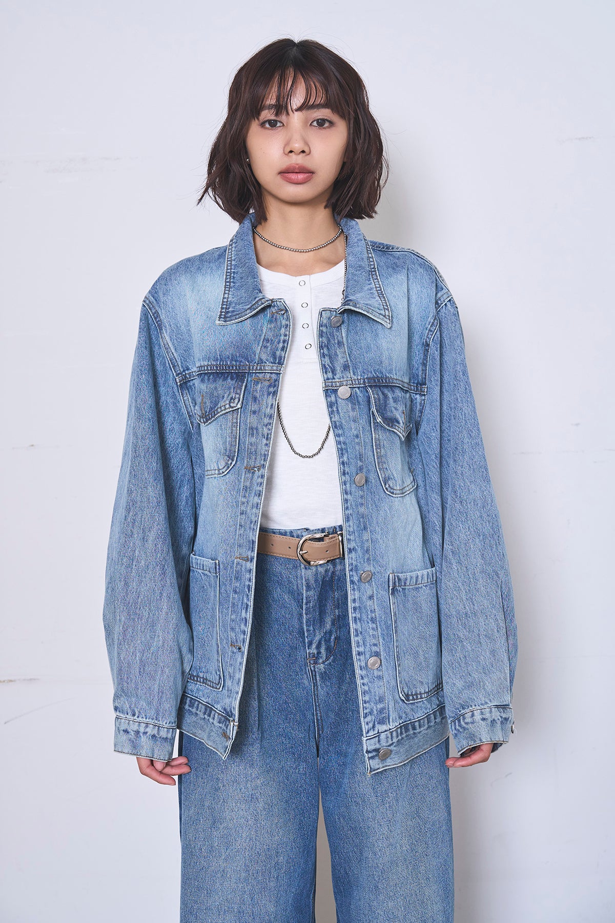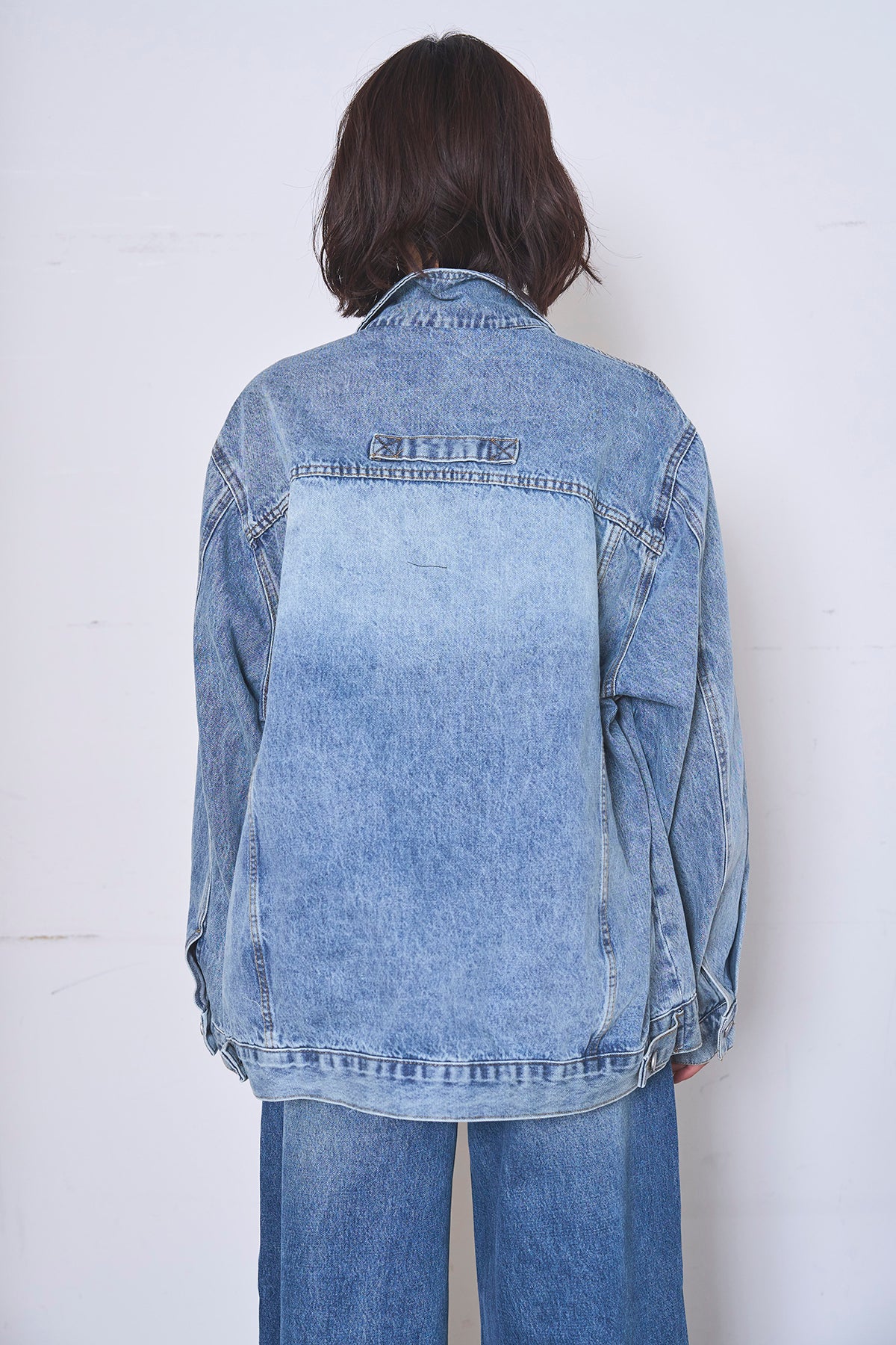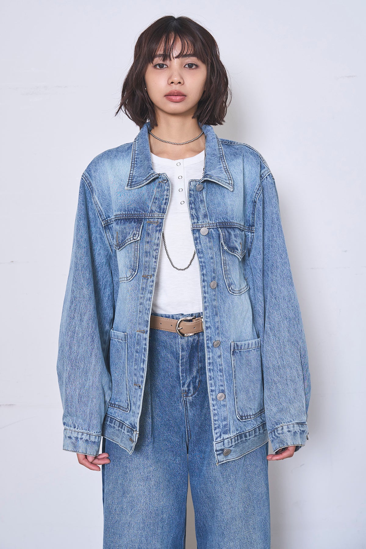 ヴィンテージライクな表情が目を惹くデニムジャケット。絶妙なウォッシュ加工が施された淡いブルーの色味が、スタイリングにこなれた印象と軽やかさをプラスします。 ヒップが隠れる長めの着丈と、ゆったりとしたドロップショルダーのシルエットがリラックスした着心地を実現。フロントに配された4つのポケットがアクセントとなり、実用性とデザイン性を両立させています。柔らかさのあるデニム生地を使用しているため、肌馴染みが良く、季節の変わり目の羽織りとして重宝する一着です。