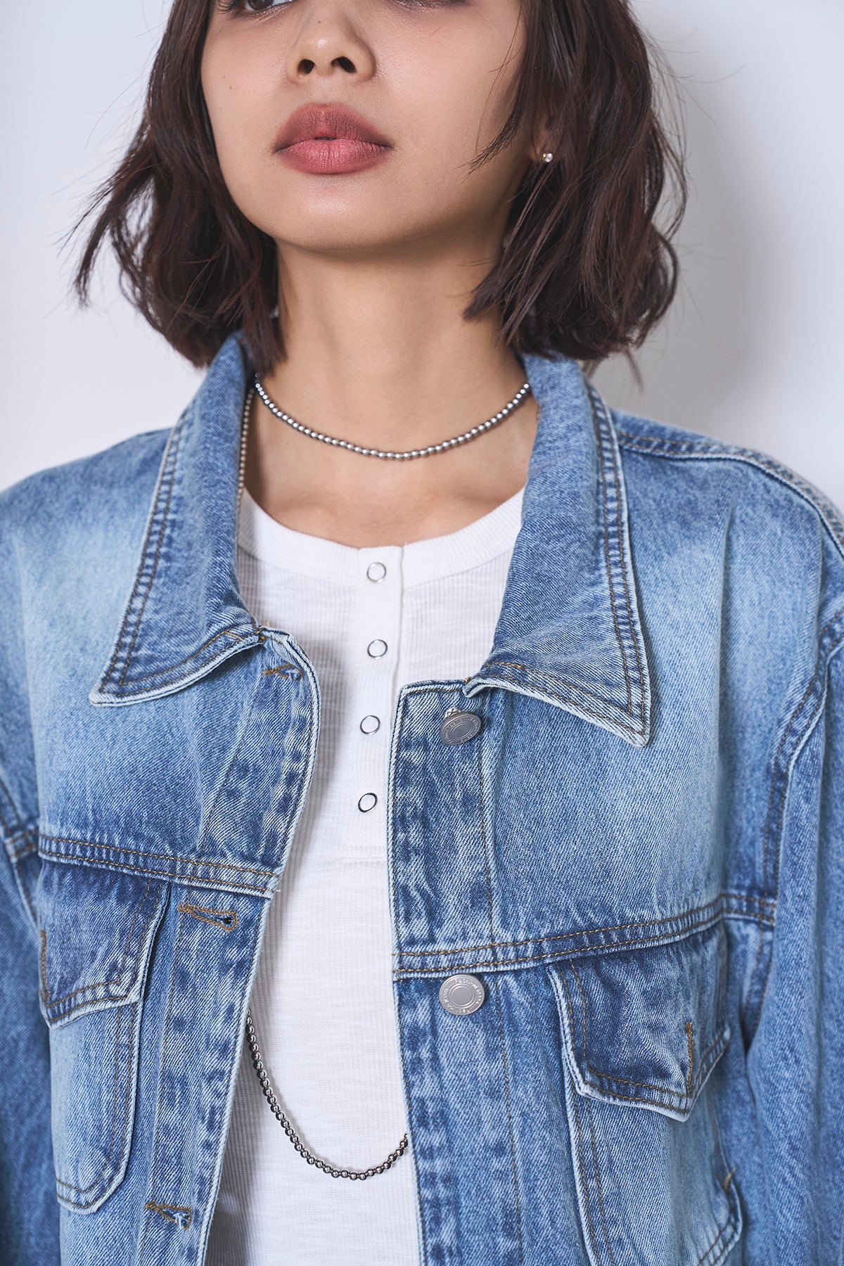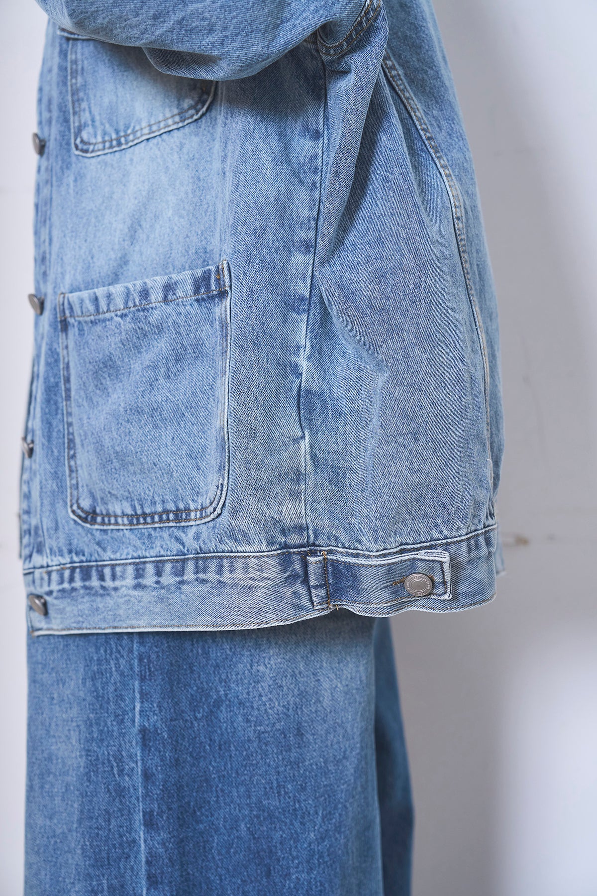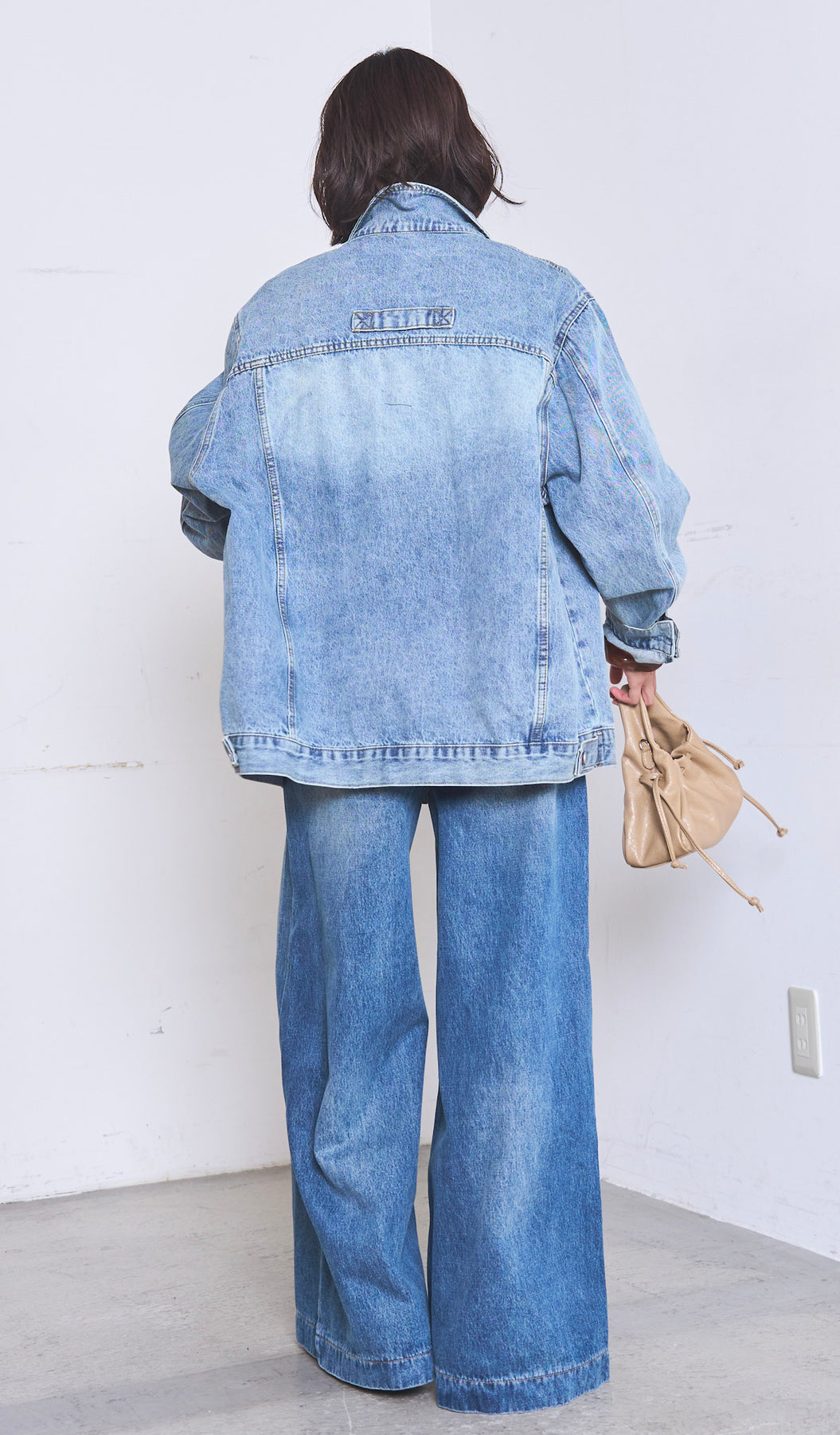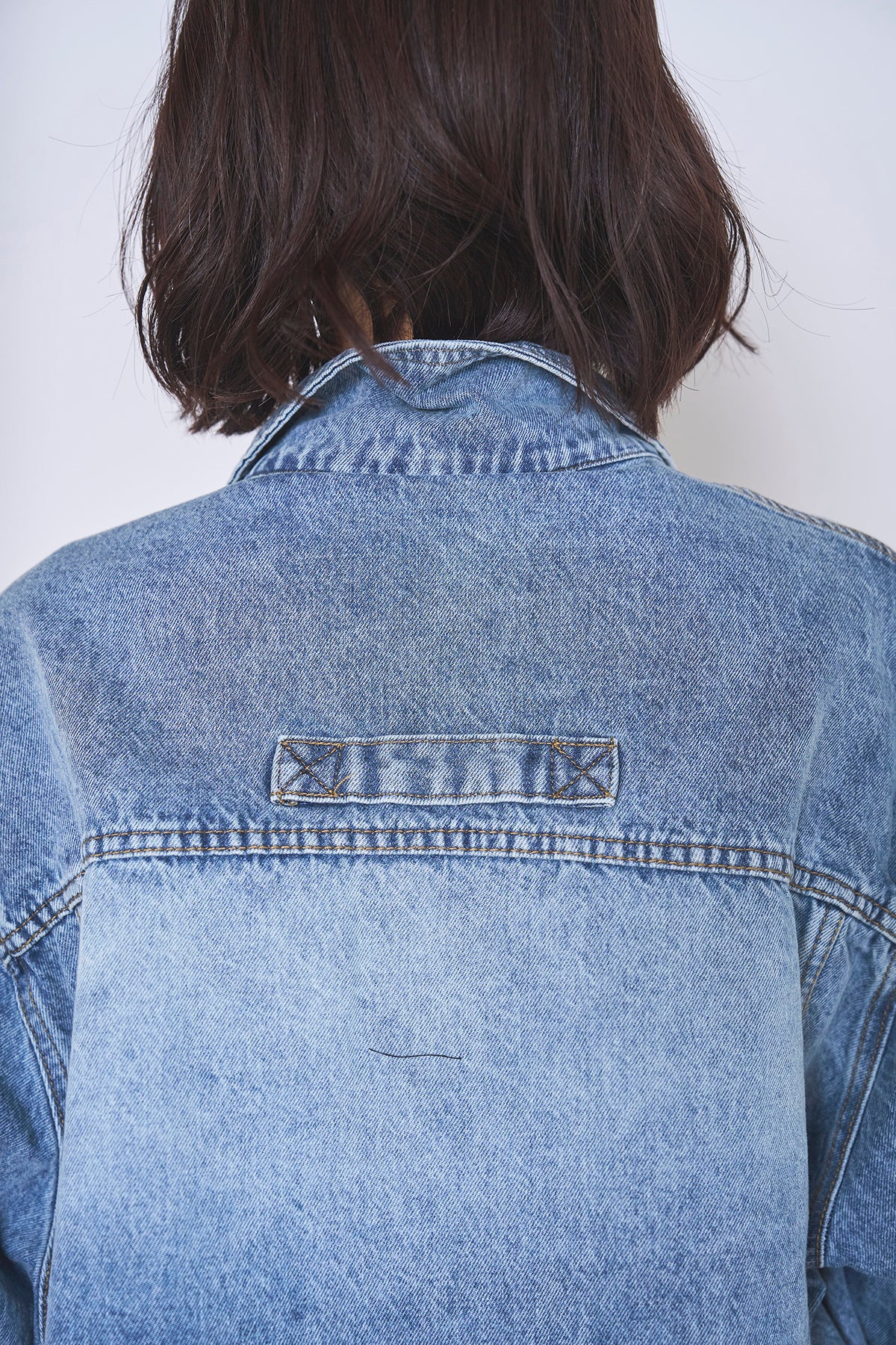 ヴィンテージライクな表情が目を惹くデニムジャケット。絶妙なウォッシュ加工が施された淡いブルーの色味が、スタイリングにこなれた印象と軽やかさをプラスします。 ヒップが隠れる長めの着丈と、ゆったりとしたドロップショルダーのシルエットがリラックスした着心地を実現。フロントに配された4つのポケットがアクセントとなり、実用性とデザイン性を両立させています。柔らかさのあるデニム生地を使用しているため、肌馴染みが良く、季節の変わり目の羽織りとして重宝する一着です。