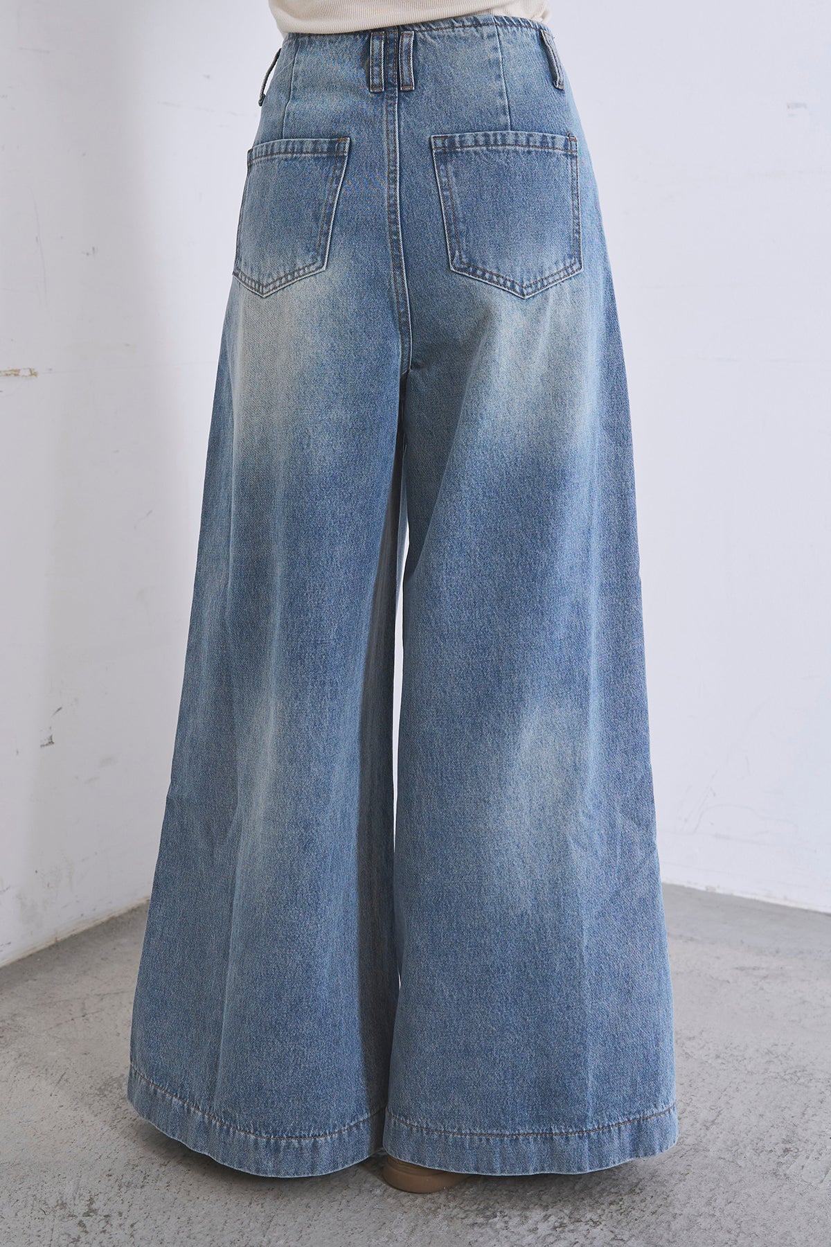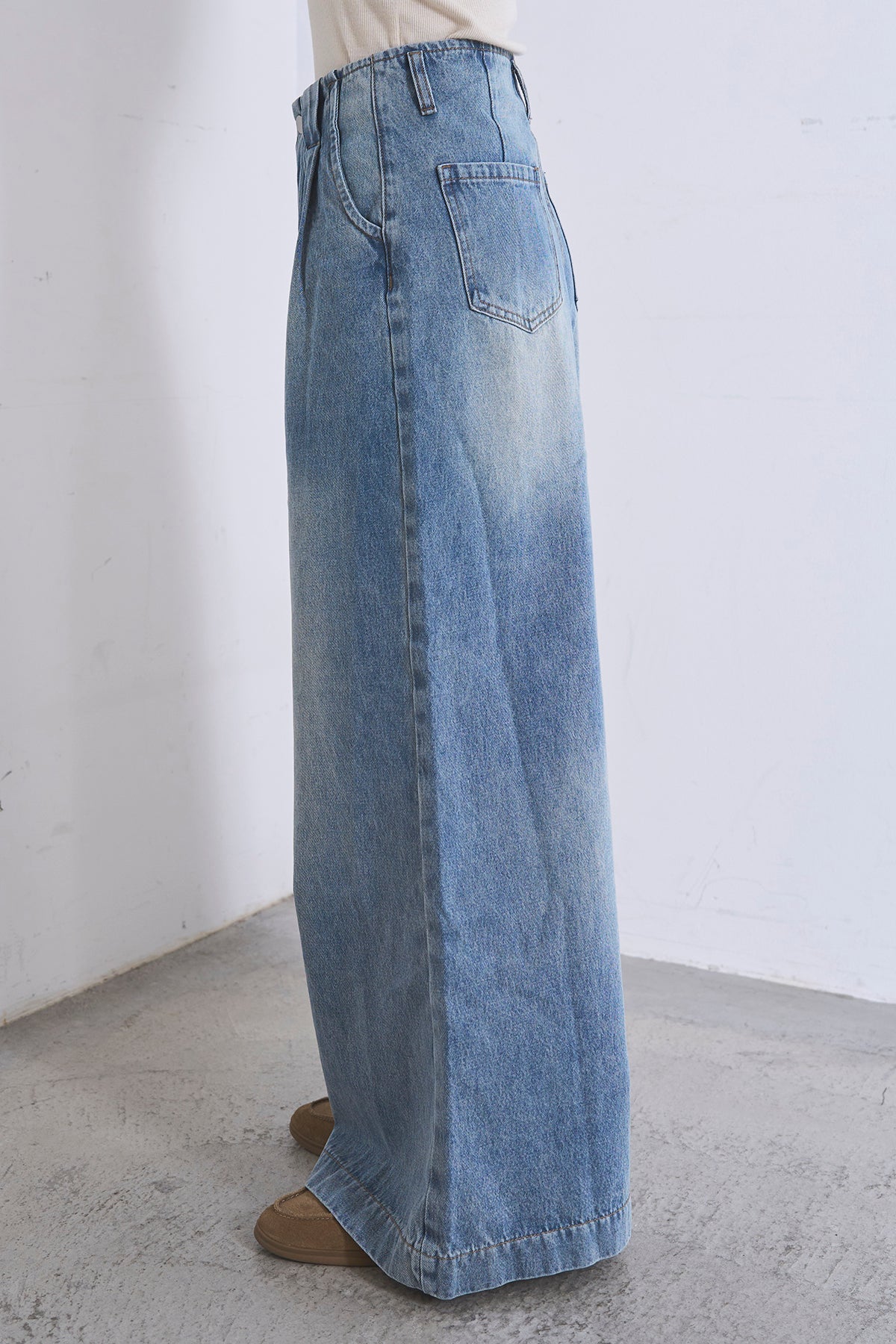 大胆なワイドシルエットが今季らしい、タック入りデニムワイドパンツ。フロントに深く施されたタックが腰回りにゆとりを持たせつつ、縦のラインを強調して脚長効果を発揮してくれます。 ヴィンテージライクな色落ち加工を施したデニム生地は、穿き始めから柔らかく肌に馴染むのが魅力。バックウエストはゴム仕様になっているため、リラックス感のある穿き心地を叶えながらも、フロントはすっきりと綺麗な見え方をキープします。裾に向かって広がるルーズなフォルムが、気になるレッグラインを自然にカバーしてくれるのも嬉しいポイント。 コンパクトなトップスをインしてメリハリをつけたり、ボリュームのあるシャツと合わせて大人なルーズスタイルを楽しんだりと、着回し力も抜群。デイリーコーデを格上げしてくれる、ワードローブに揃えておきたい一本です。