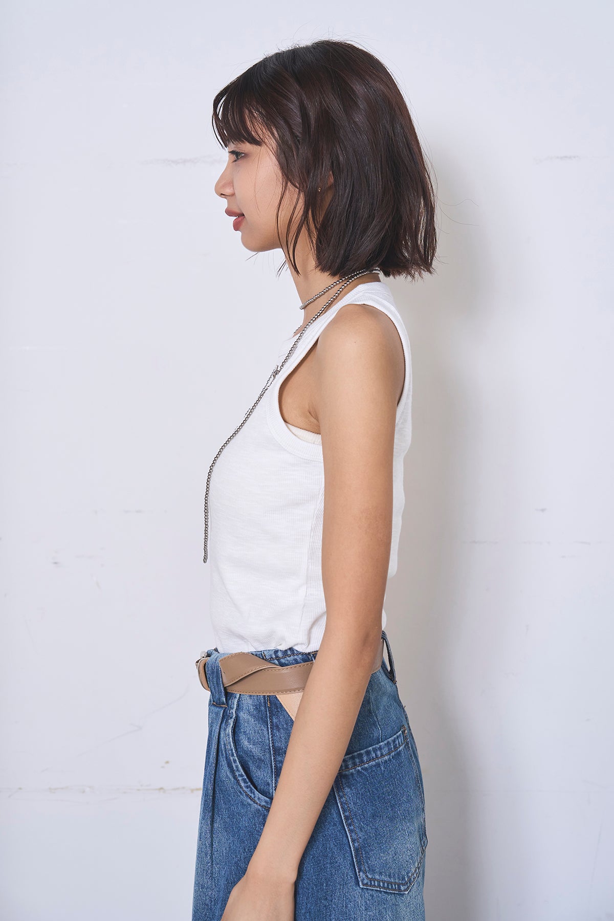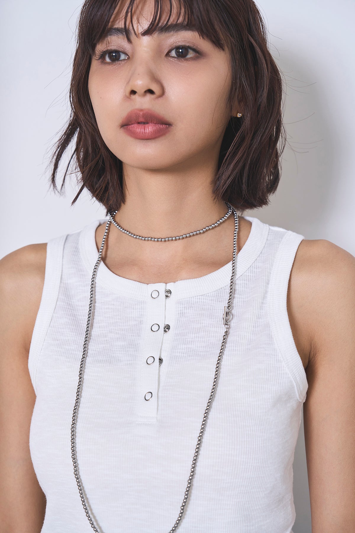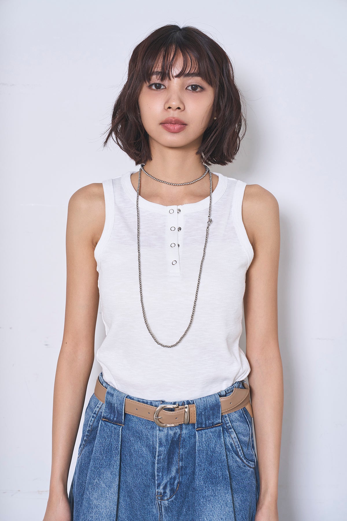 シンプルながらもフロントのスナップボタンがアクセントを添える、ヘンリーネックタンクトップ。表面感のあるスラブ生地のようなナチュラルな風合いが、大人のカジュアルスタイルにこなれた表情をプラスします。 首元をすっきりと見せるコンパクトなラインと、程よく体にフィットするシルエットで、インナーとしても一枚着としてもバランス良く決まるデザイン。フロントのボタンを開ければ、さらに抜け感のあるヘルシーな着こなしを楽しめます。 デニムやワイドパンツと合わせたカジュアルスタイルはもちろん、ジャケットやカーディガンのインナーとしてボタンディティールを覗かせるレイヤードもおすすめ。シーズンレスで活躍し、スタイリングの幅を広げてくれる万能なベーシックアイテムです。