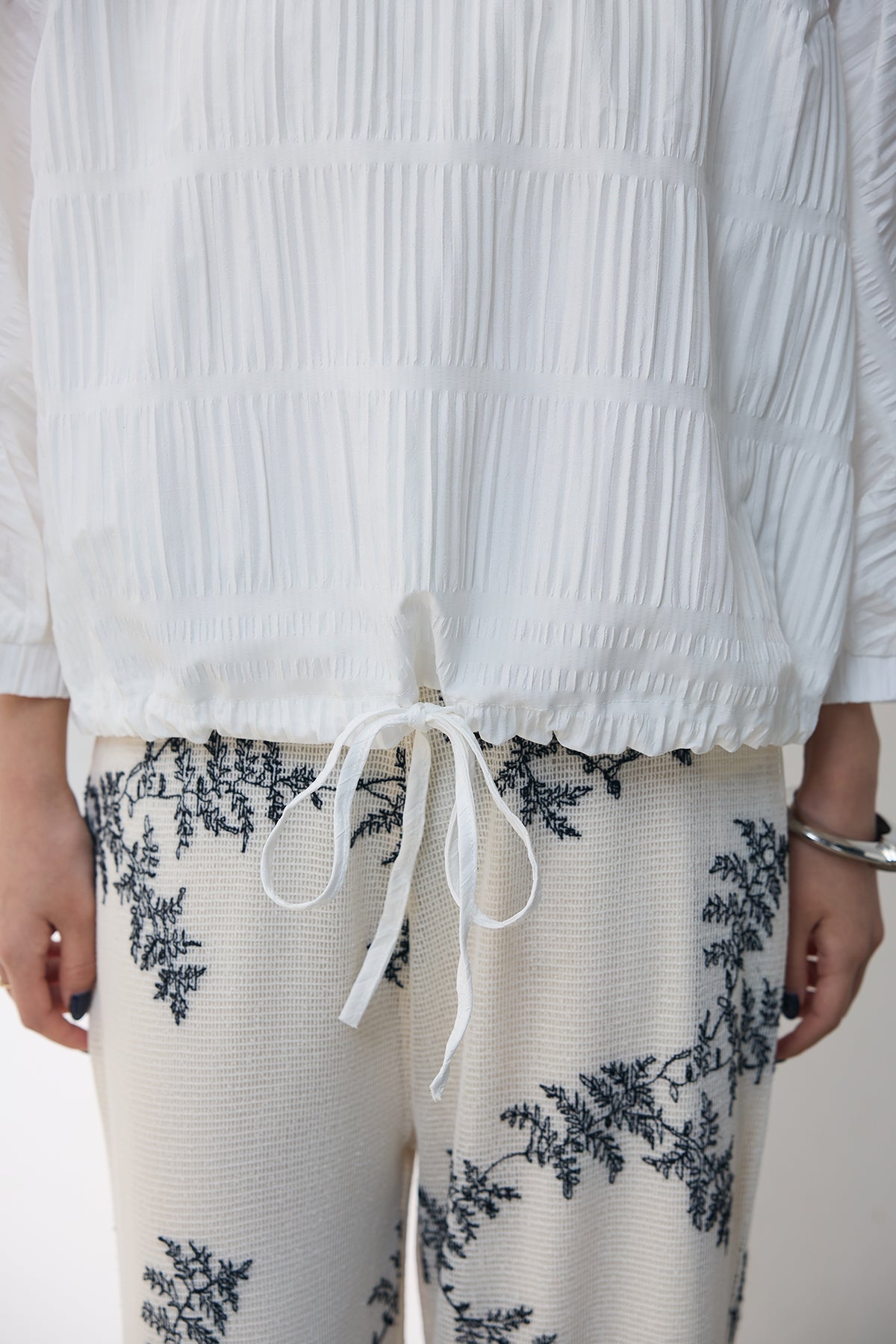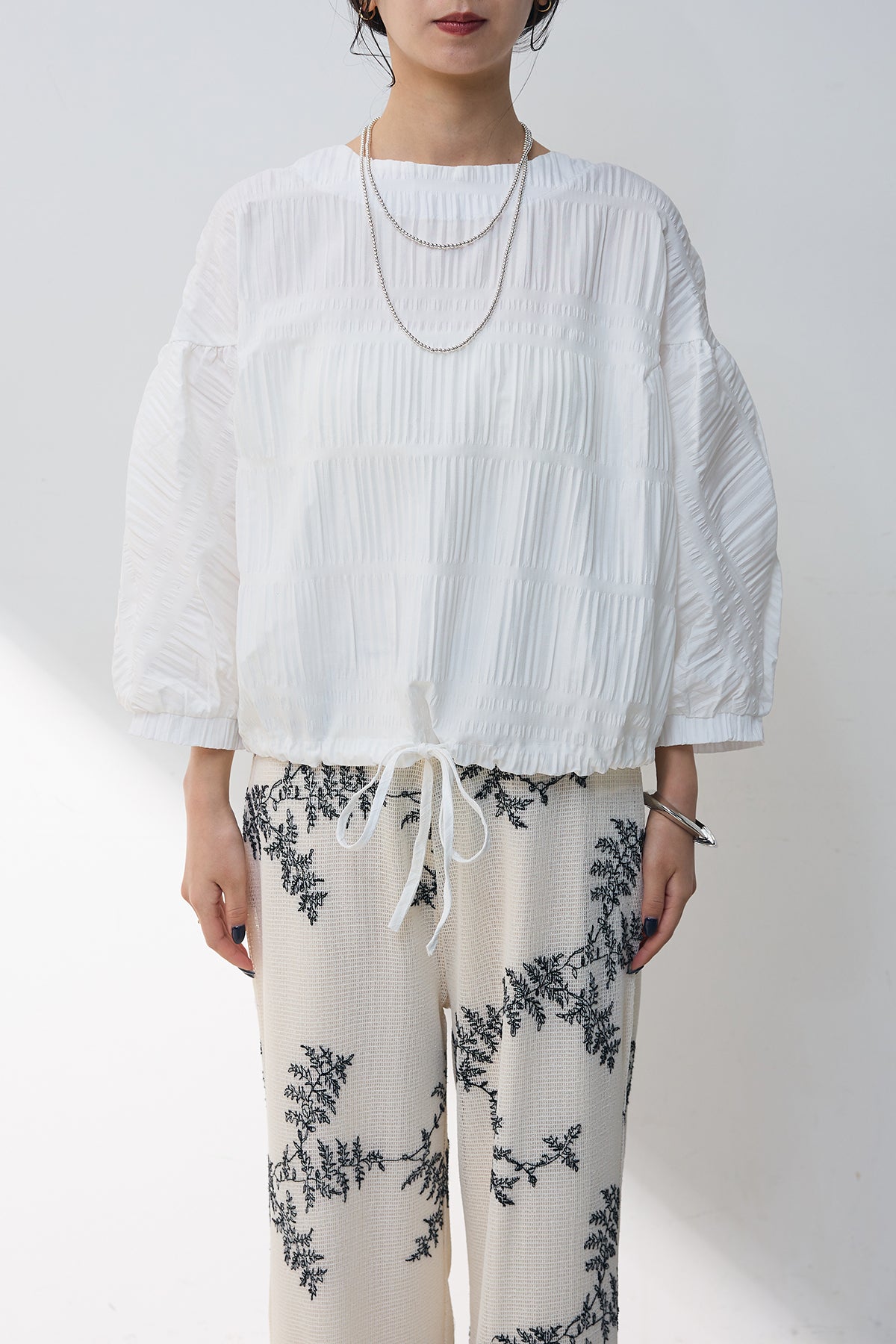 軽やかなシャーリングデザインが魅力のドロストブラウス。程よいシアー感と繊細なプリーツが、表情豊かなシルエットを演出します。裾のドロスト仕様でシルエットの調整が可能。ふんわりとしたボリュームスリーブが、フェミニンな雰囲気をプラスします。デニムやワイドパンツと合わせてカジュアルに、スカートと組み合わせて上品に着こなせる一枚です。