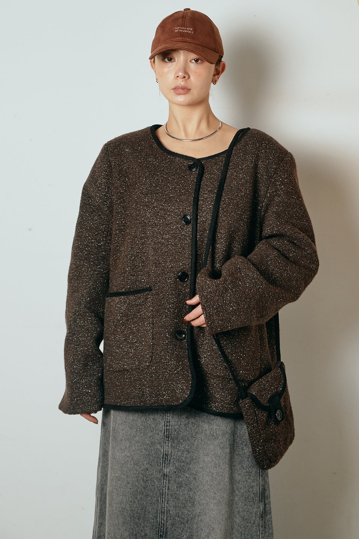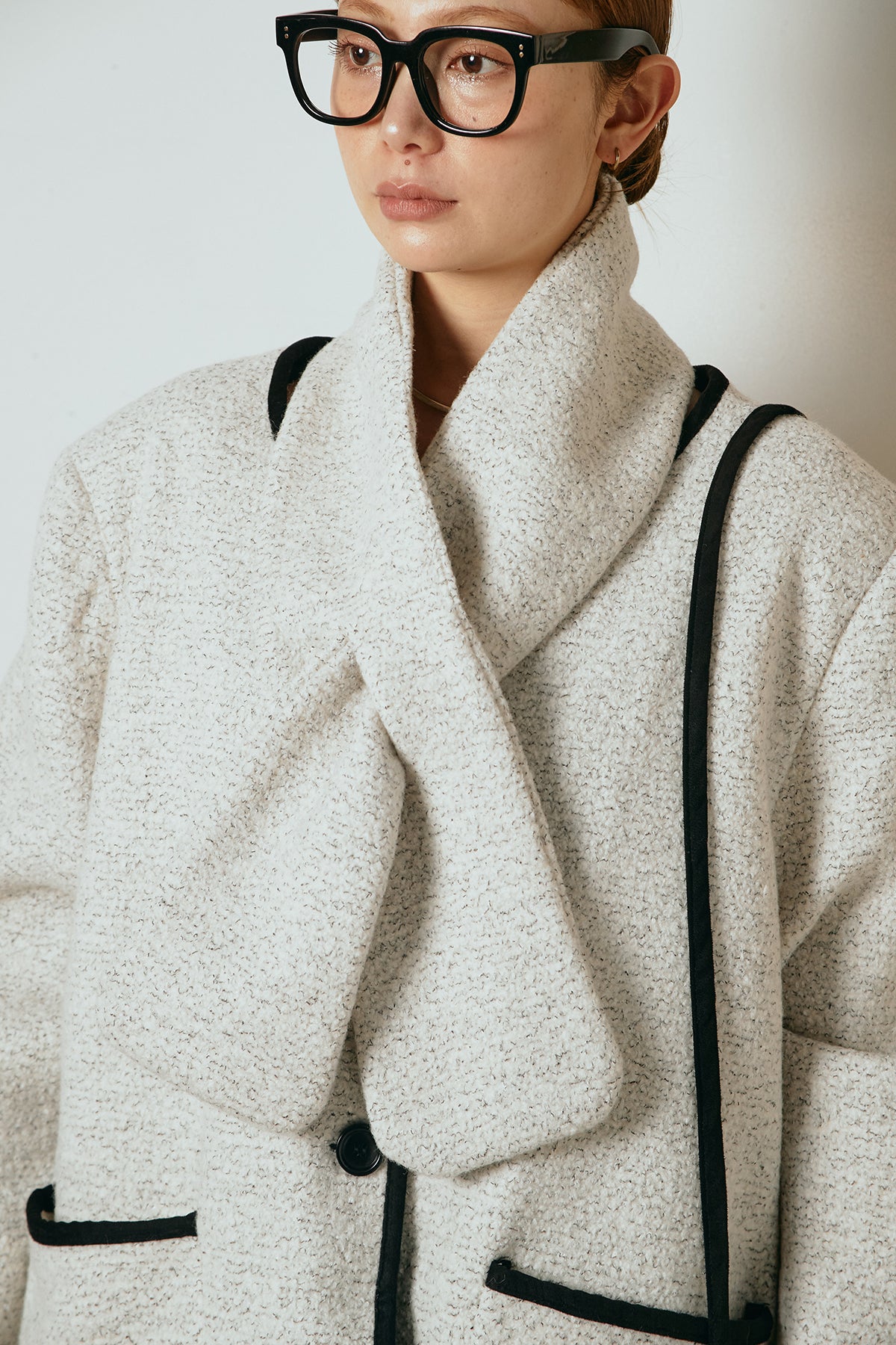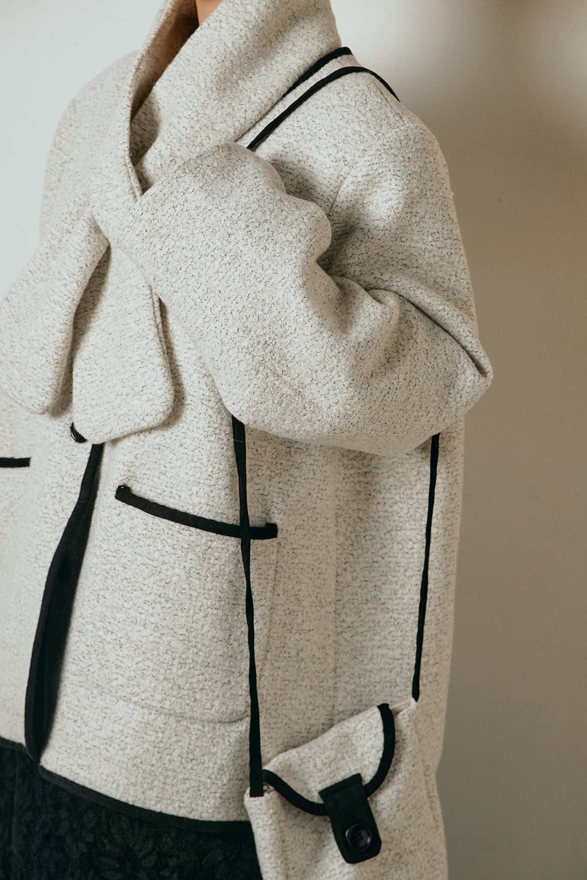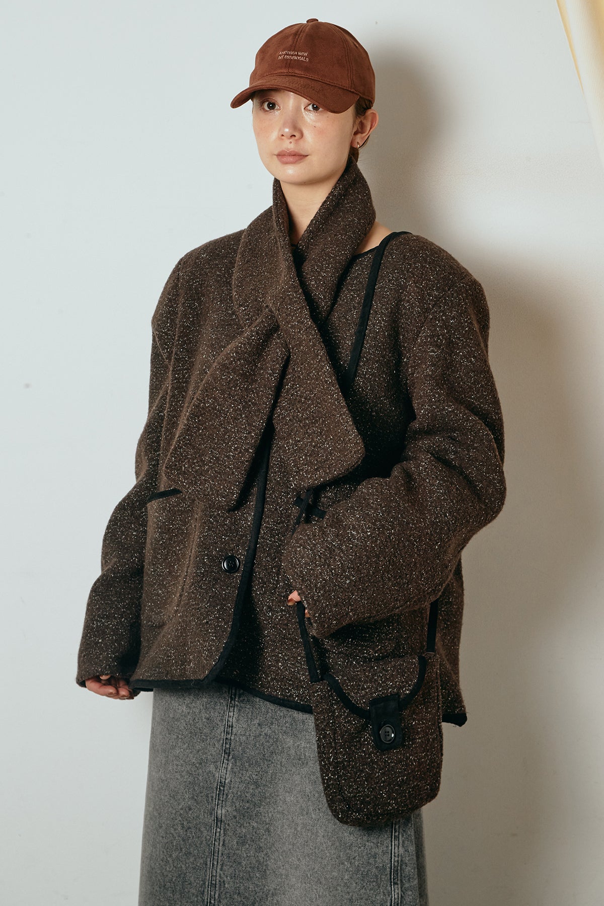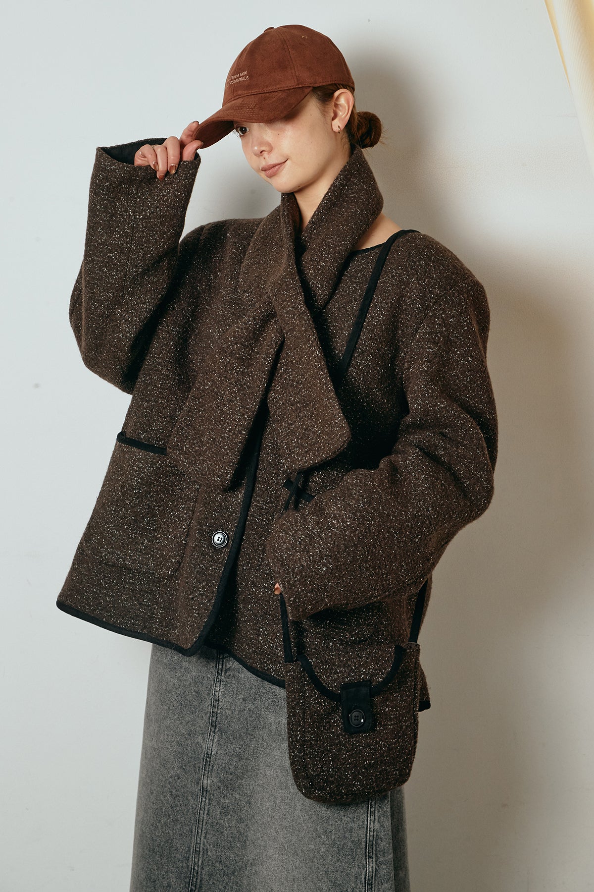 ノーカラーデザインに、マフラーとミニバッグをセットにしたアウター。すっきりとした首元に付属のマフラーを添えることで、実用性とデザイン性を兼ね備えた一枚に仕上げています。配色パイピングが全体を引き締め、さりげないアクセントに。程よくゆとりのあるシルエットで重ね着もしやすく、羽織るだけでスタイリングが完成するアイテムです。