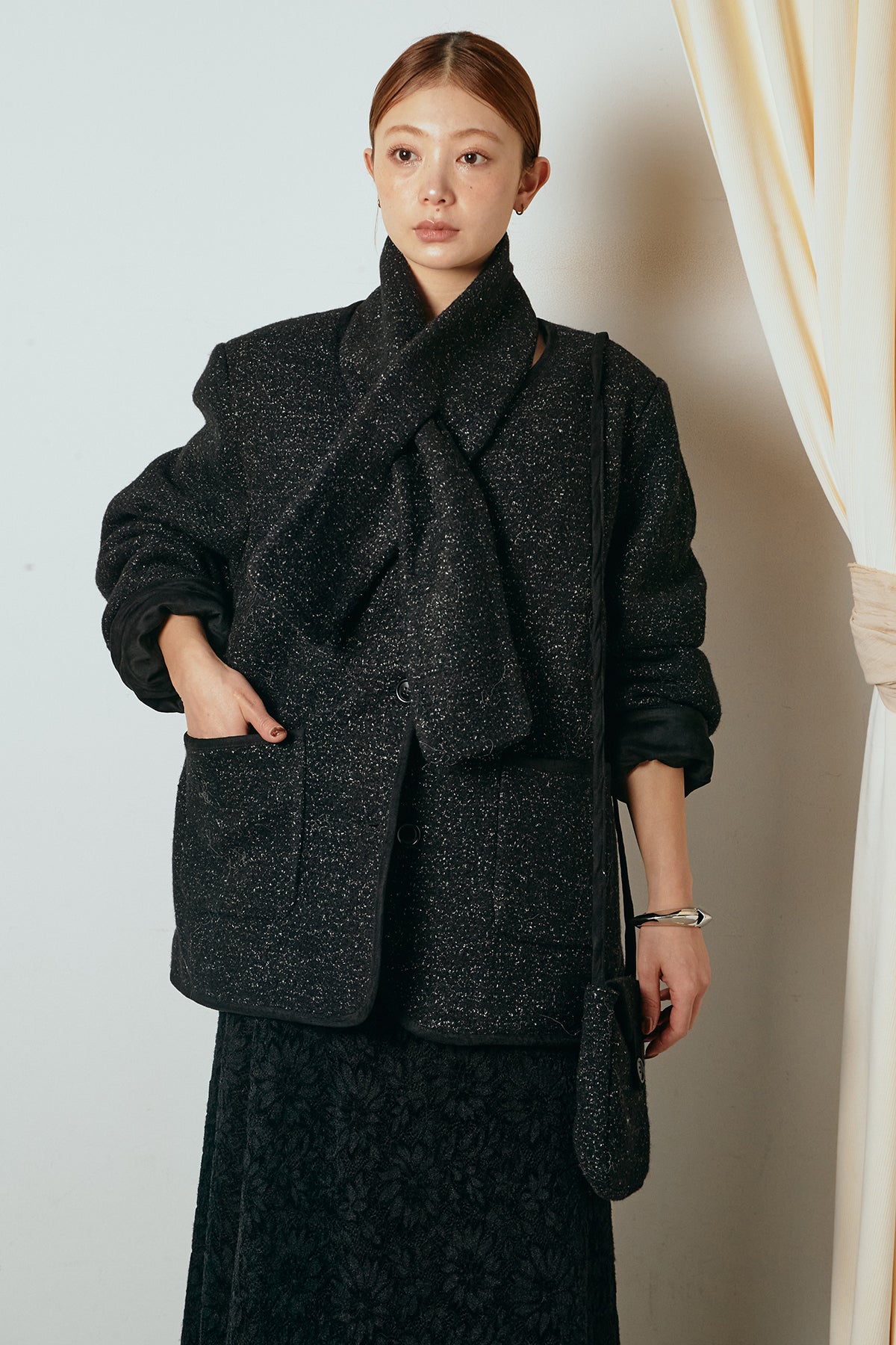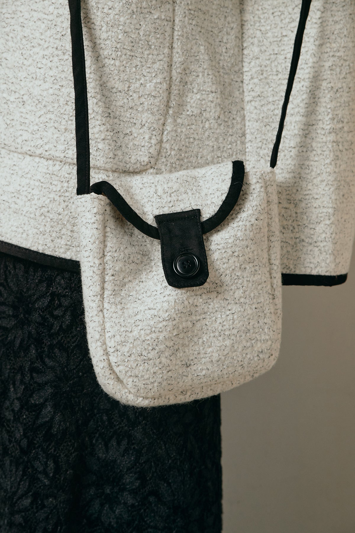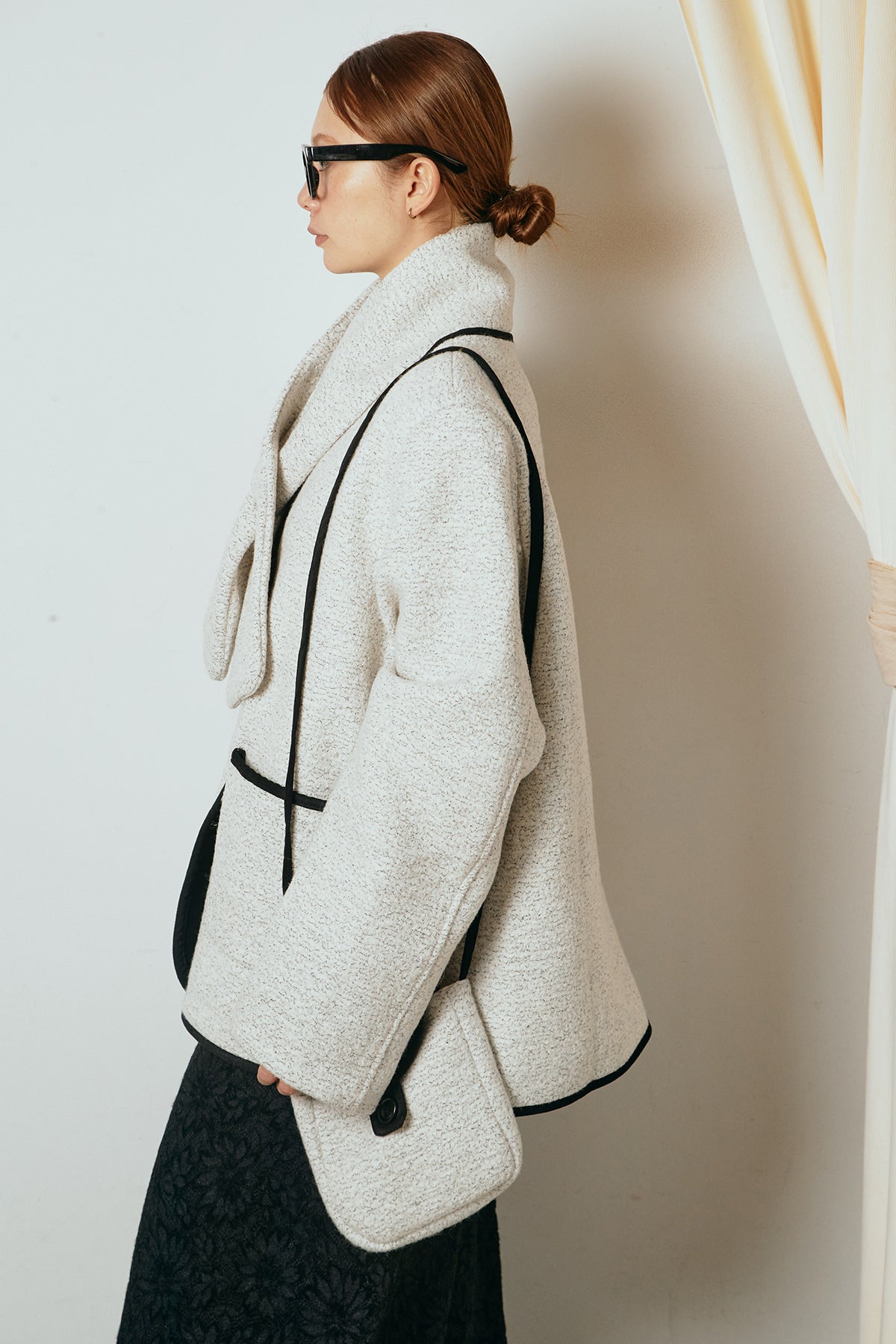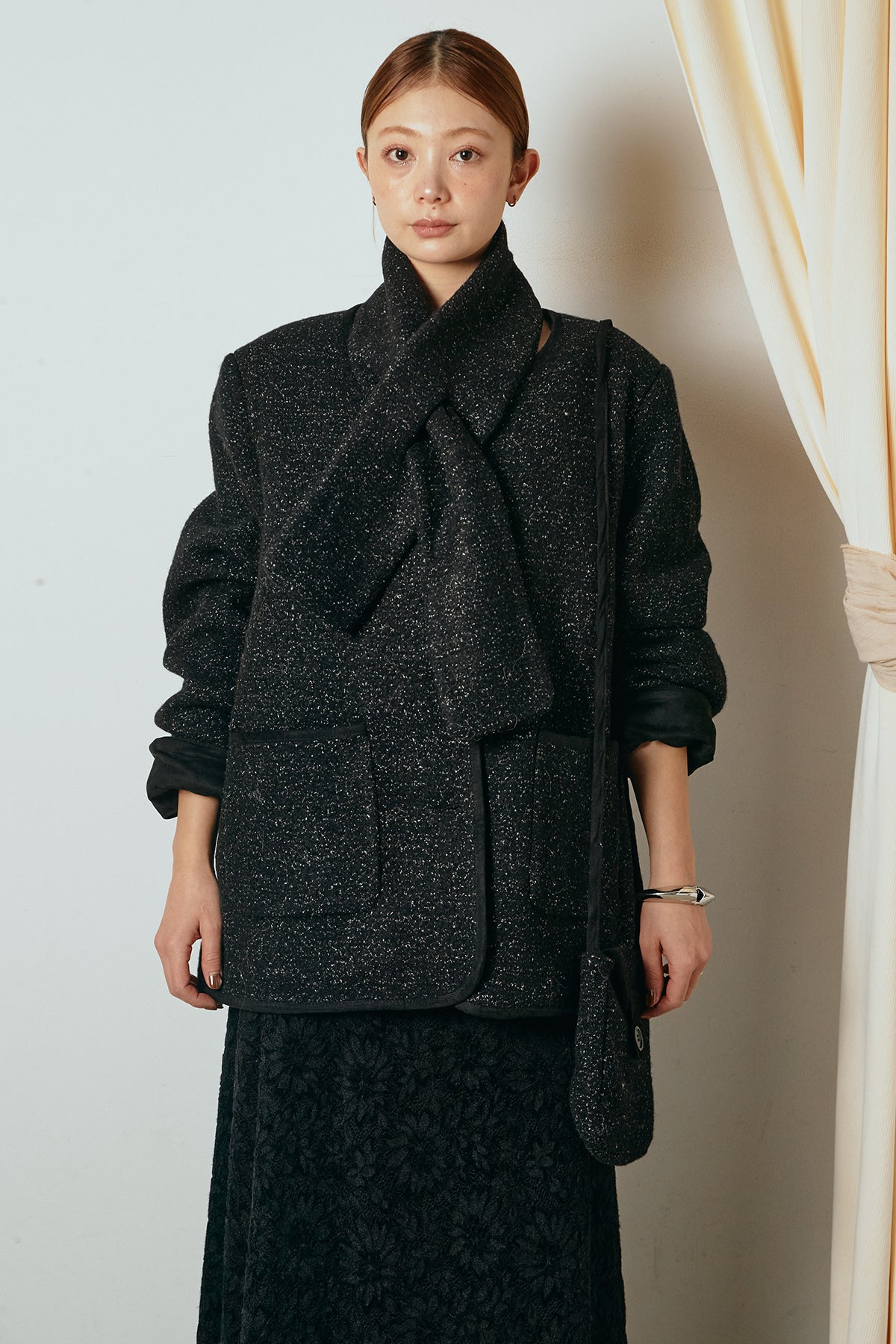 ノーカラーデザインに、マフラーとミニバッグをセットにしたアウター。すっきりとした首元に付属のマフラーを添えることで、実用性とデザイン性を兼ね備えた一枚に仕上げています。配色パイピングが全体を引き締め、さりげないアクセントに。程よくゆとりのあるシルエットで重ね着もしやすく、羽織るだけでスタイリングが完成するアイテムです。