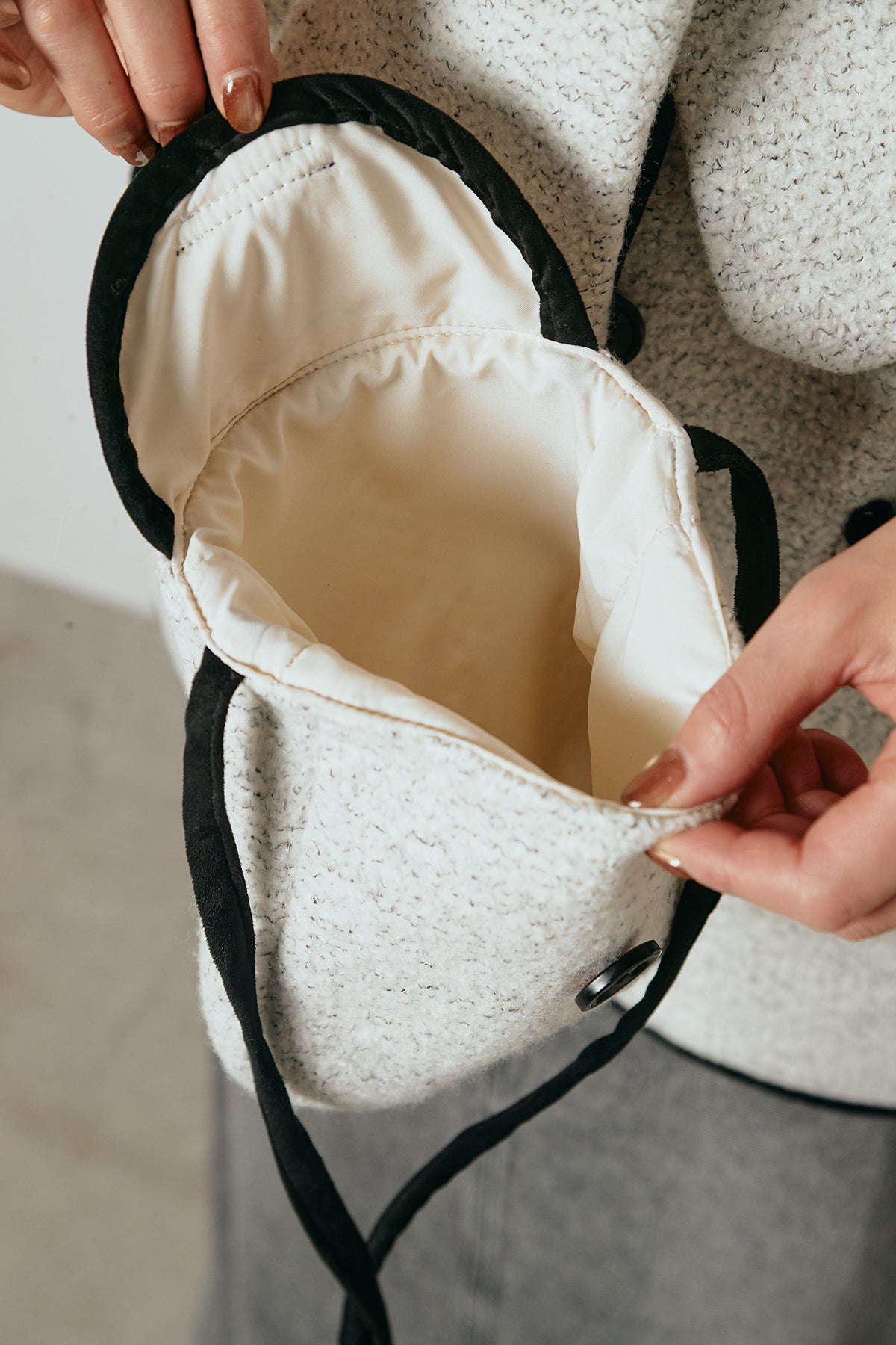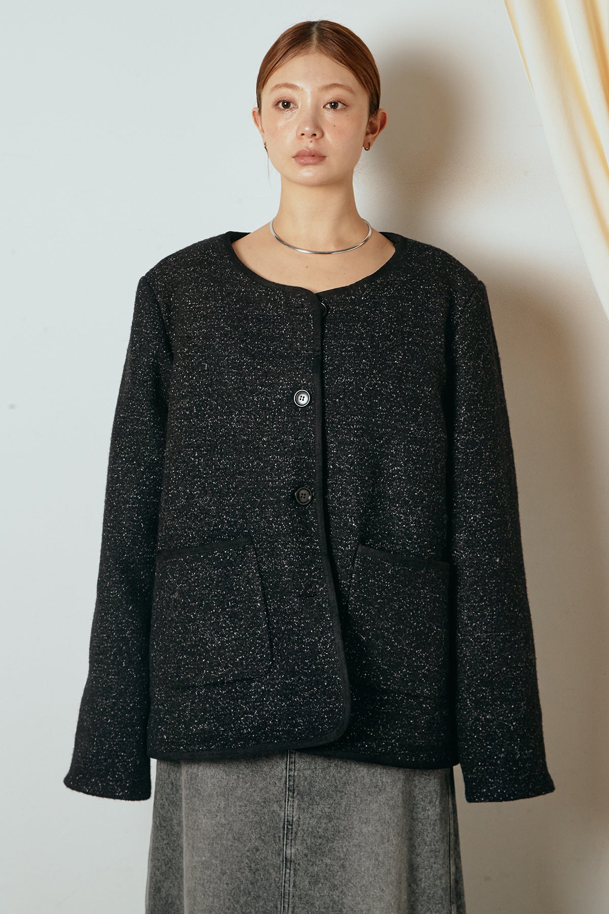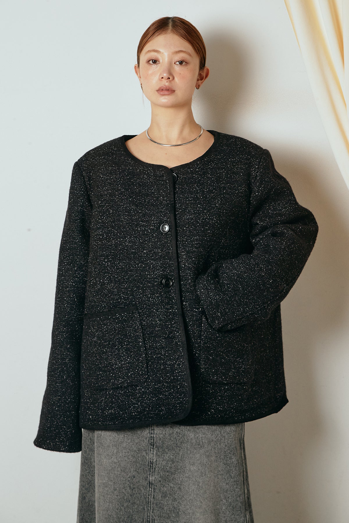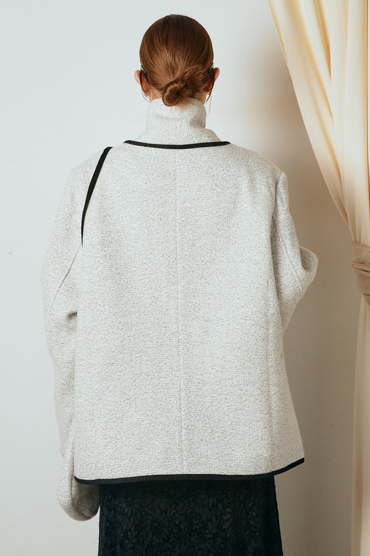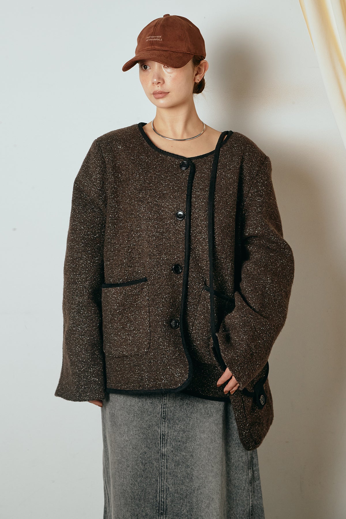 ノーカラーデザインに、マフラーとミニバッグをセットにしたアウター。すっきりとした首元に付属のマフラーを添えることで、実用性とデザイン性を兼ね備えた一枚に仕上げています。配色パイピングが全体を引き締め、さりげないアクセントに。程よくゆとりのあるシルエットで重ね着もしやすく、羽織るだけでスタイリングが完成するアイテムです。