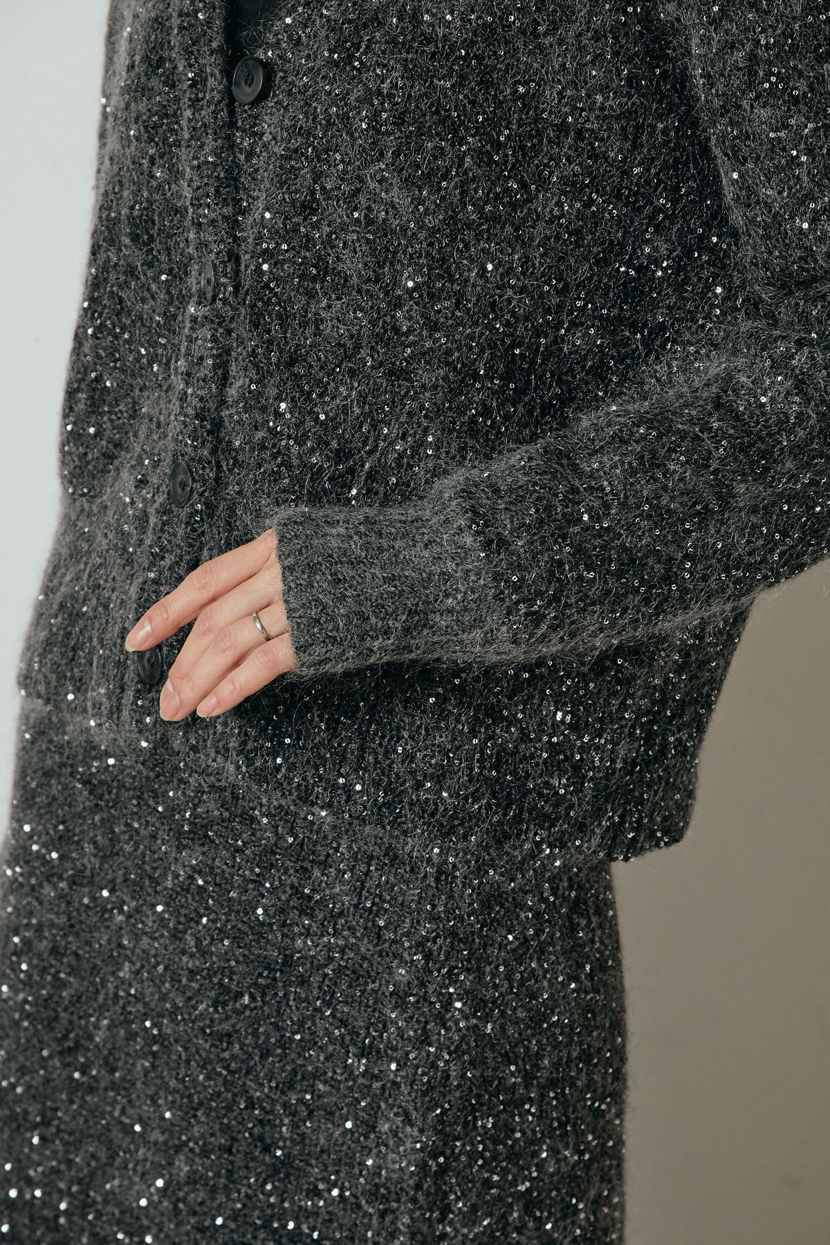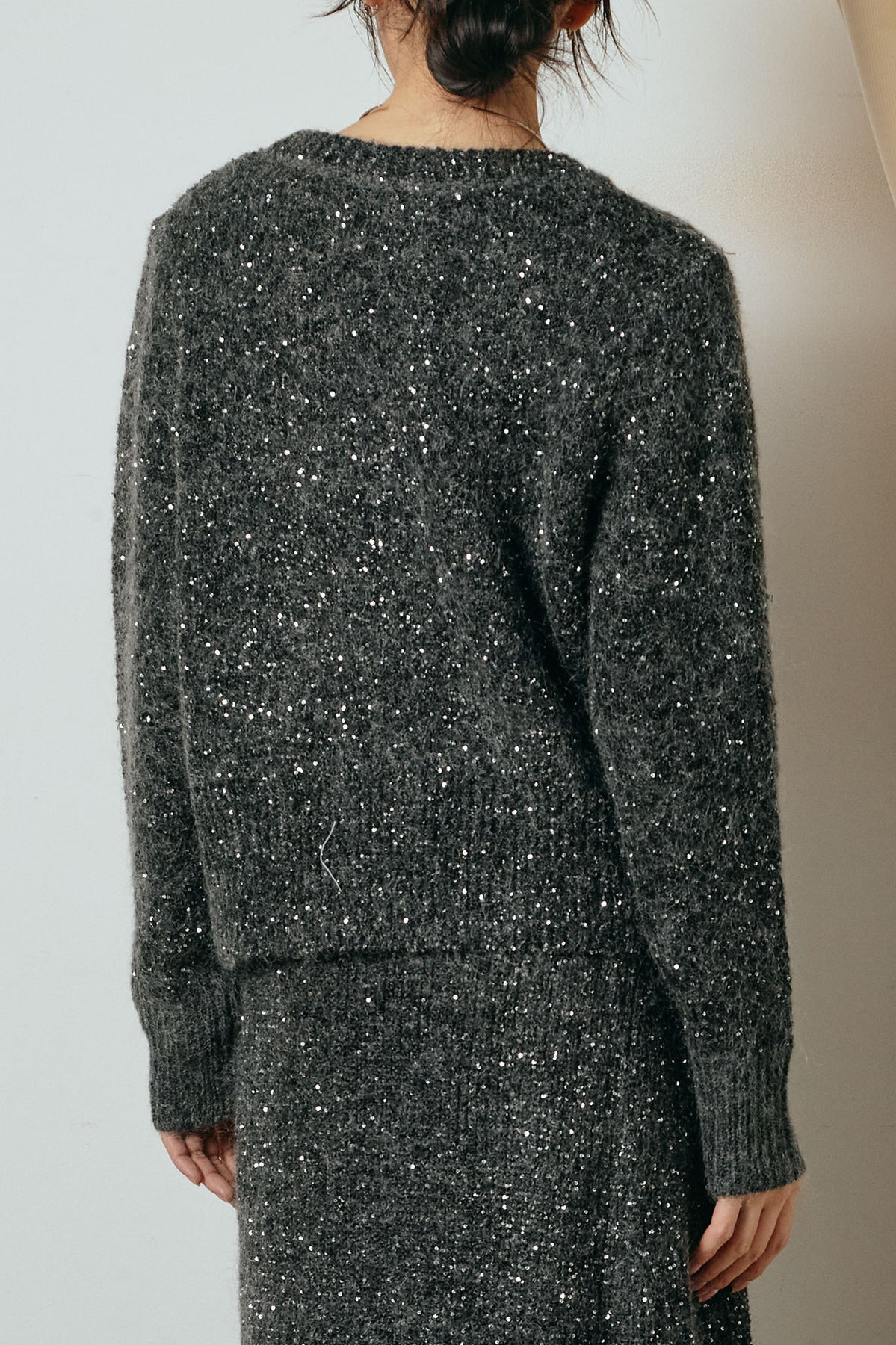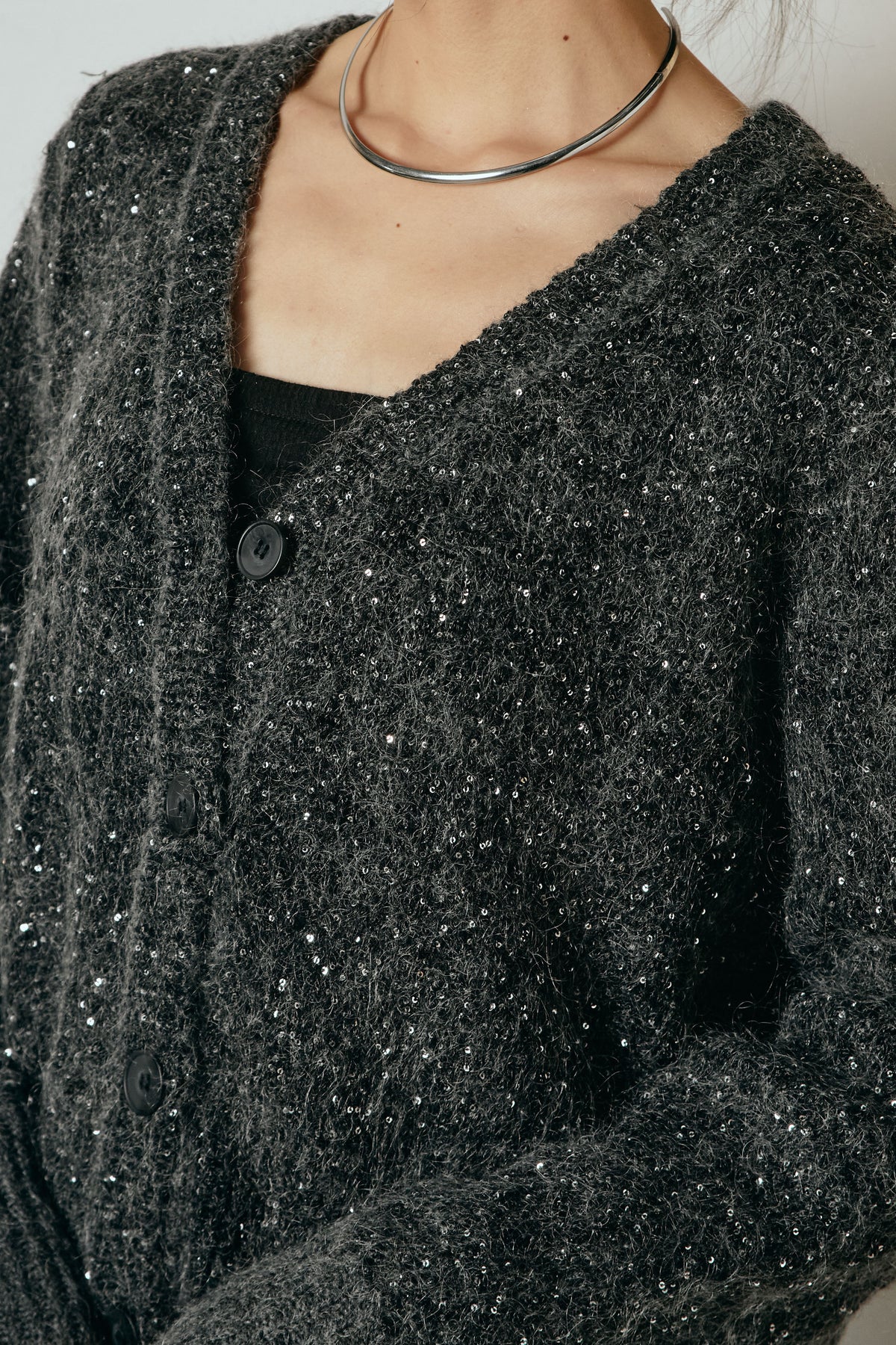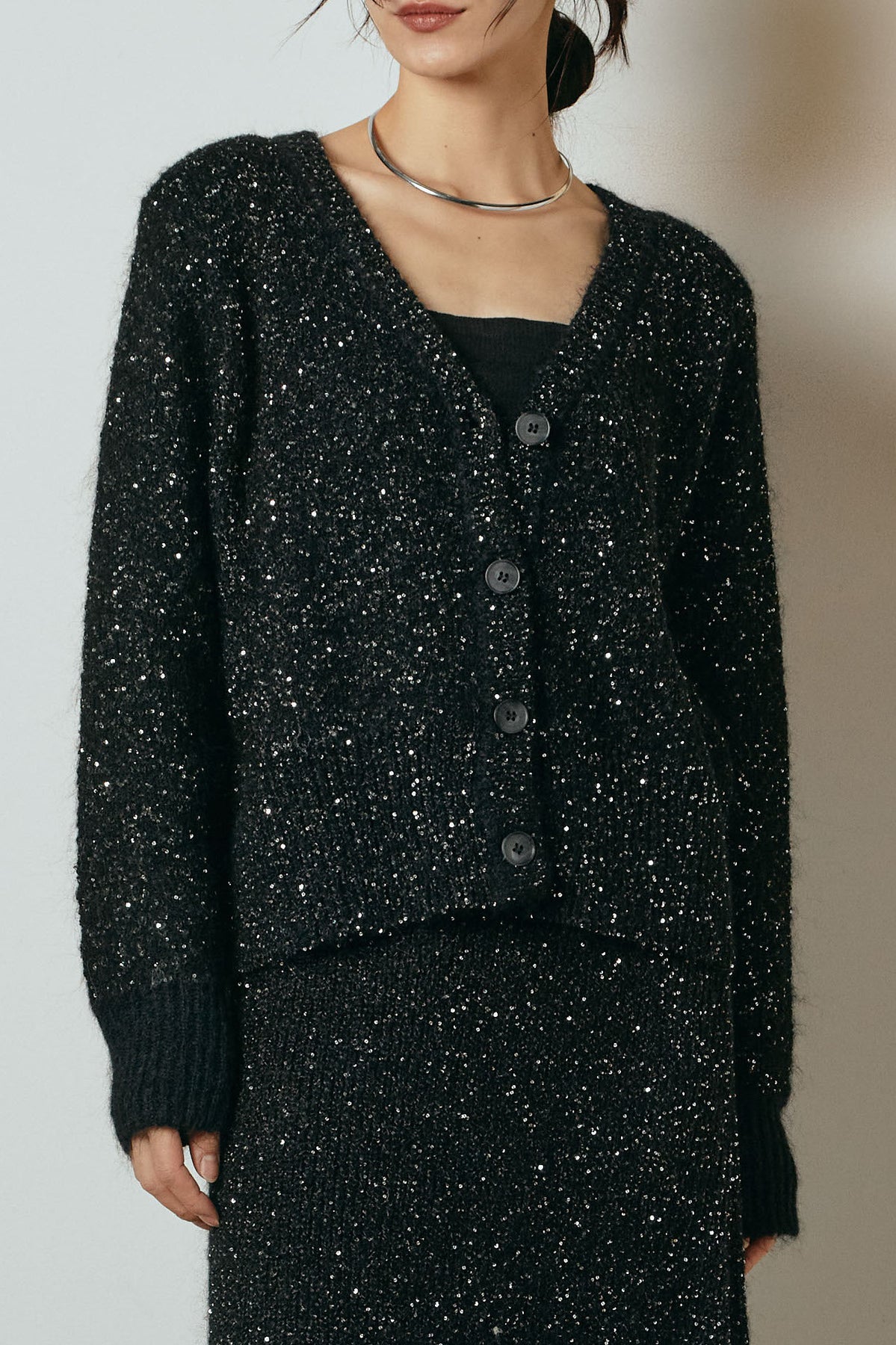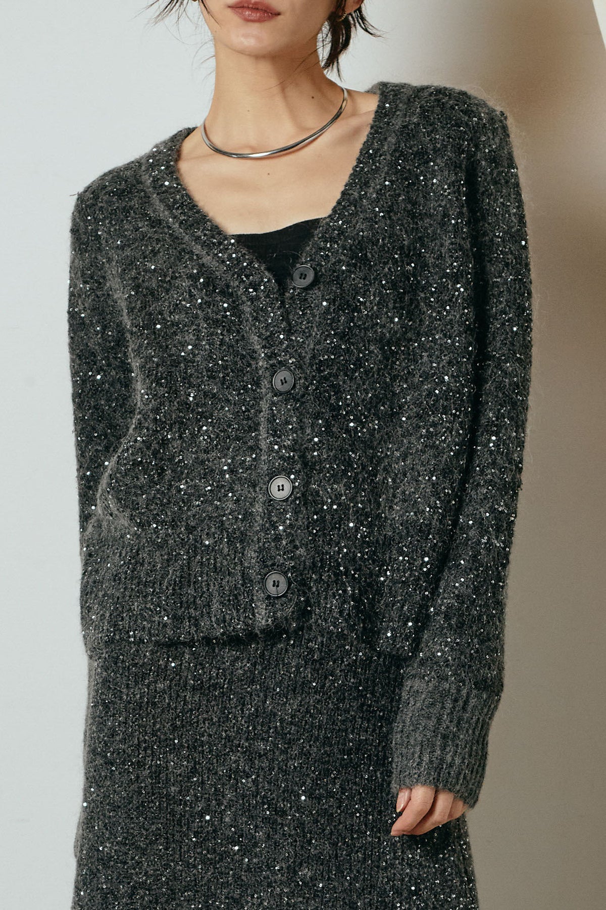 ラメ糸を織り込んだニット素材が、さりげない輝きを添えるカーディガン。深めのVネックとすっきりとしたシルエットで、甘くなりすぎず大人っぽい印象に仕上げています。軽やかな着心地ながらも程よい存在感があり、羽織るだけでスタイリングに華やかさをプラス。ボタンを留めても開けてもバランスよく、デイリーからきれいめまで幅広く活躍する一枚です。