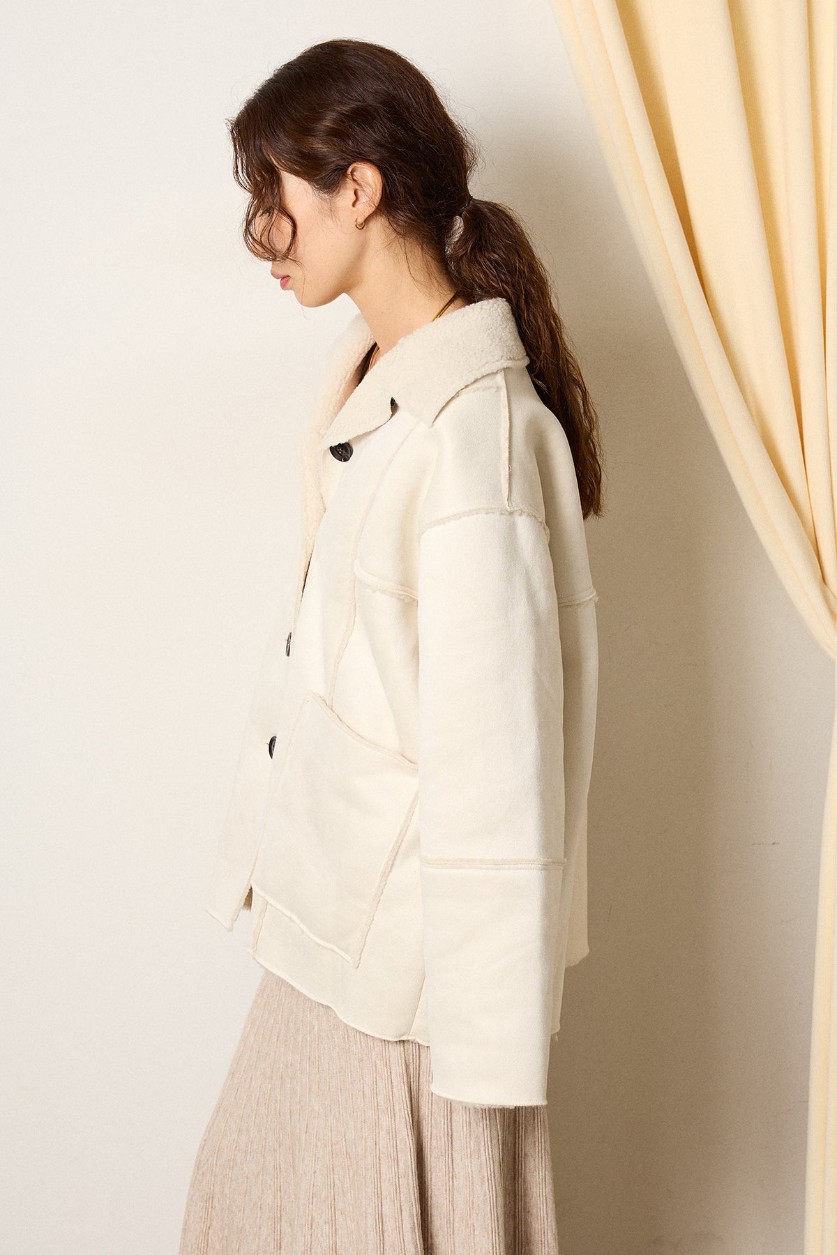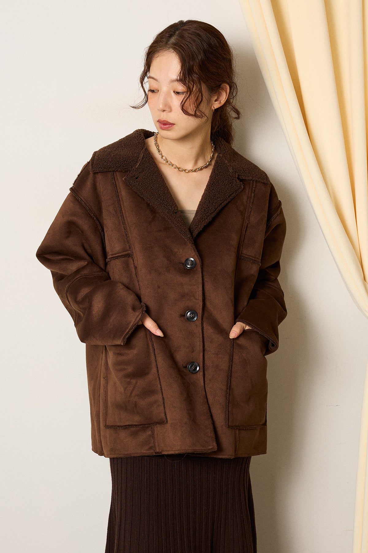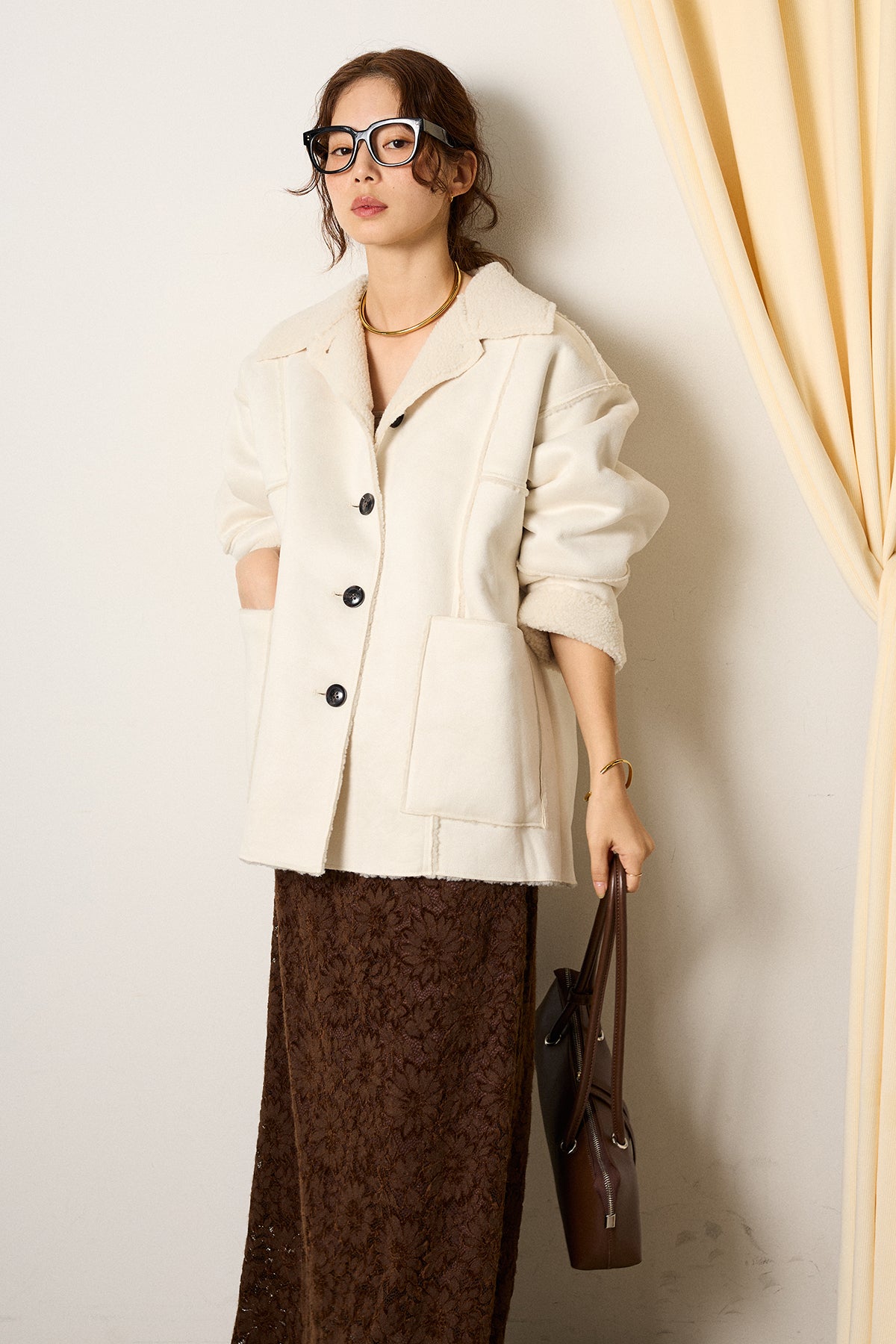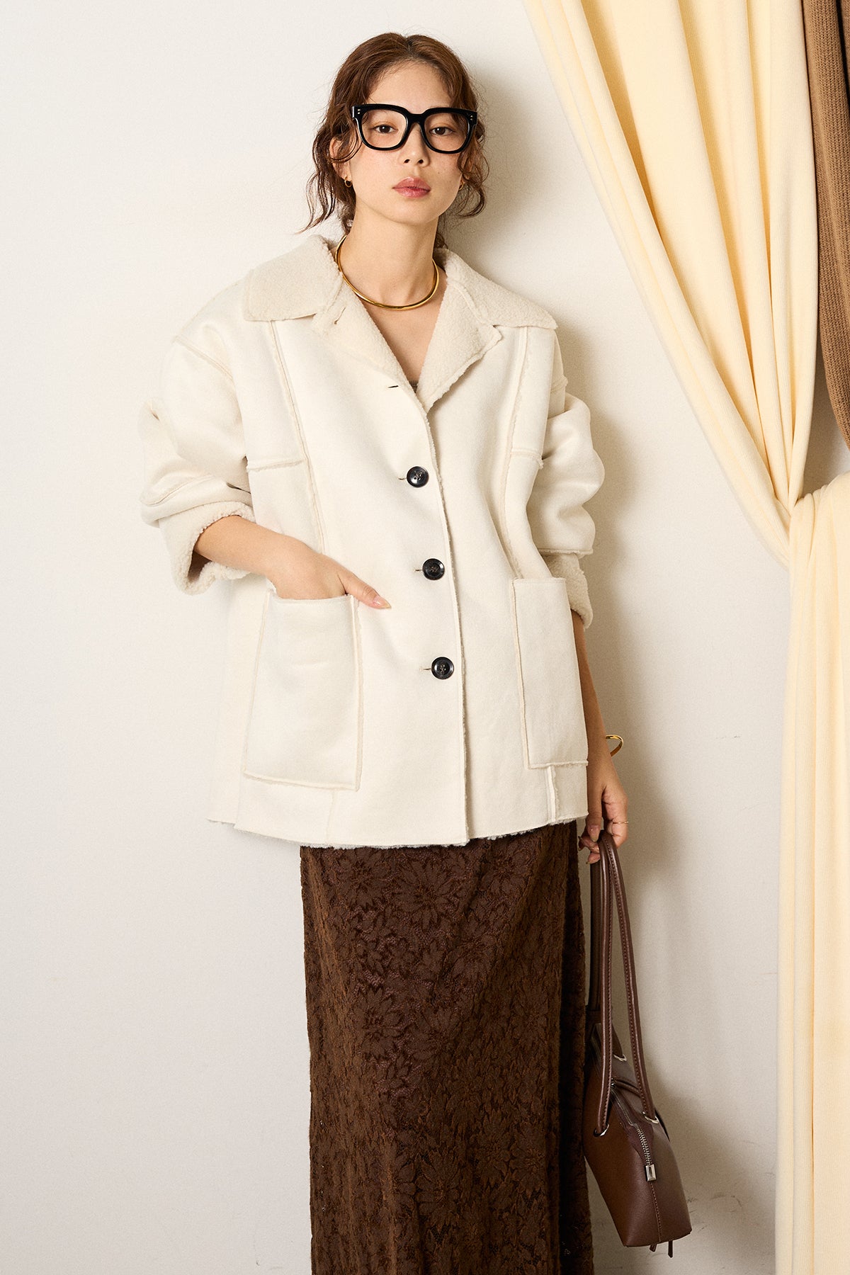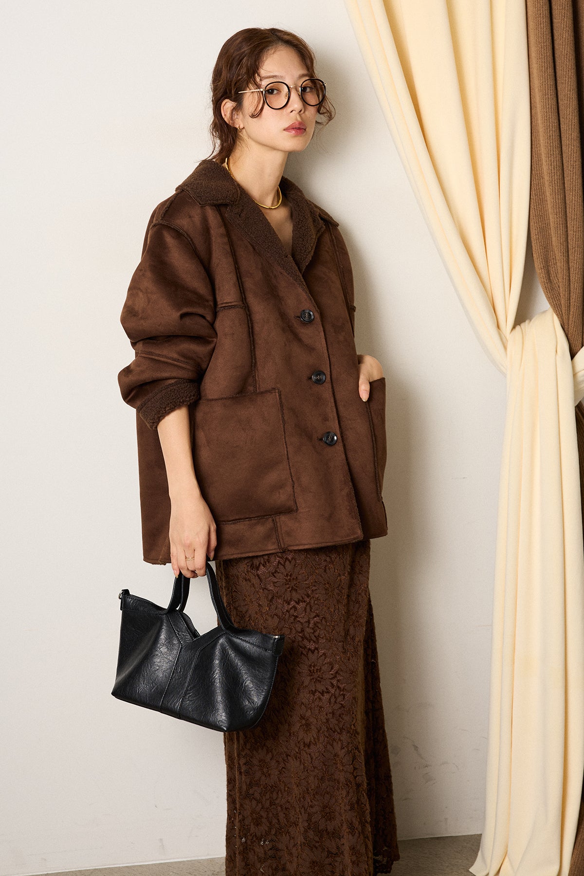 程よくボリュームのあるシルエットが魅力のエコムートンカバーオール。 滑らかなスエード調素材とふんわりとした裏ボアの組み合わせで、見た目にも暖かく季節感たっぷり。 ゆったりとした身幅で厚手のニットにも重ねやすく、デイリー使いに最適です。 大きめのポケットがアクセントになり、実用性とデザイン性を兼ね備えた一枚。