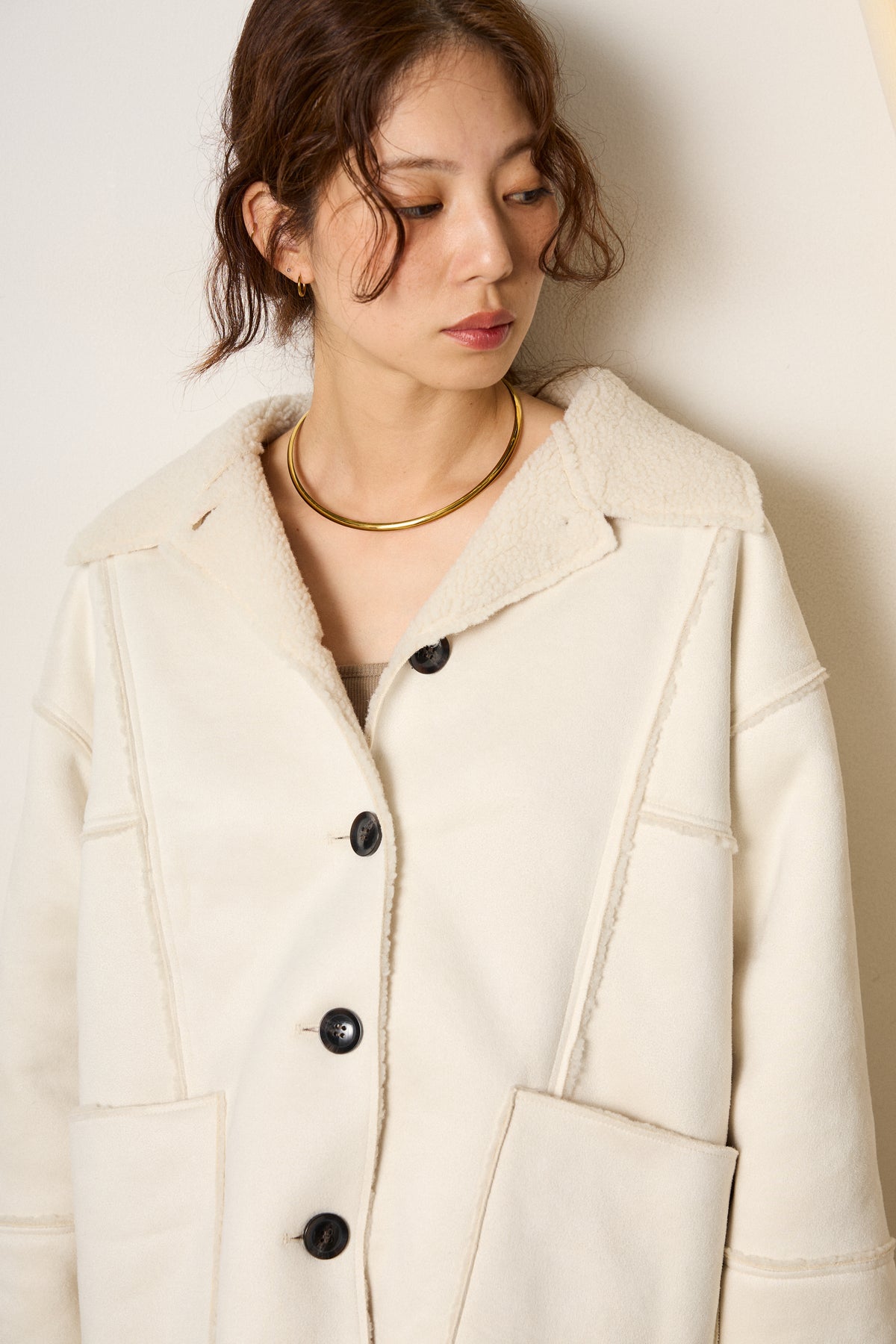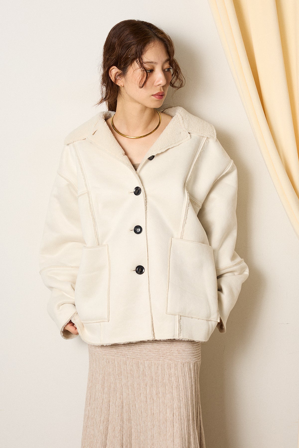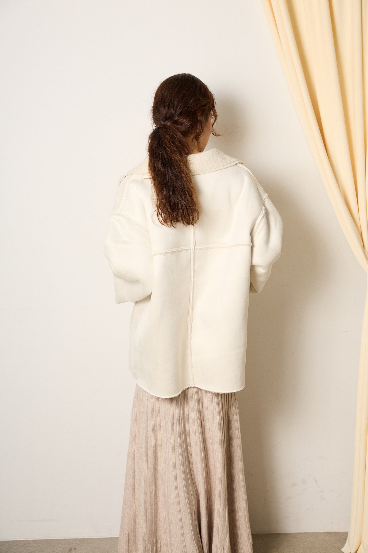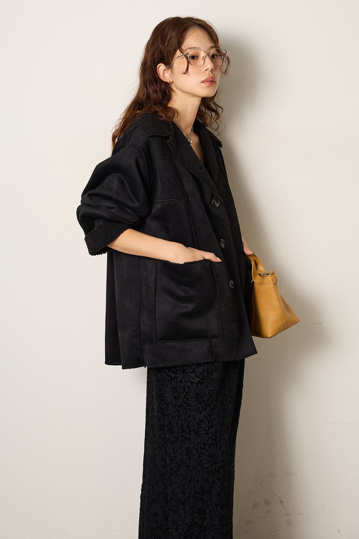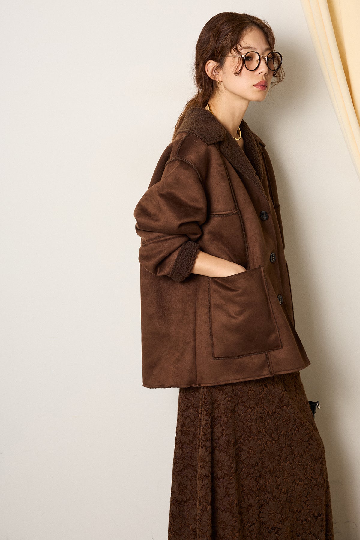 程よくボリュームのあるシルエットが魅力のエコムートンカバーオール。 滑らかなスエード調素材とふんわりとした裏ボアの組み合わせで、見た目にも暖かく季節感たっぷり。 ゆったりとした身幅で厚手のニットにも重ねやすく、デイリー使いに最適です。 大きめのポケットがアクセントになり、実用性とデザイン性を兼ね備えた一枚。