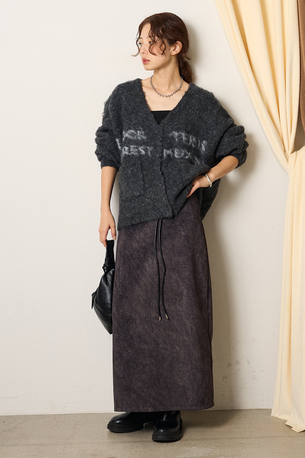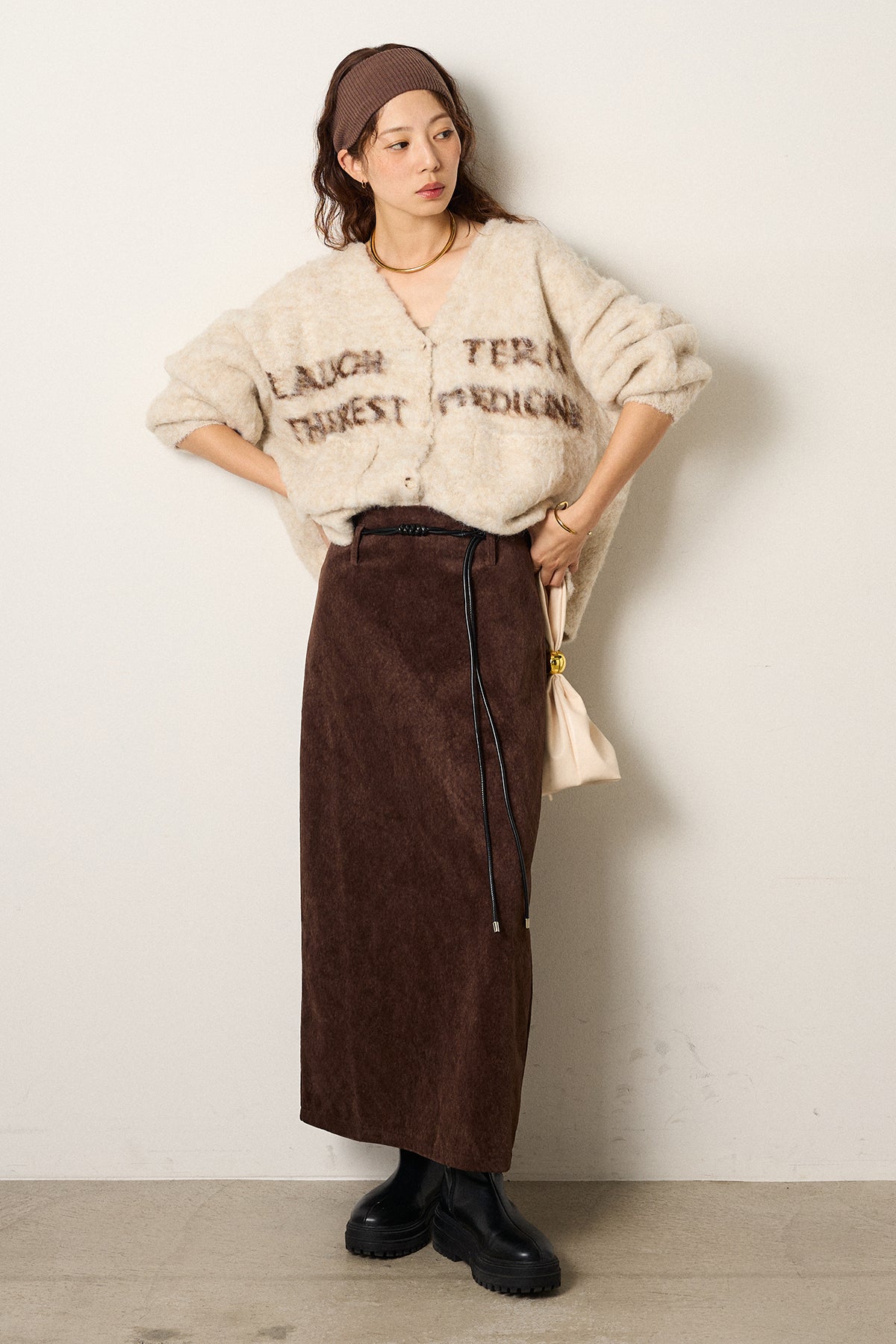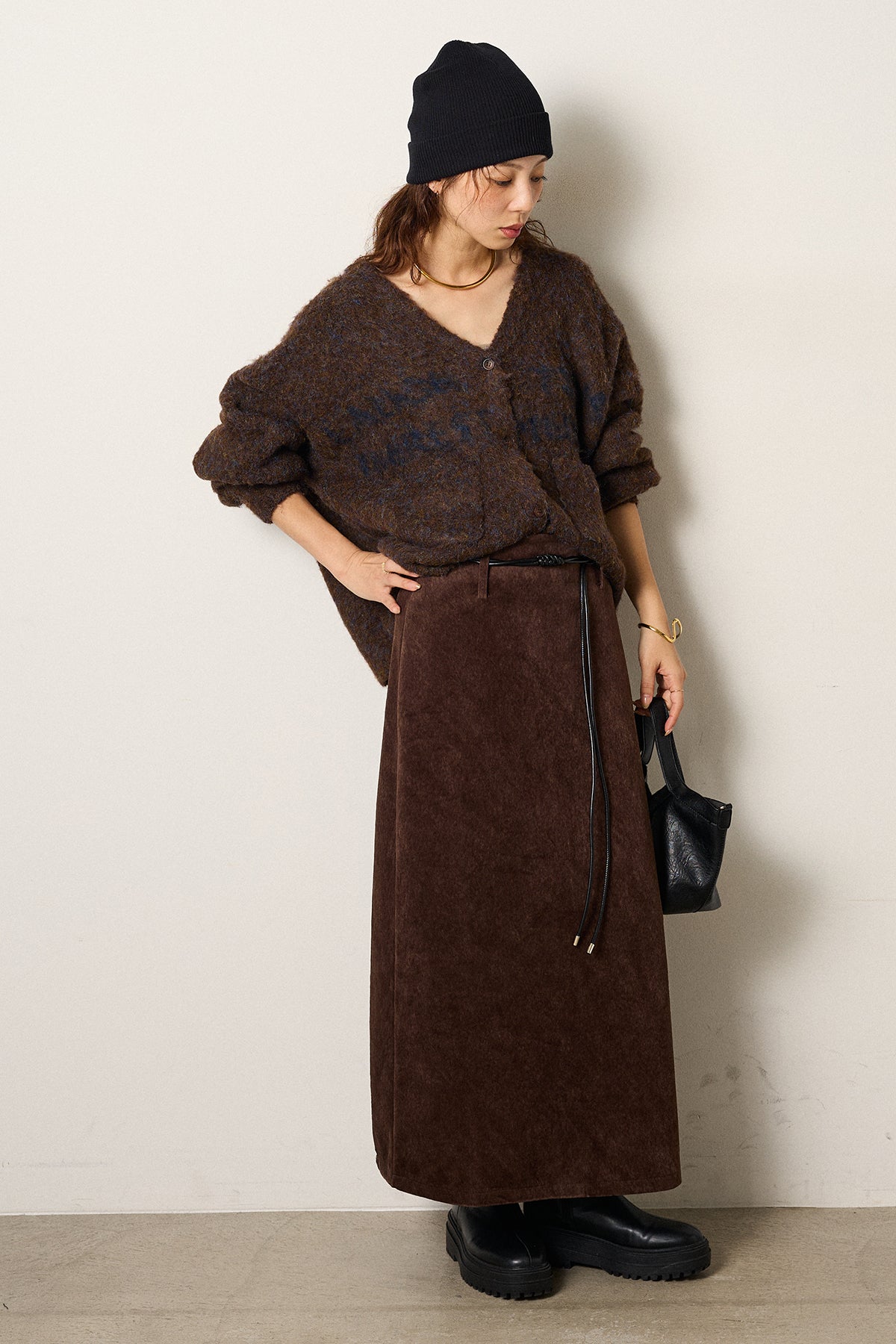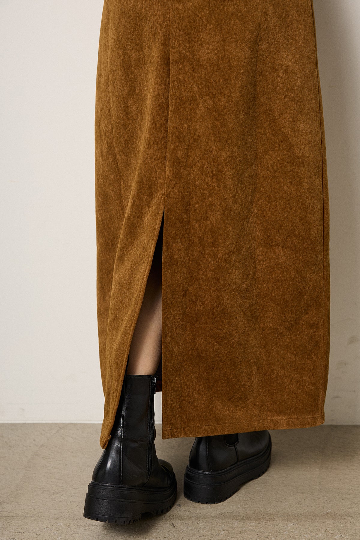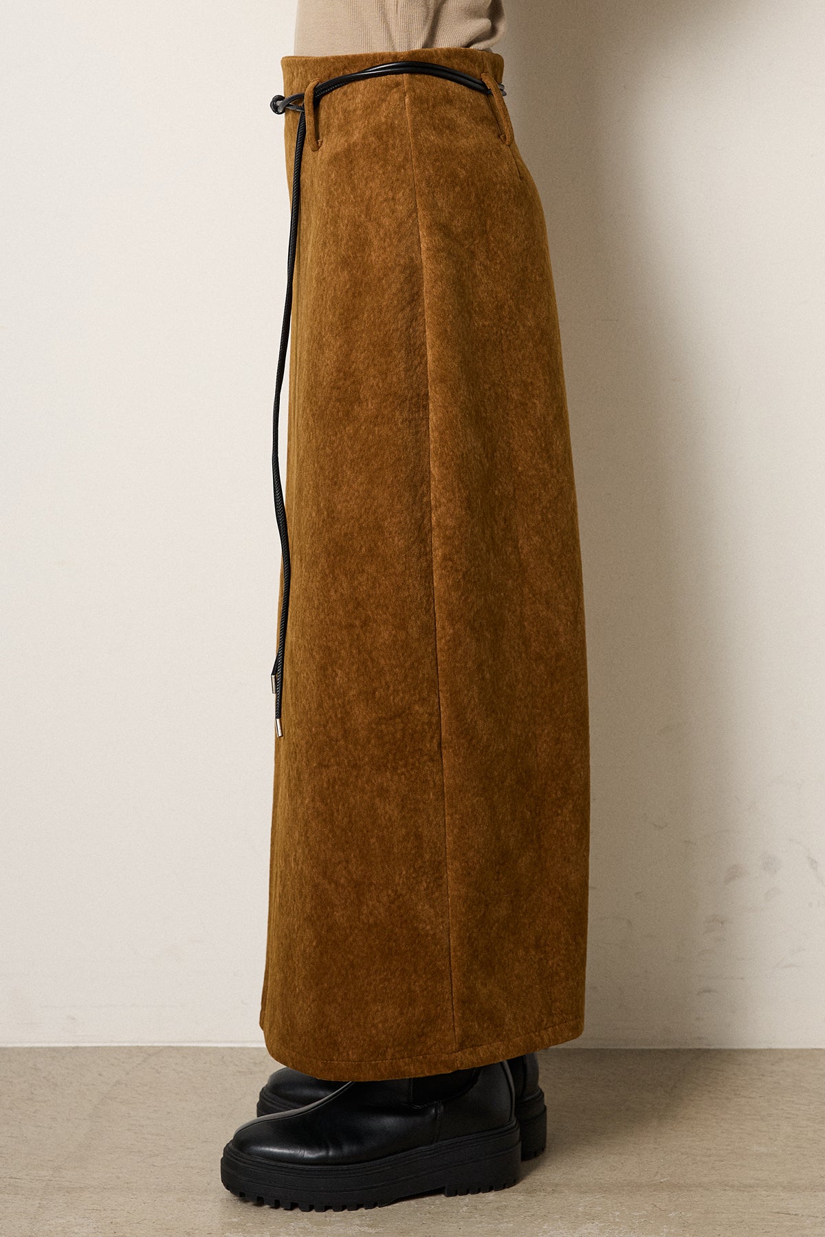 起毛感のあるスウェード調素材で、シーズンムード漂うロングスカート。 すっきりとしたストレートシルエットが美しく、付属のロープベルトがさりげないアクセントに。 柔らかな質感がスタイリングに温かみを与え、トップスをインすればメリハリのあるバランスに仕上がります。 ブーツとの相性も良く、秋冬の装いに取り入れやすい一枚です。