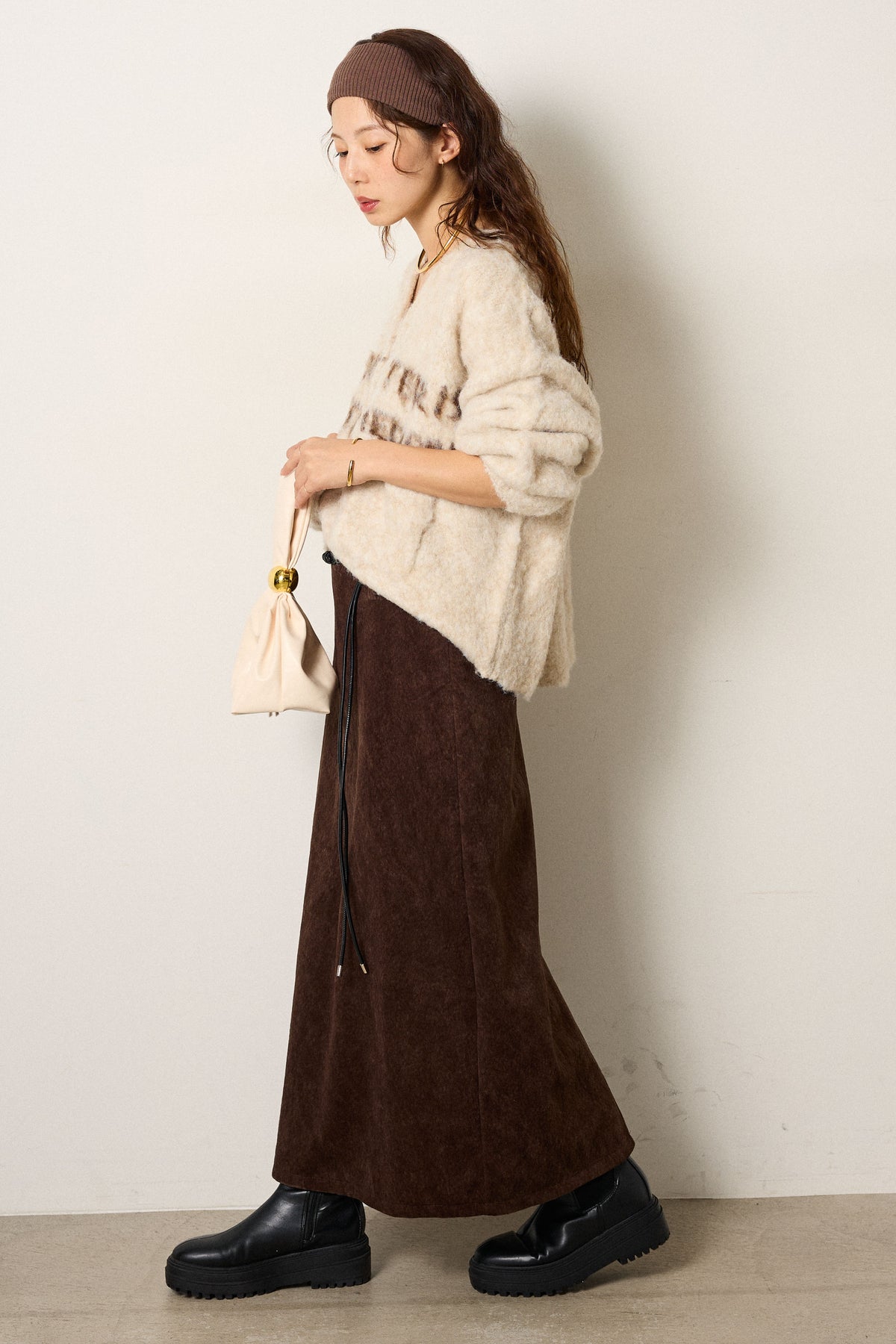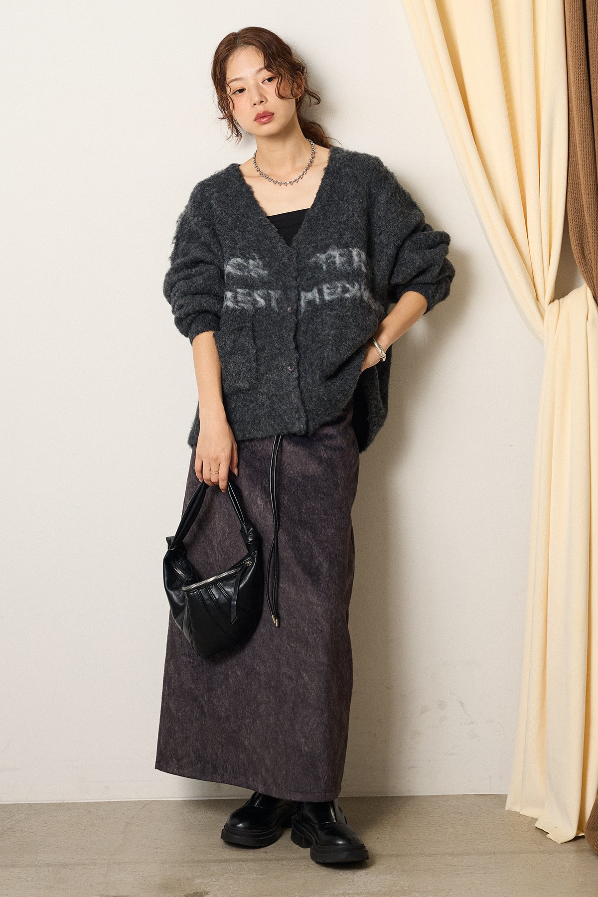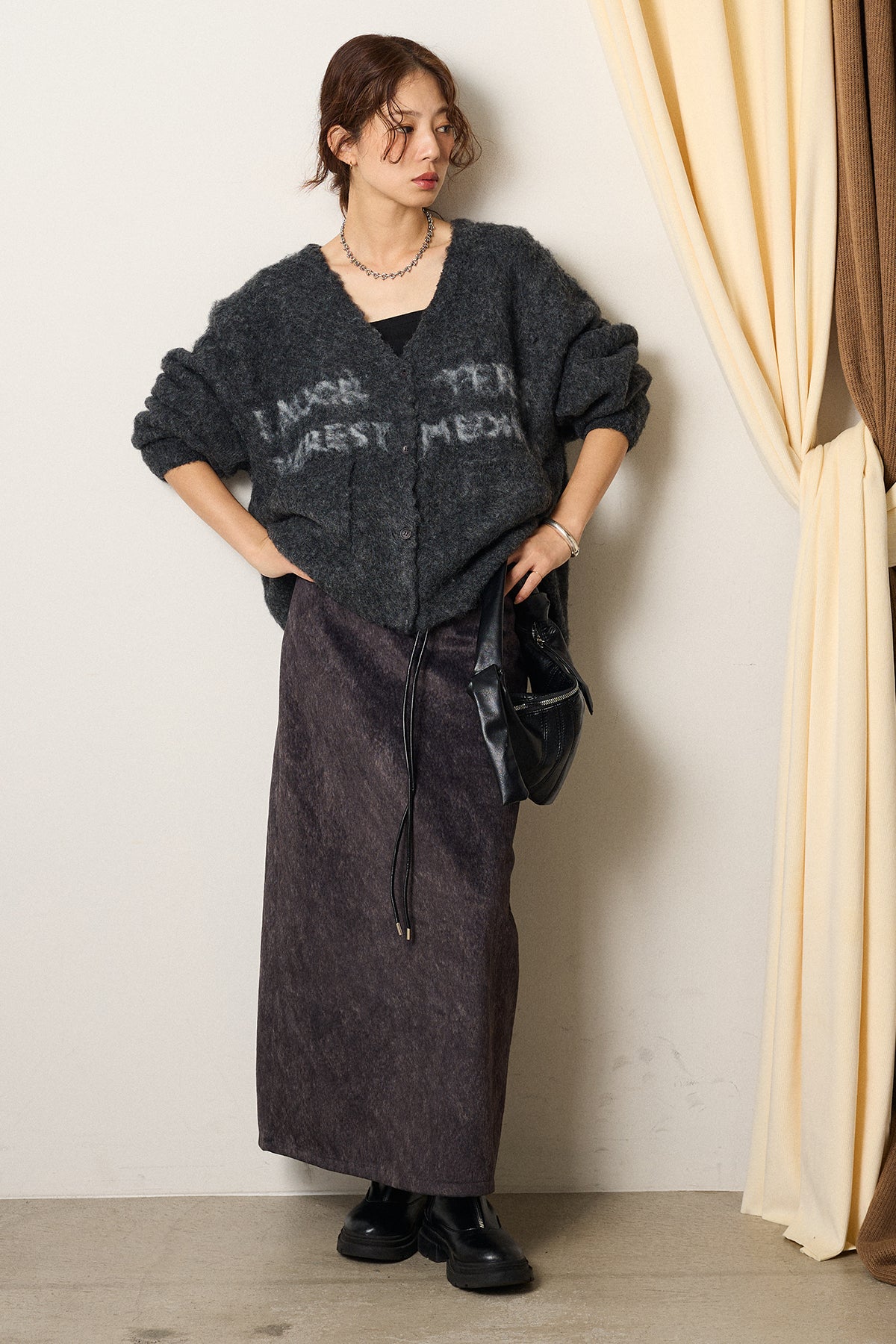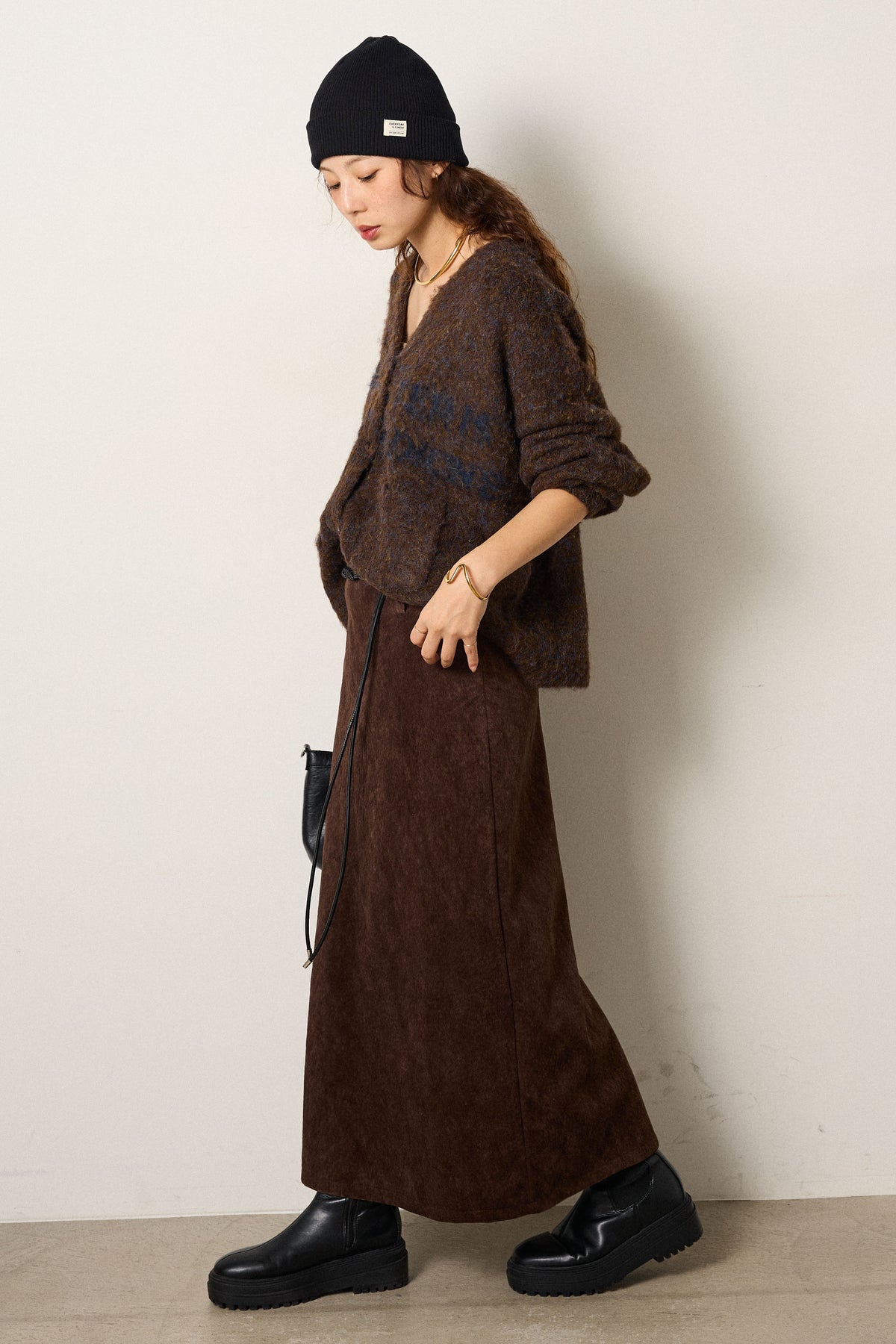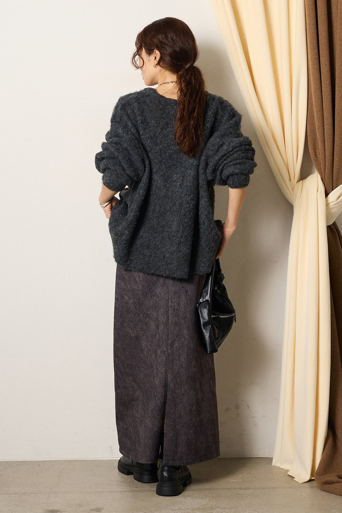 起毛感のあるスウェード調素材で、シーズンムード漂うロングスカート。 すっきりとしたストレートシルエットが美しく、付属のロープベルトがさりげないアクセントに。 柔らかな質感がスタイリングに温かみを与え、トップスをインすればメリハリのあるバランスに仕上がります。 ブーツとの相性も良く、秋冬の装いに取り入れやすい一枚です。