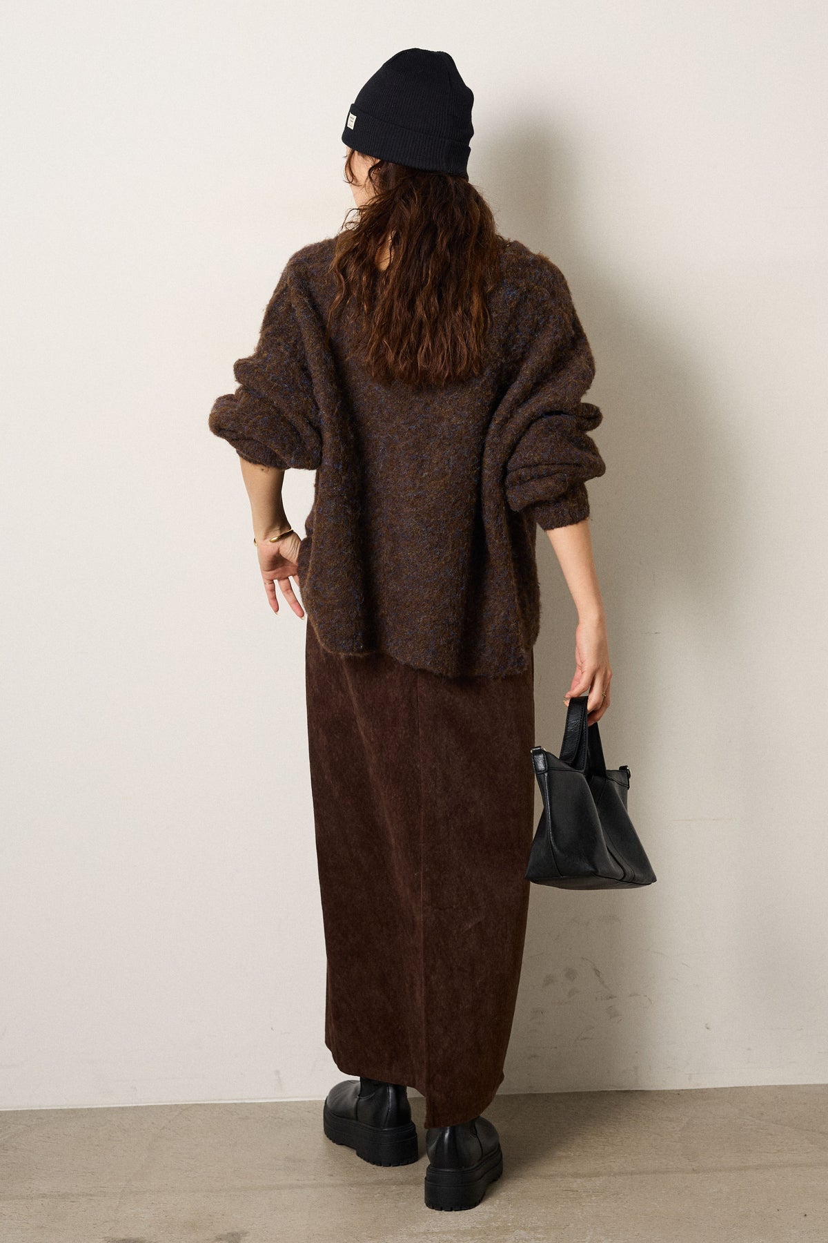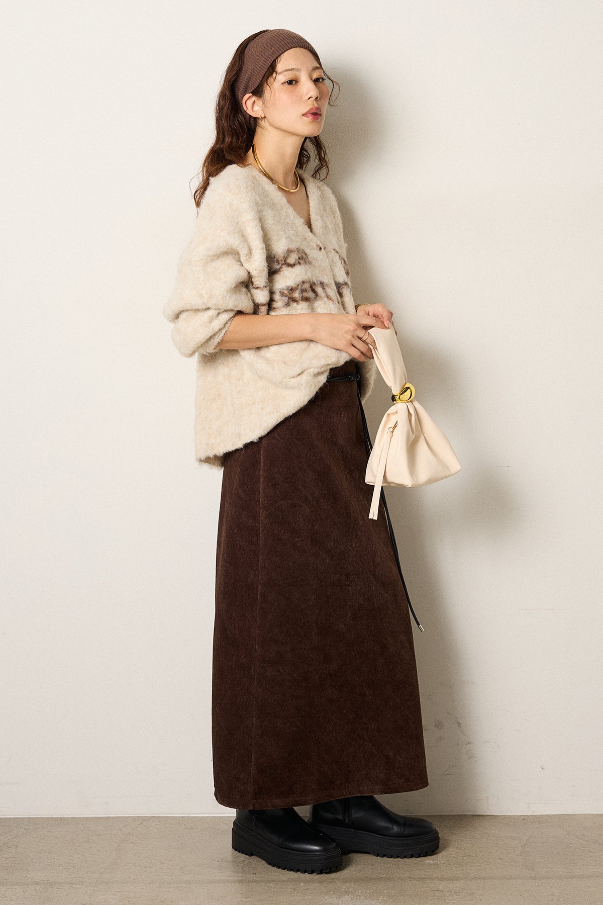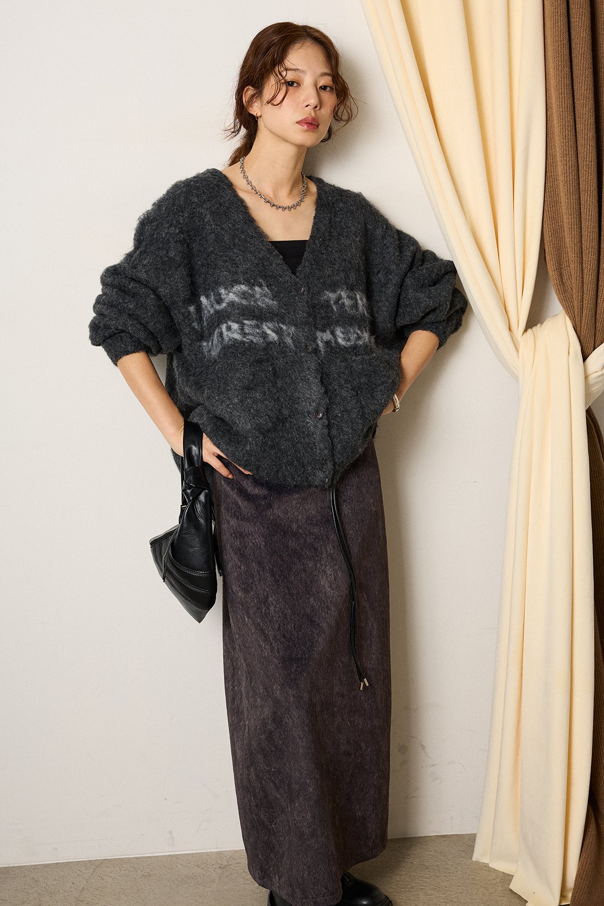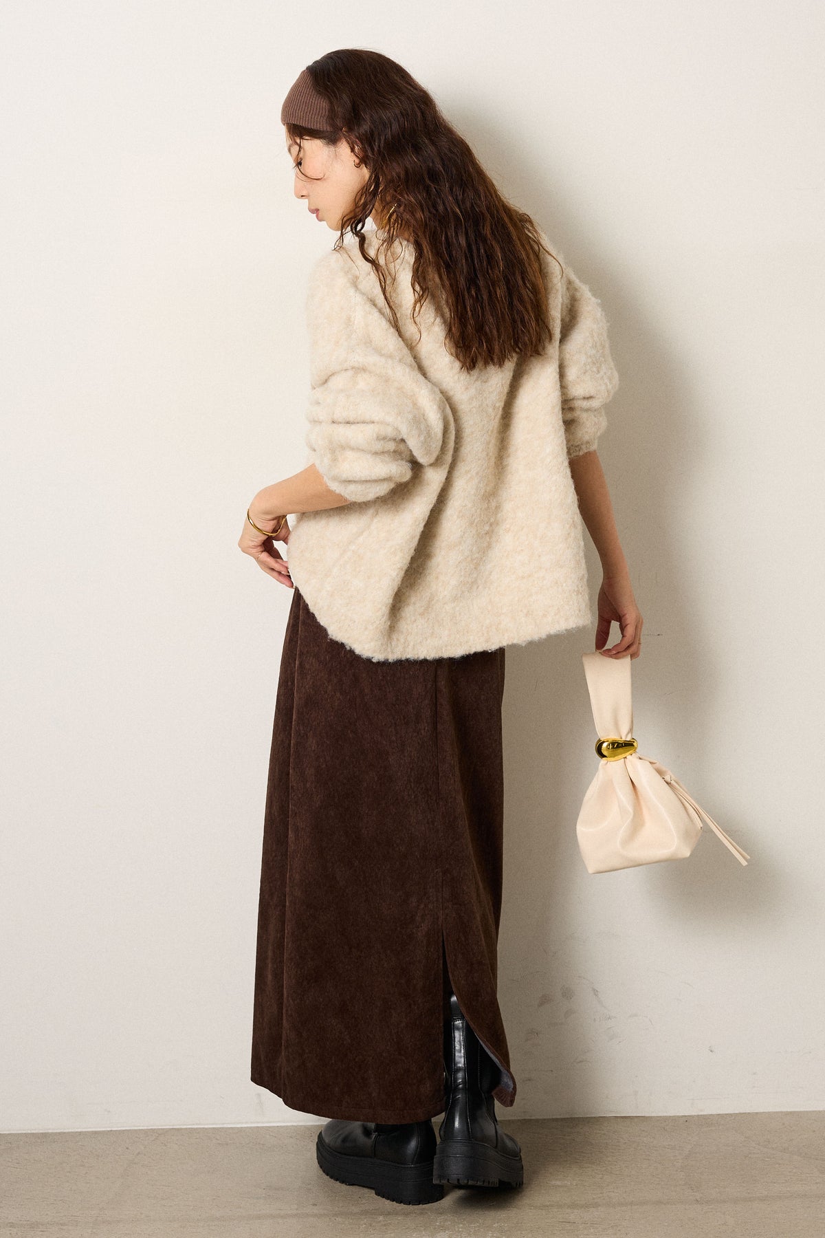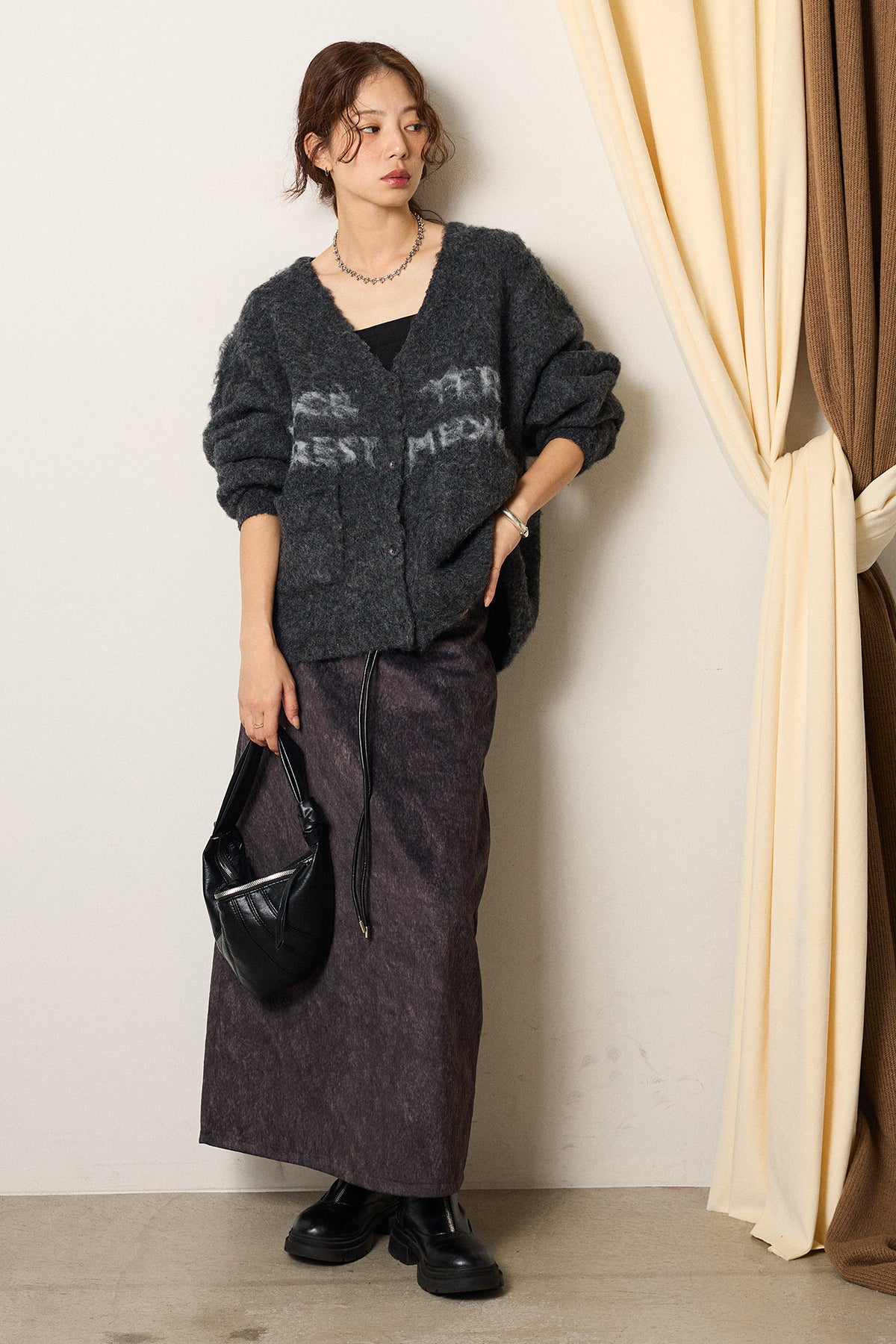 起毛感のあるスウェード調素材で、シーズンムード漂うロングスカート。 すっきりとしたストレートシルエットが美しく、付属のロープベルトがさりげないアクセントに。 柔らかな質感がスタイリングに温かみを与え、トップスをインすればメリハリのあるバランスに仕上がります。 ブーツとの相性も良く、秋冬の装いに取り入れやすい一枚です。